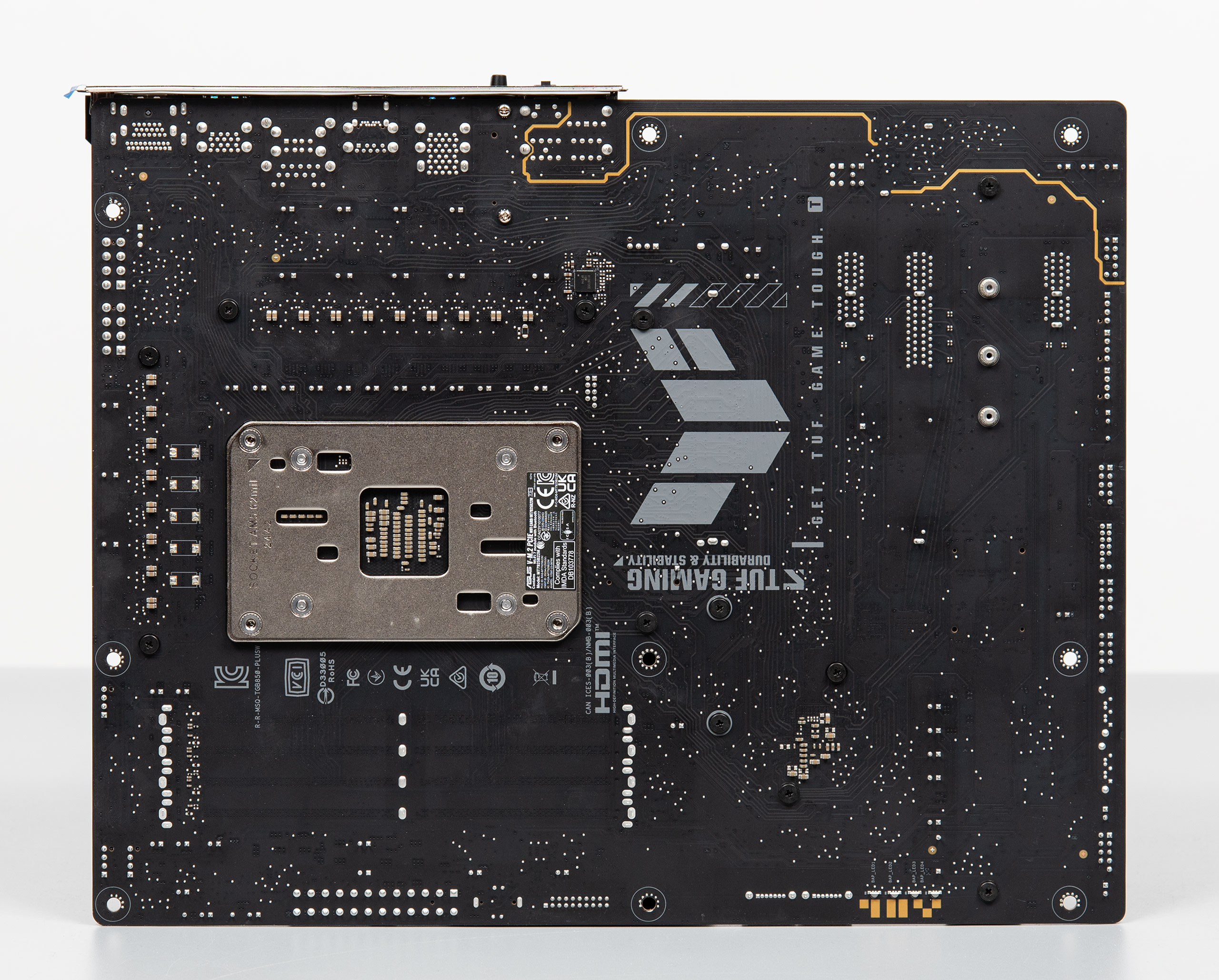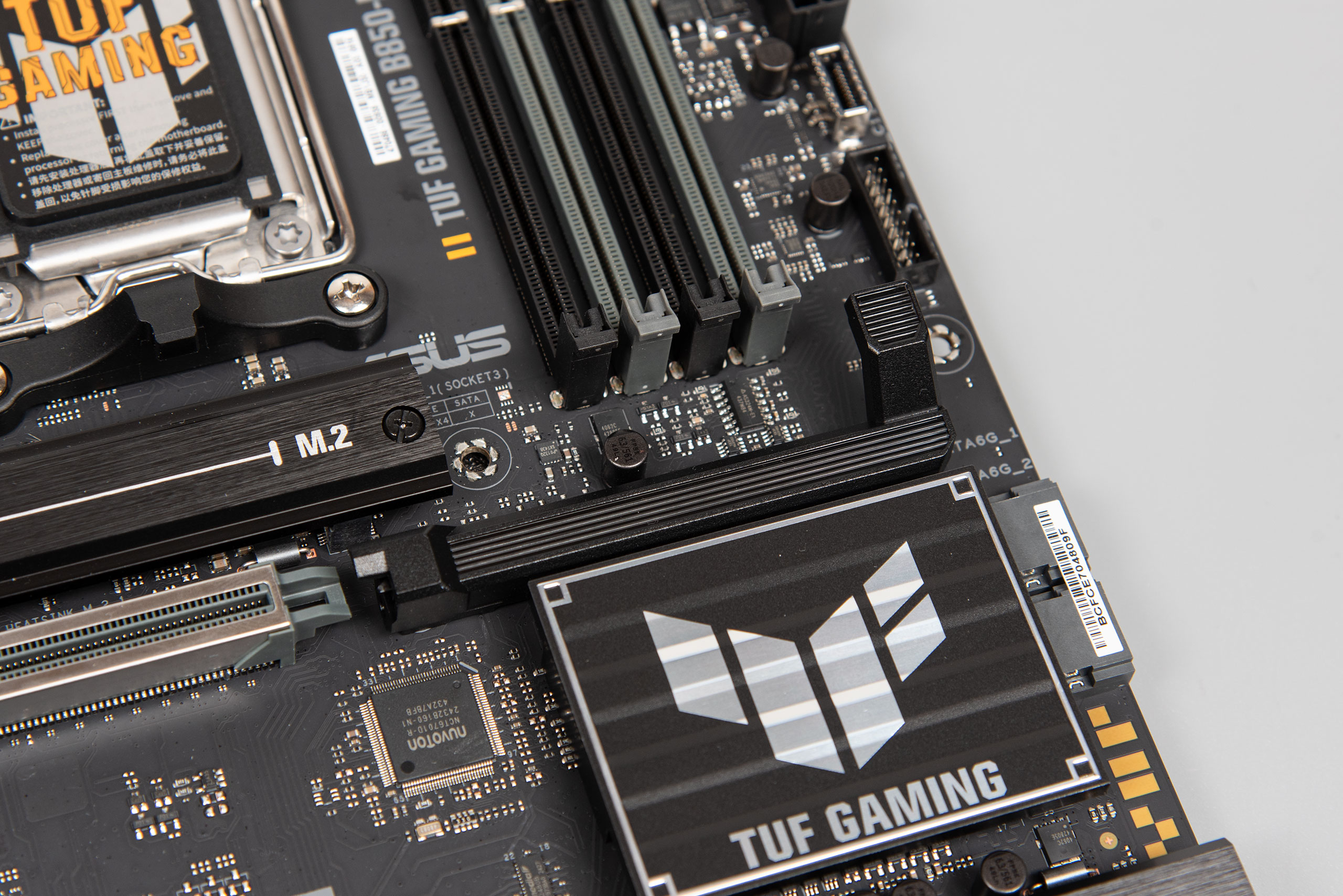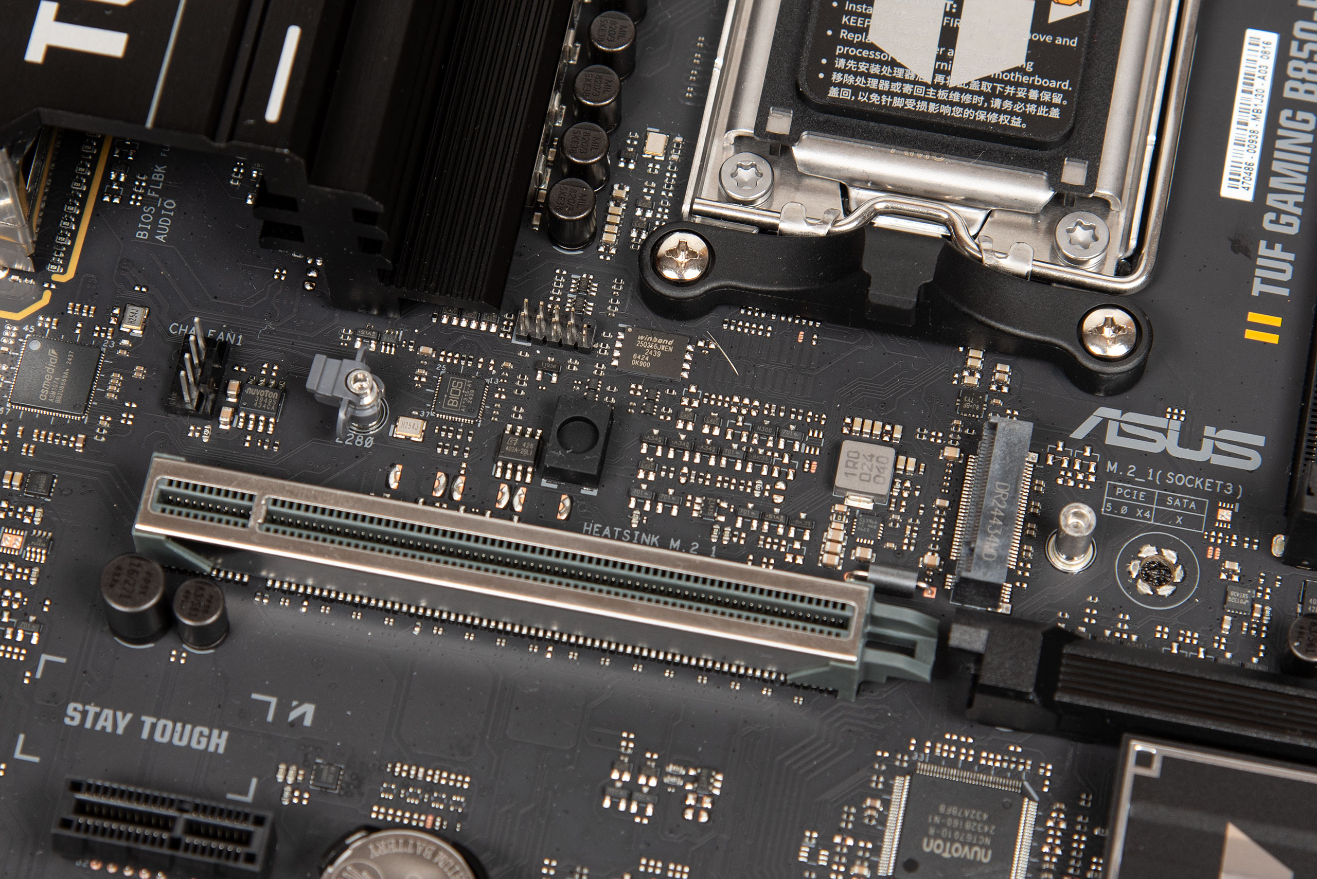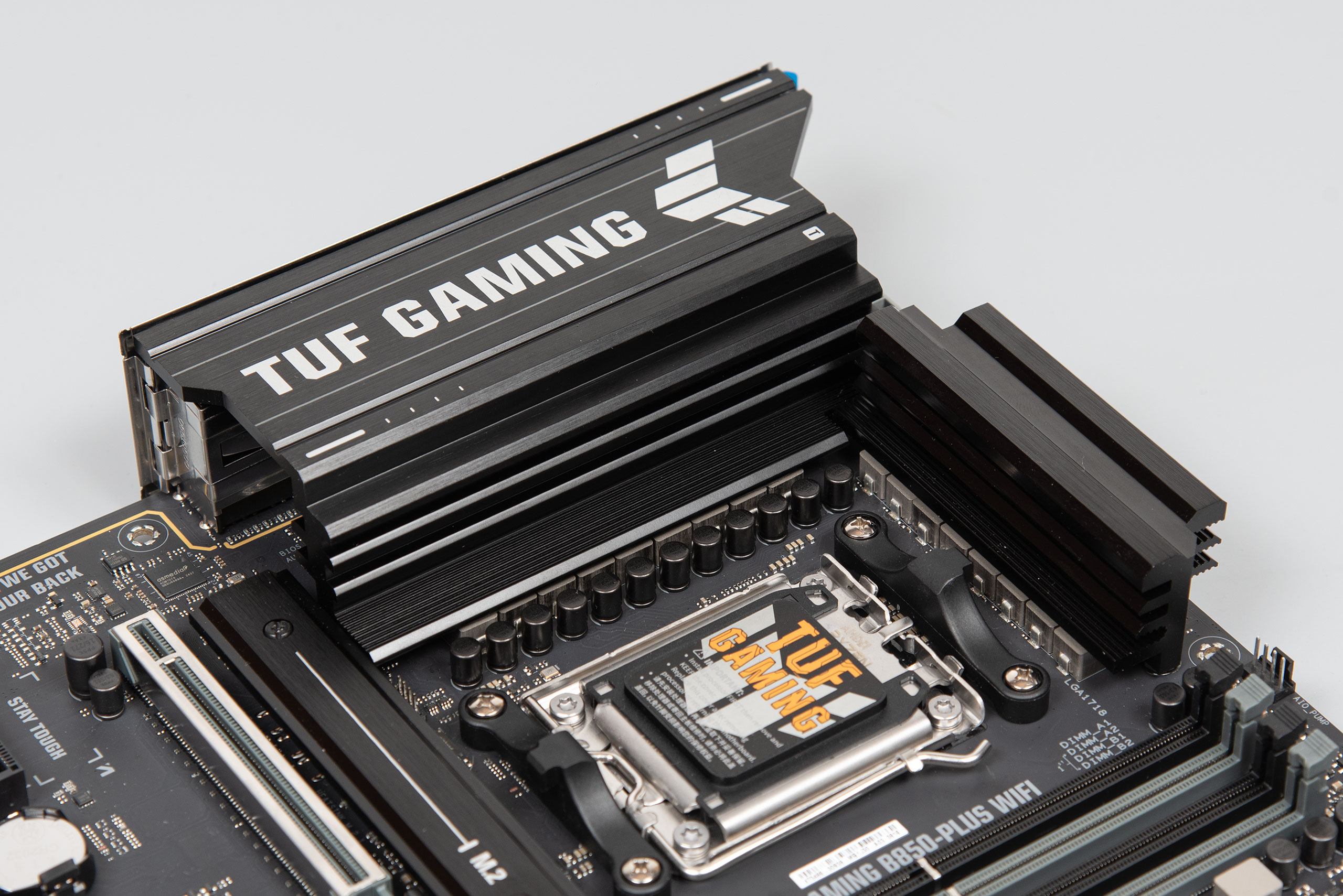В рамках чипсета AMD B850 плата виступає як продукт середнього класу. Впадає в очі великий текстовий напис TUF Gaming на радіаторі над I/O. Крім того, сам текстоліт має чимало цікавих текстів типу «Stay tough», «We got your back» та інші. Тож плата має свій власний шарм в темній колірній гамі з нотками помаранчевого. Зверніть увагу, що один з радіаторів системи охолодження VRM розширено до зони I/O.