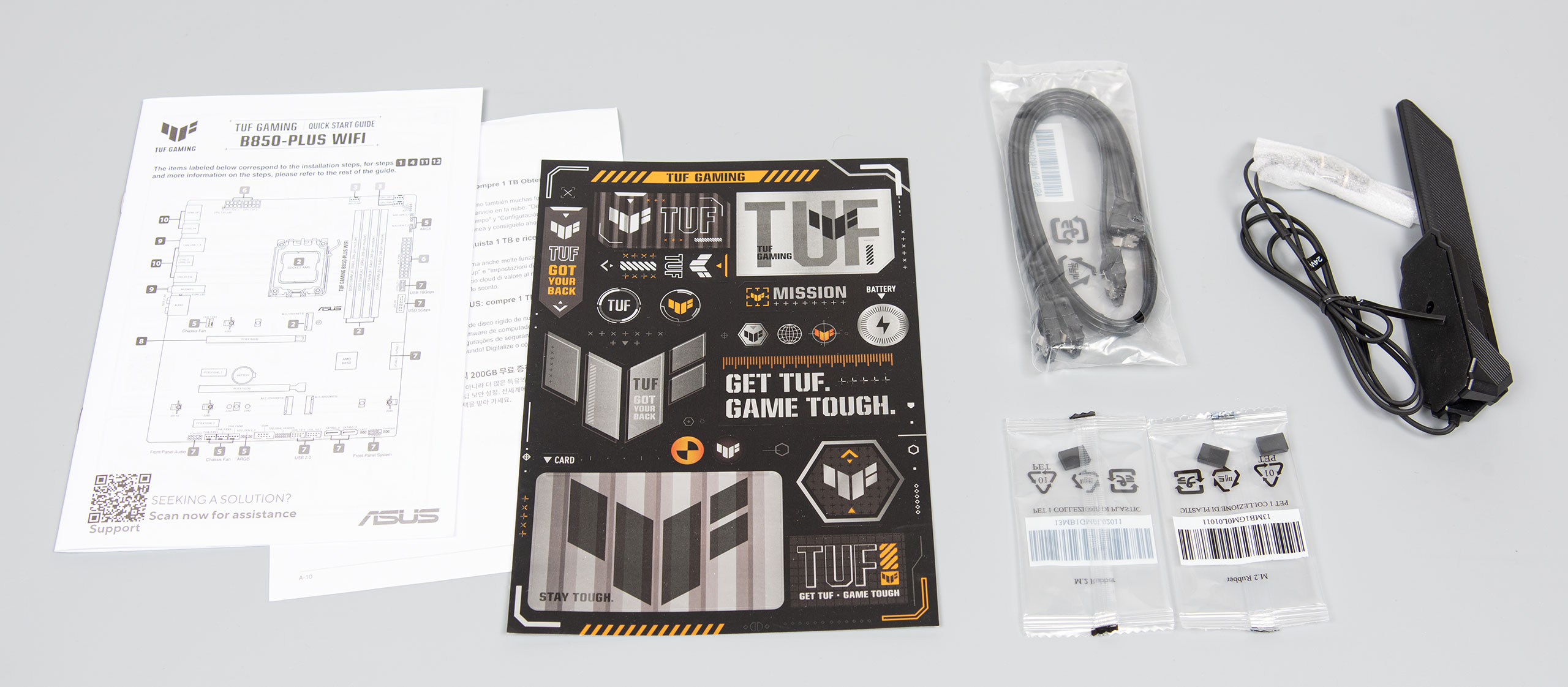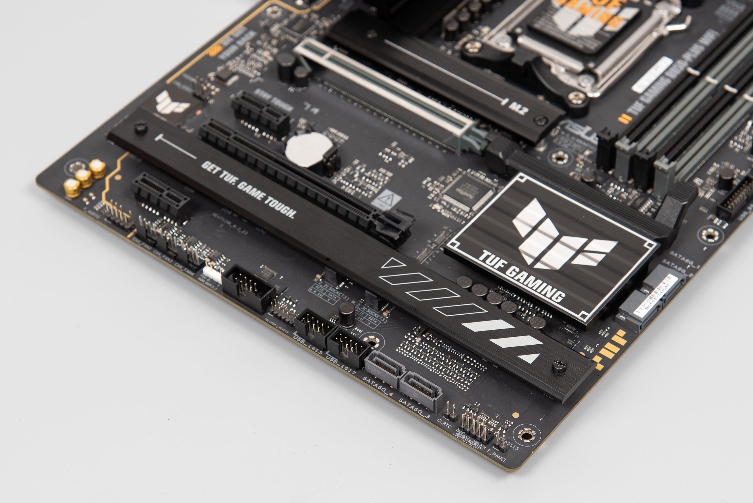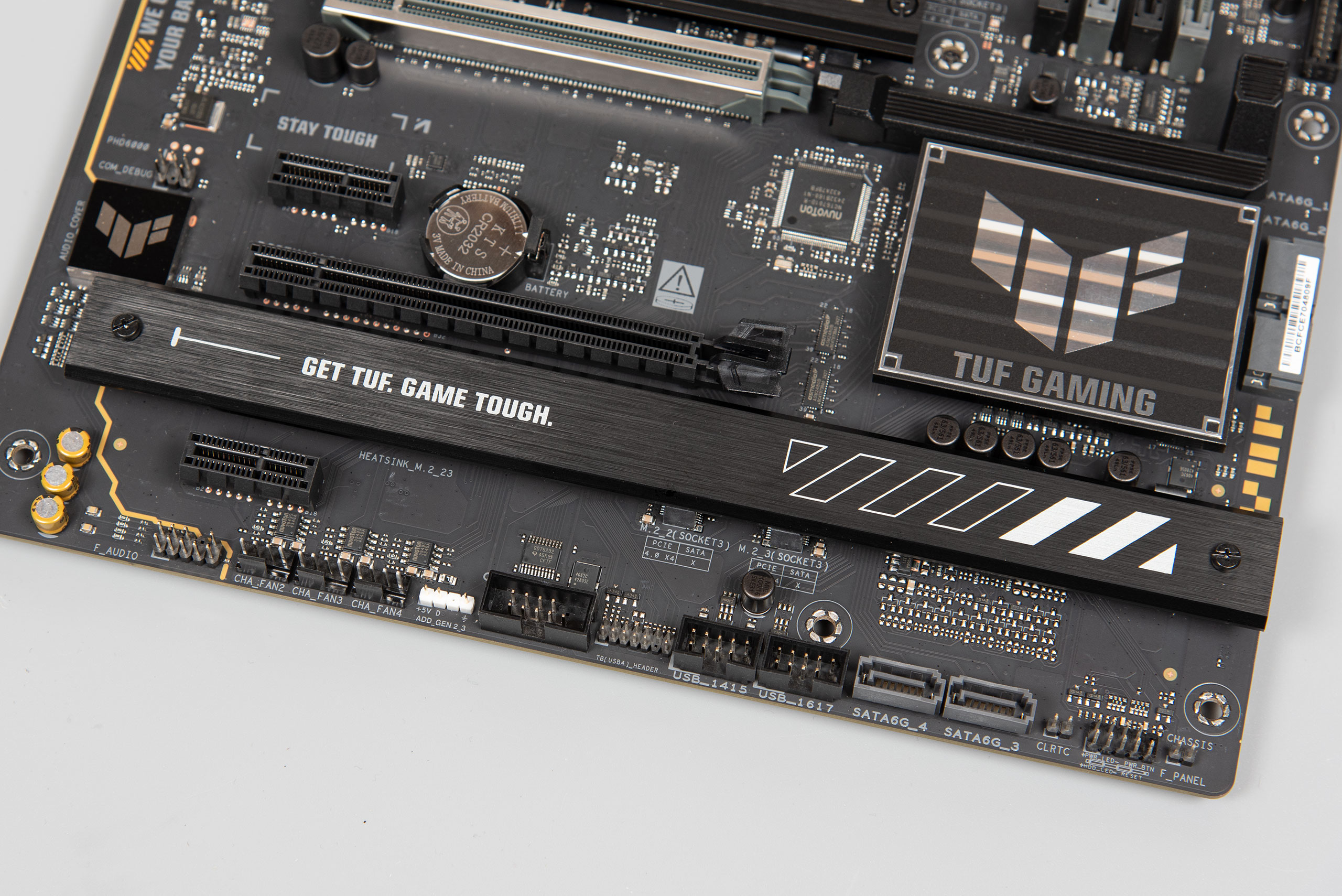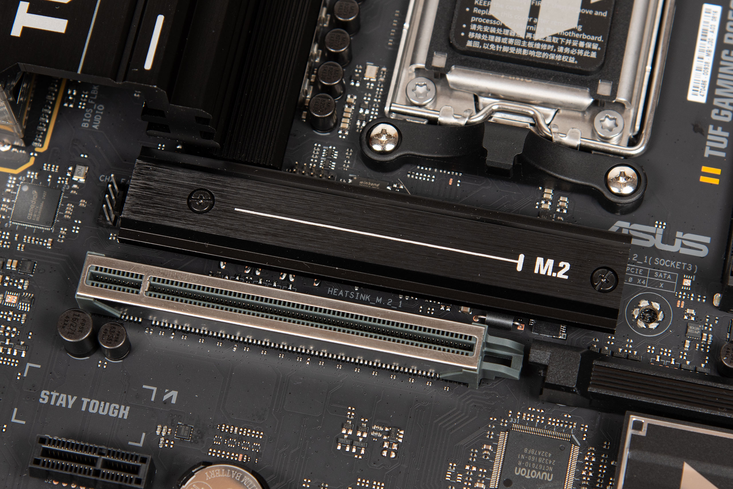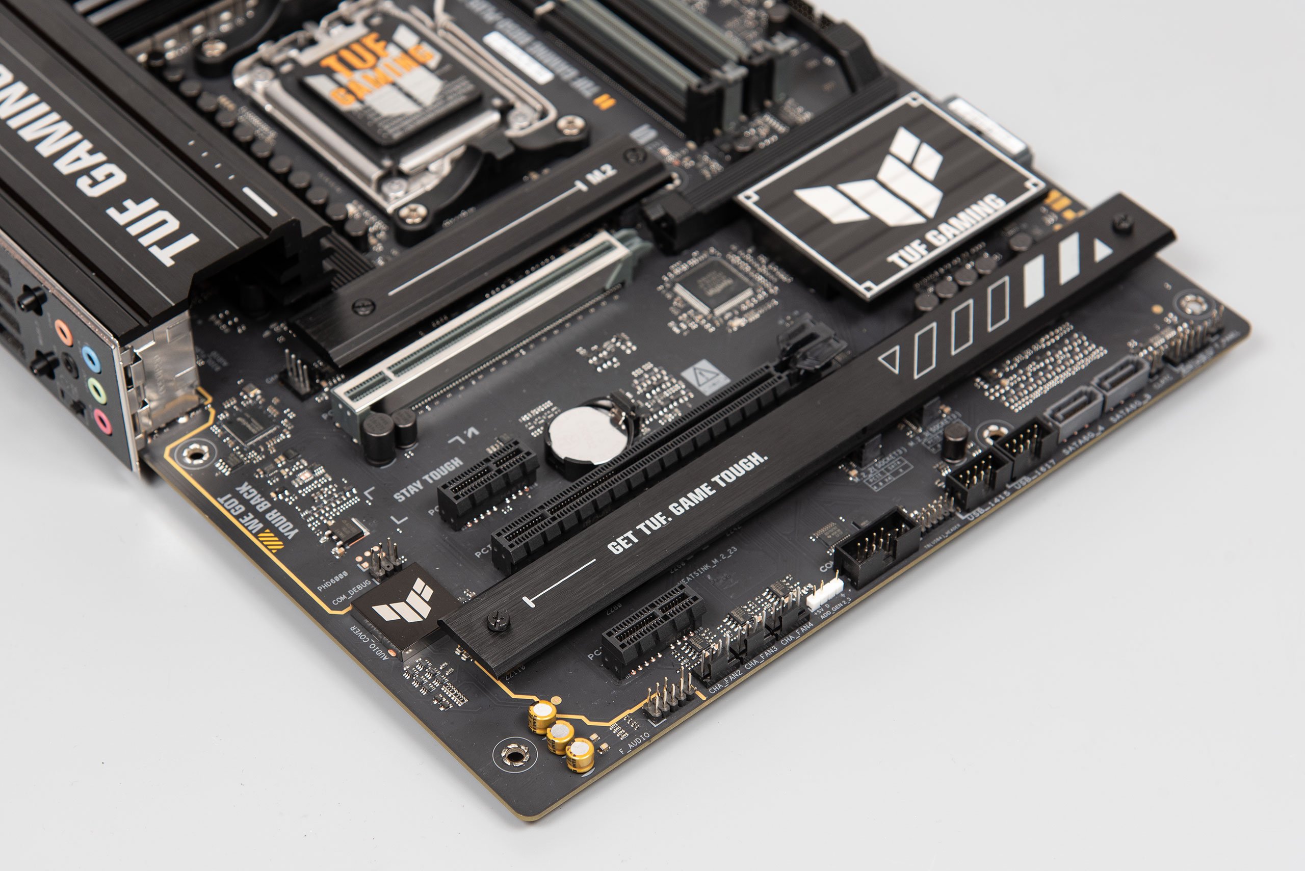 В рамках чипсета AMD B850 плата виступає як продукт середнього класу. Впадає в очі великий текстовий напис TUF Gaming на радіаторі над I/O. Крім того, сам текстоліт має чимало цікавих текстів типу «Stay tough», «We got your back» та інші. Тож плата має свій власний шарм в темній колірній гамі з нотками помаранчевого. Зверніть увагу, що один з радіаторів системи охолодження VRM розширено до зони I/O.