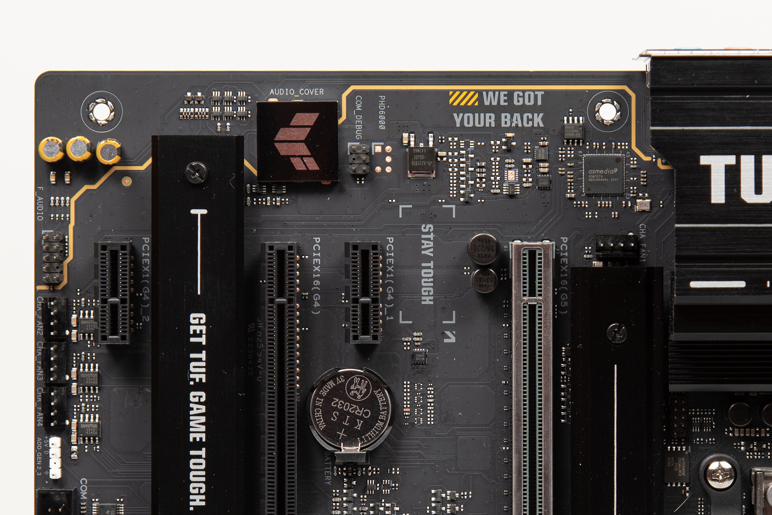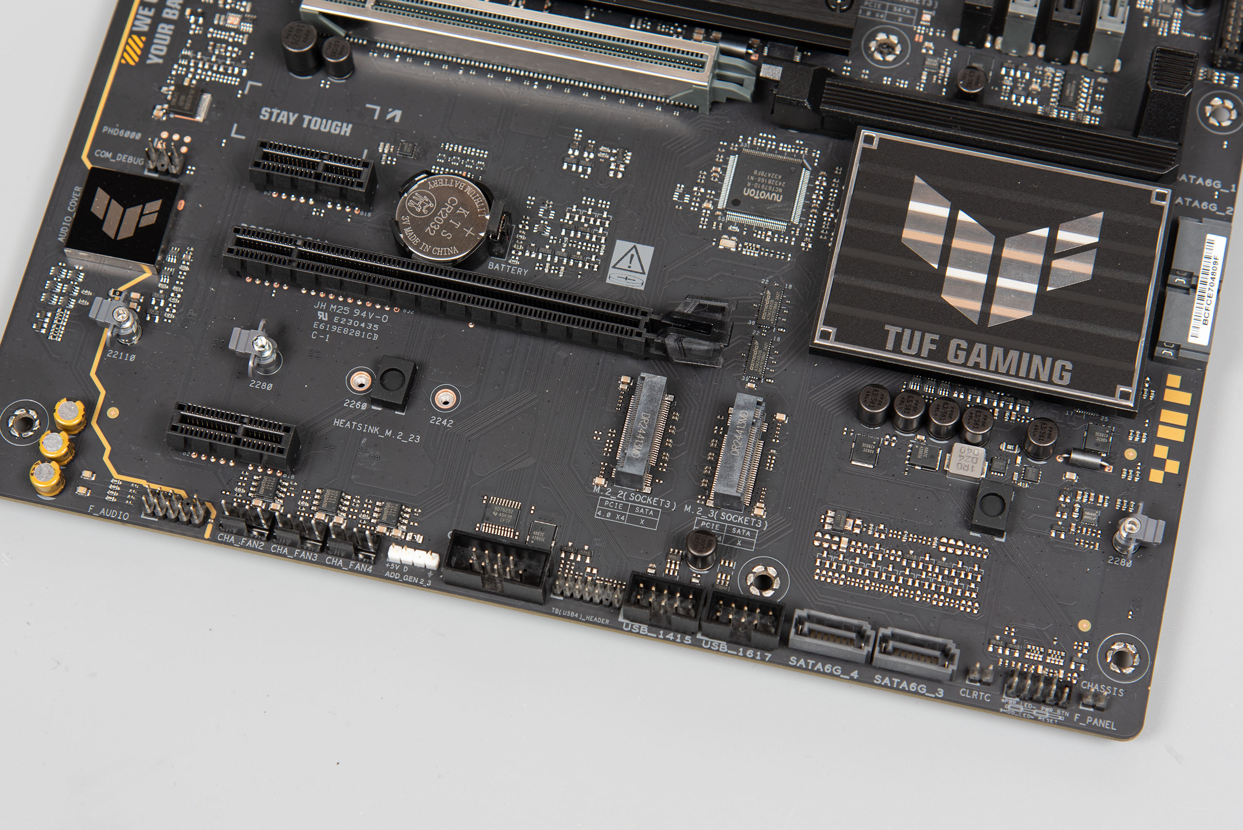 Переходимо до контактних груп та інтерфейсів. Біля зони I/O присутній конектор вентилятора. Батарейка CMOS знаходиться праворуч від першого слота розширення PCIe x1, тож збереже пряму доступність при використанні відеокарти (або іншого пристрою) висотою не більше двох слотів включно. Біля лівого краю знаходиться COM_DEBUG. Знизу ліворуч розташовано традиційну контактну групу HD_AUDIO, три конектори вентиляторів, один конектор ADD_GEN2 (RGB 5V), контактну групу COM, TB_Header для підключення зовнішніх карт розширення Thunderbolt (USB4).