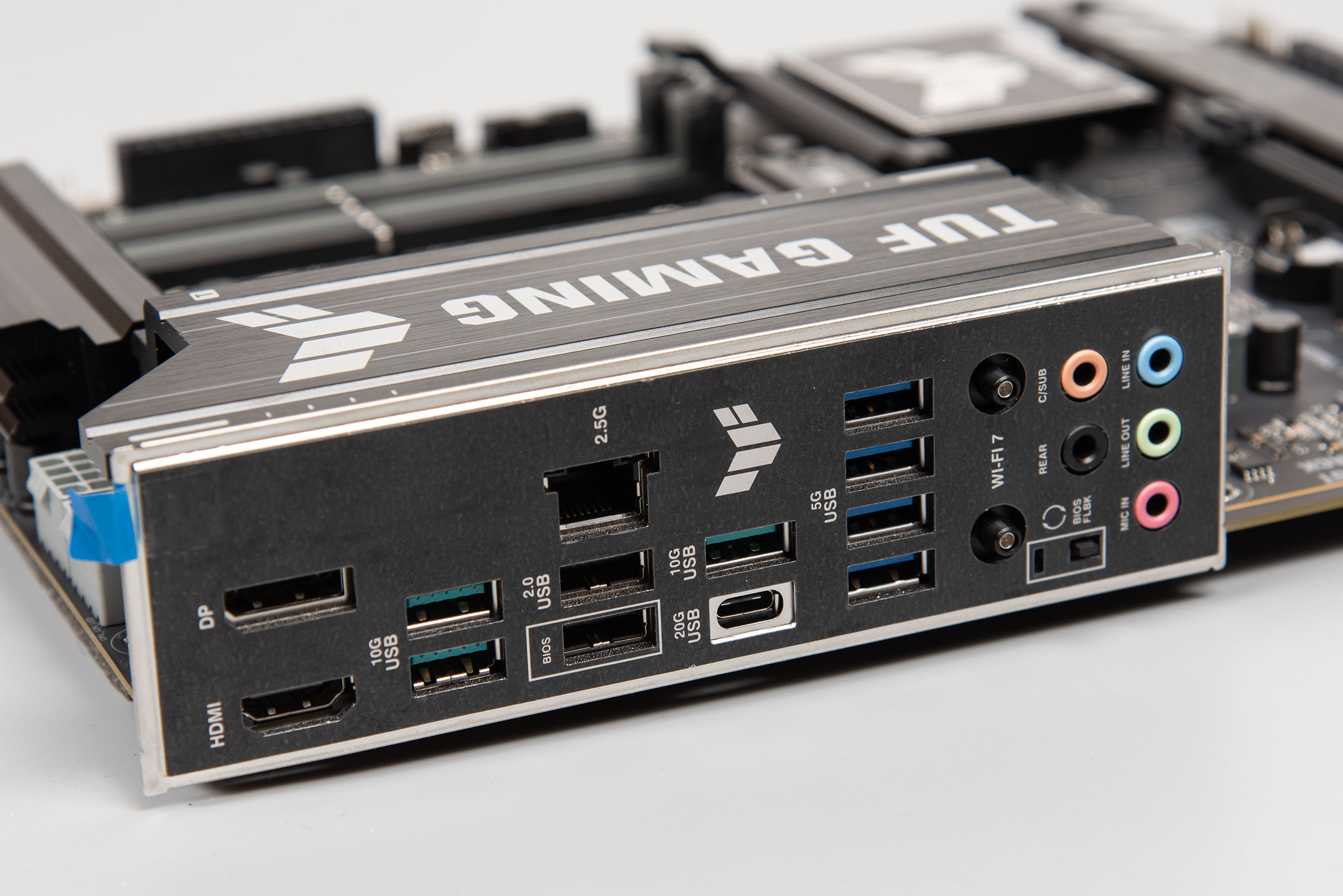 I/O‑панель вже має встановлену заглушку. З нетипового тут знаходяться кнопка запуску функції BIOS_FLASHBACK, та її індикатор активності. Арсенал традиційного: