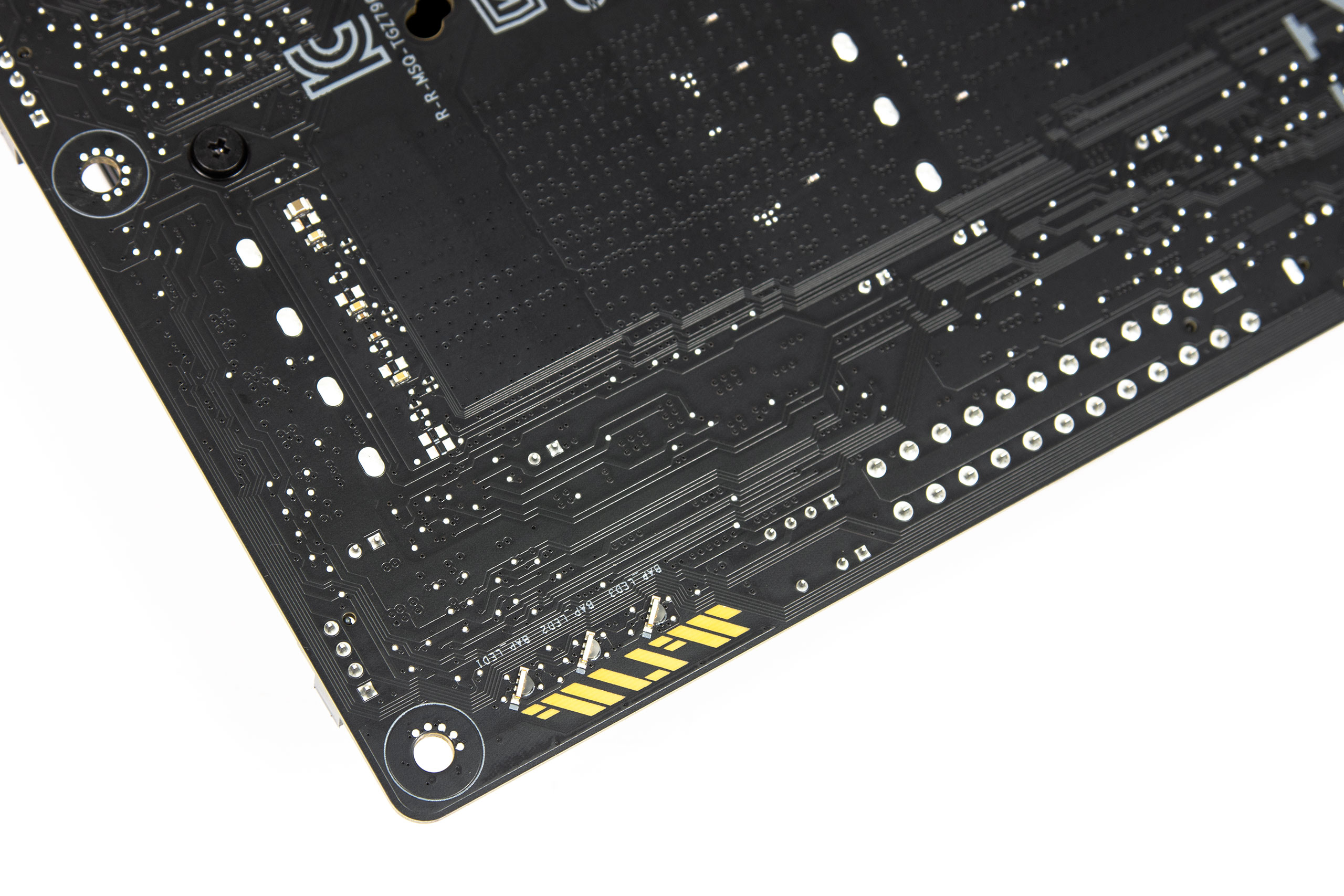 Зверху розташовано три 4-контактні конектори вентиляторів, а також контактні групи ADD_GEN_2 (RGB 5V), та AURA_RGB_HEADER (RGB 12V). Біля слотів ОЗП зверху знаходиться діагностична зона Q-LED, що показує прогрес проходження POST за допомогою світлодіодів.