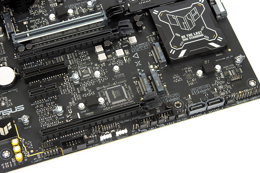 Внизу ліворуч знаходяться вивід F_AUDIO (HD_AUDIO), конектор корпусного вентилятора, контактна група COM-порту, Thunderbolt 4, два USB 2.0, два ADD_GEN_2 (RGB 5V) та CLRTC (CLEAR_CMOS).