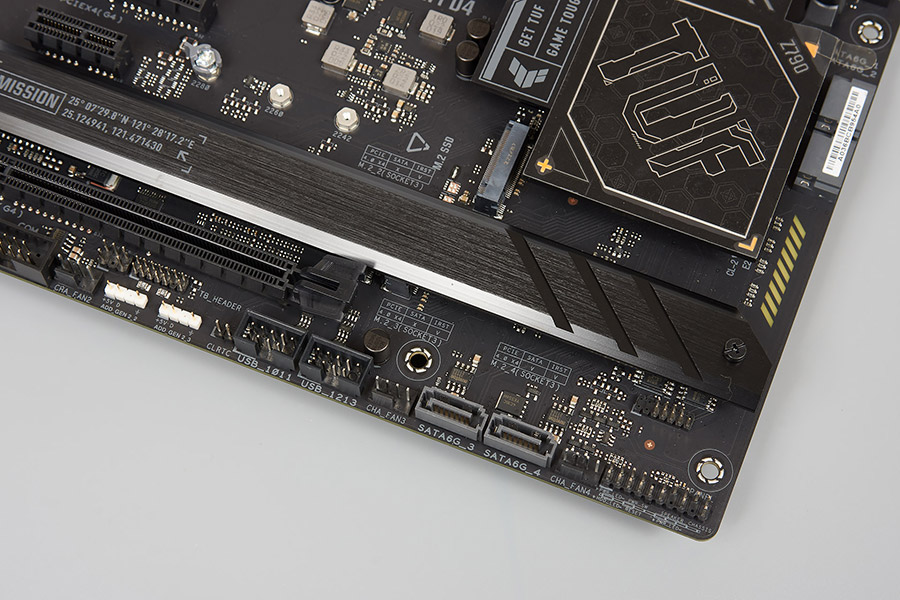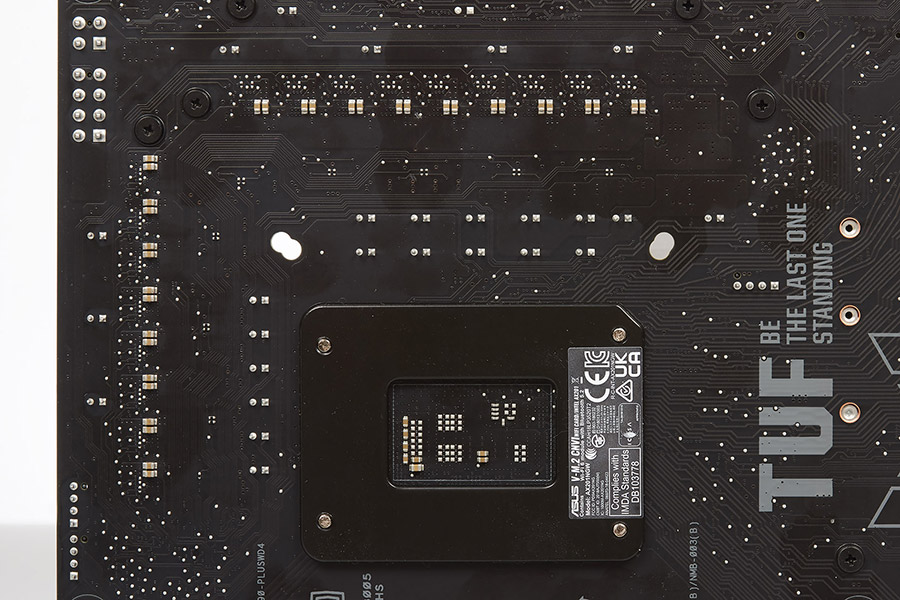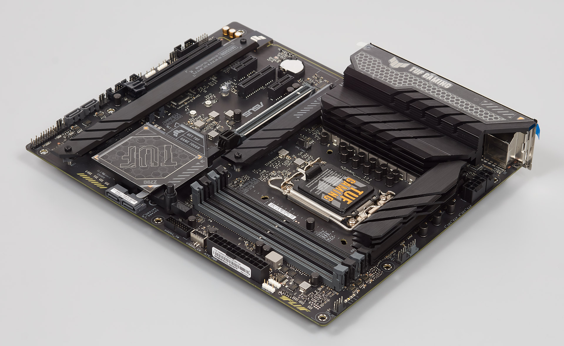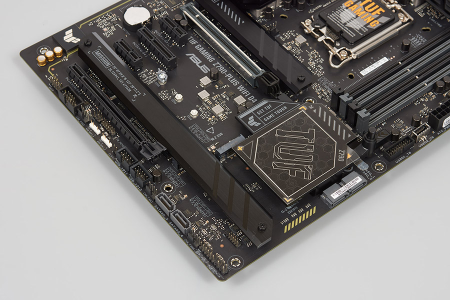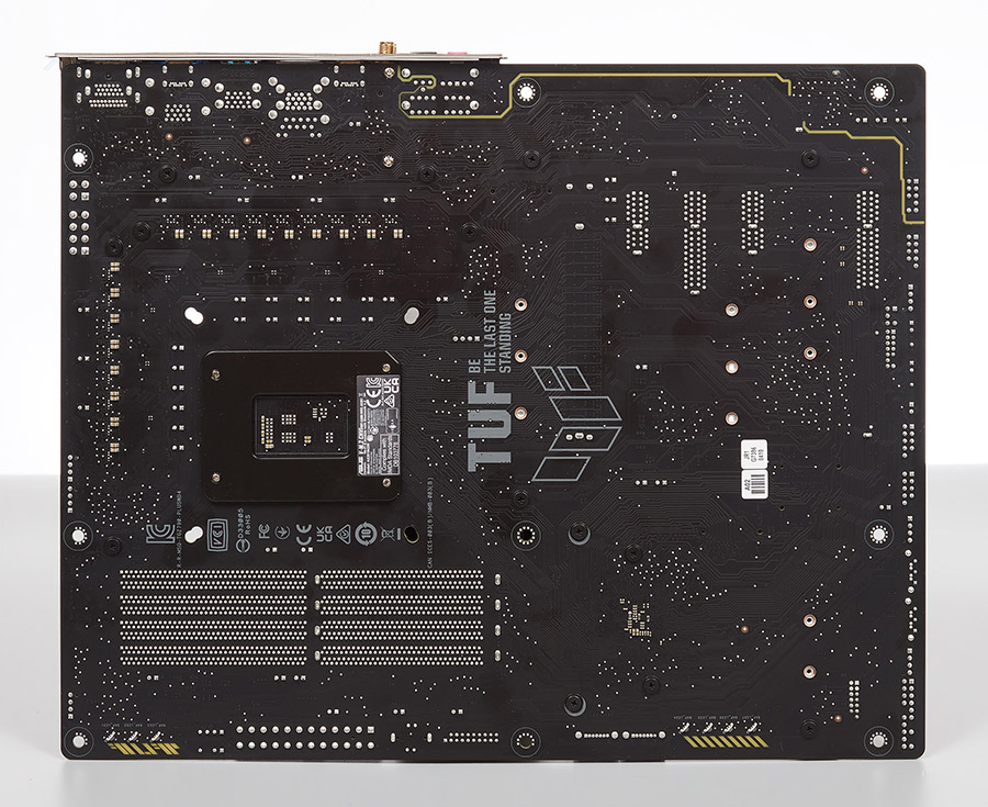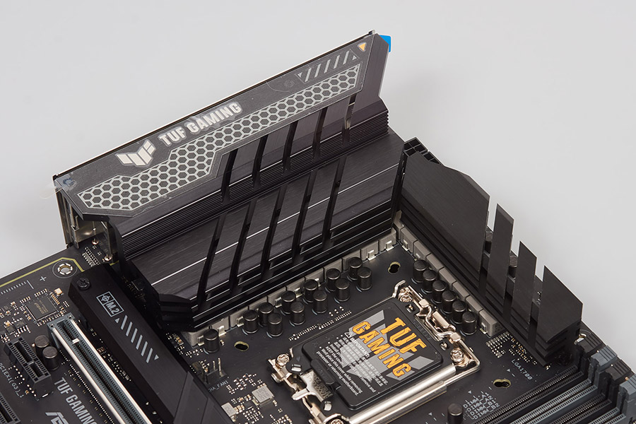 Як і всі плати сучасної серії TUF ця не має ніякого кожуха, а текстоліт прикриває система охолодження зони VRM та чипсету, та декілька радіаторів накопичувачів M.2.
