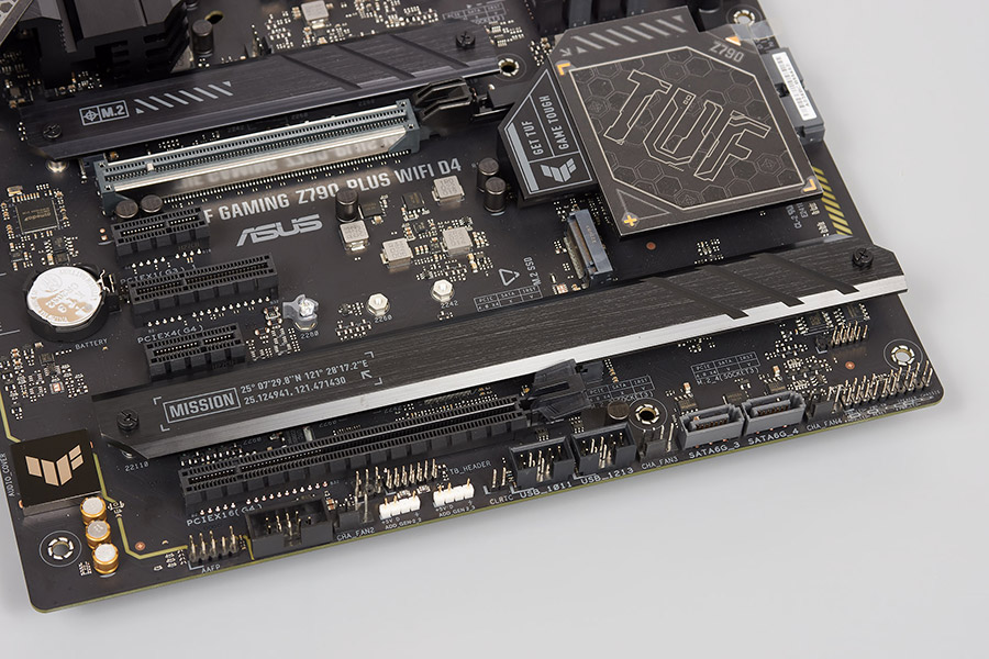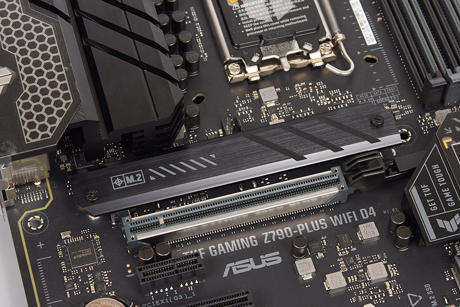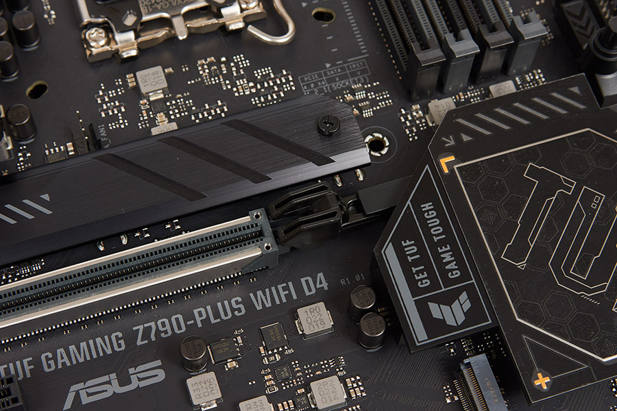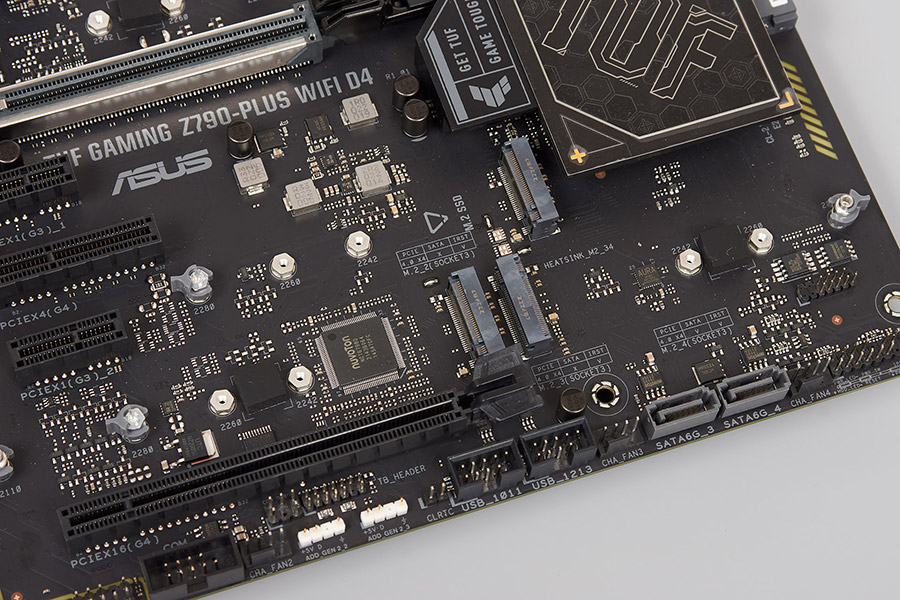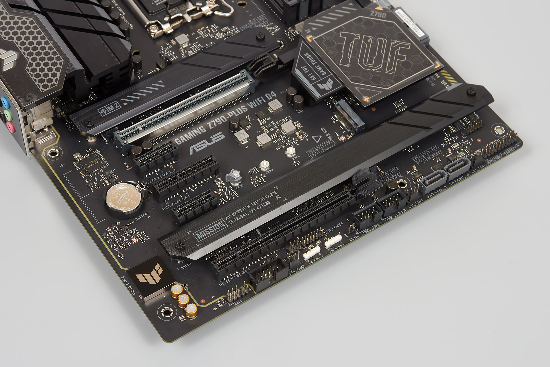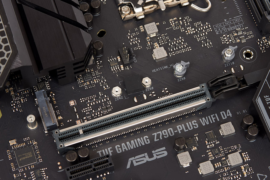 На відміну від топових продуктів, TUF Z790-Plus WIFI D4 дозволяє встановити п’ять карт розширення PCI Express: одну графічну PCIe 5.0 x16, одну PCIe 4.0 x4, ще одну PCIe 4.0 x16@4, та дві PCIe 3.0 x1. Цієї кількості достатньо для збирання систем різної конфігурації.