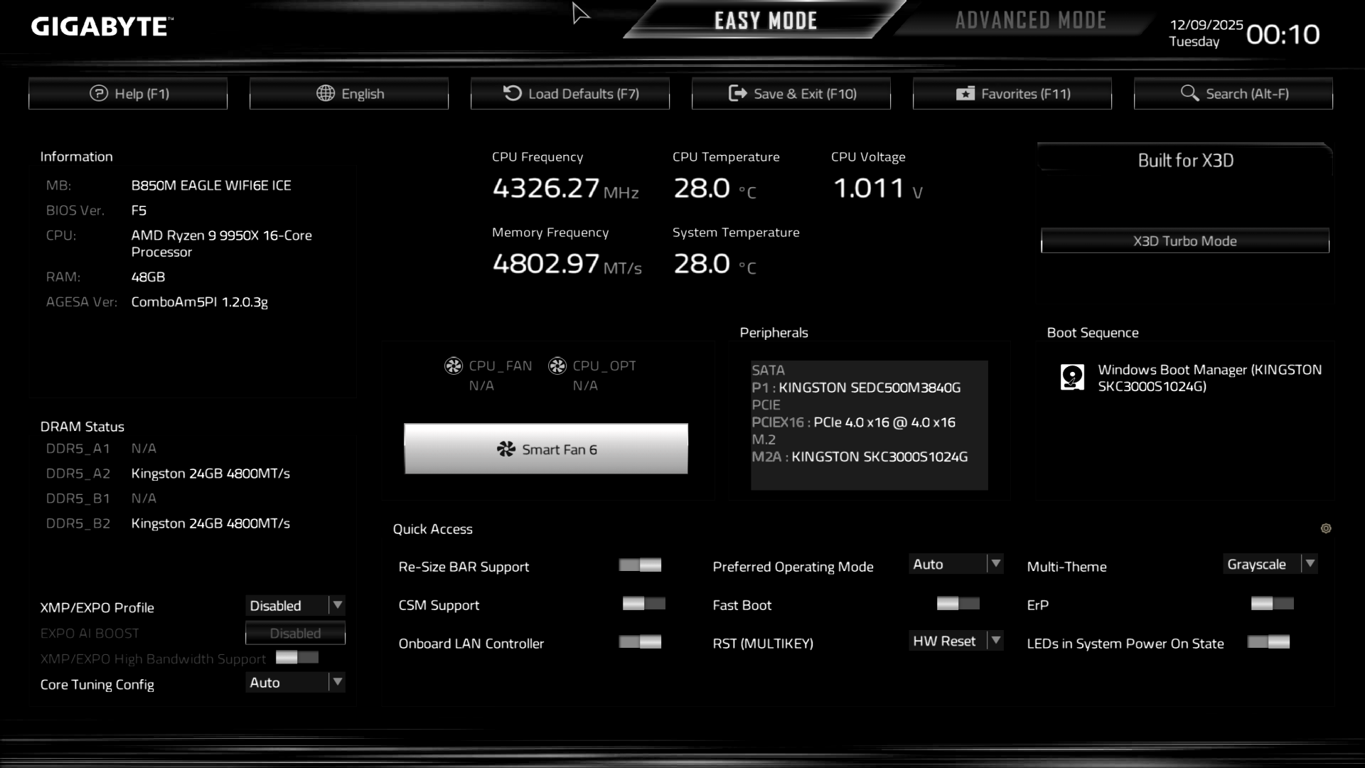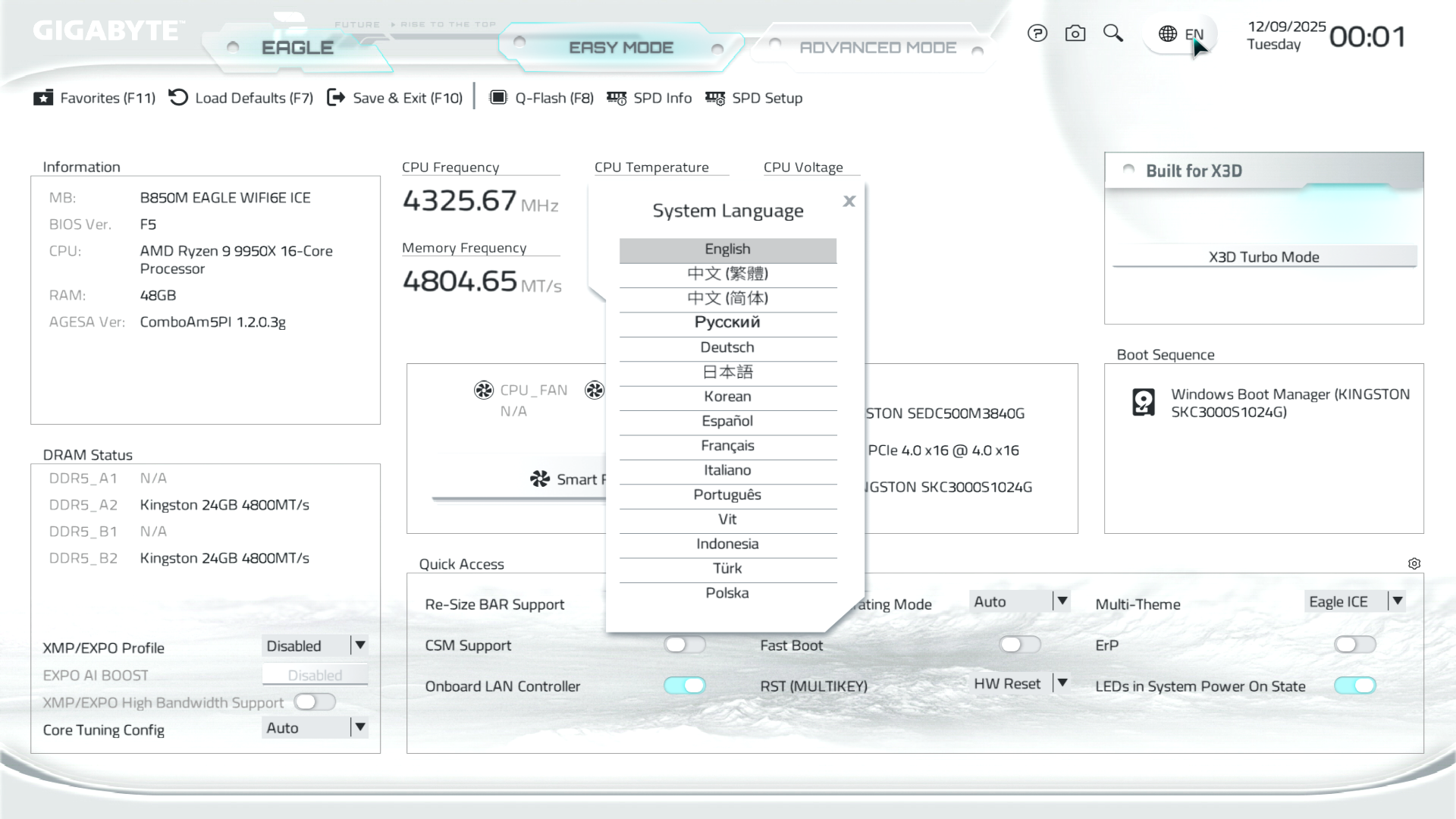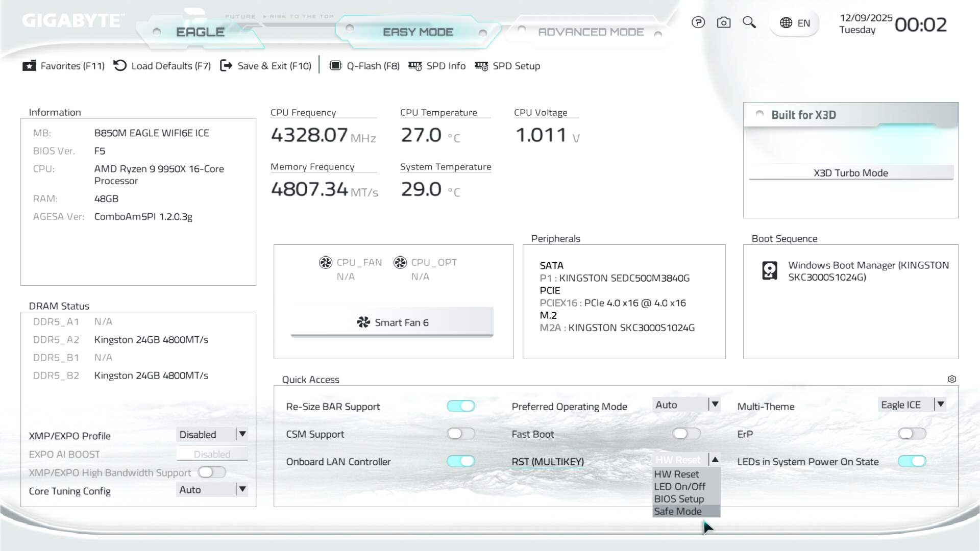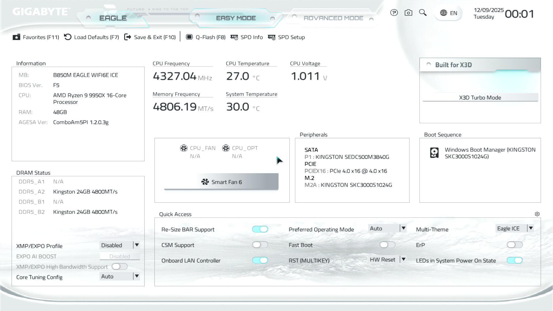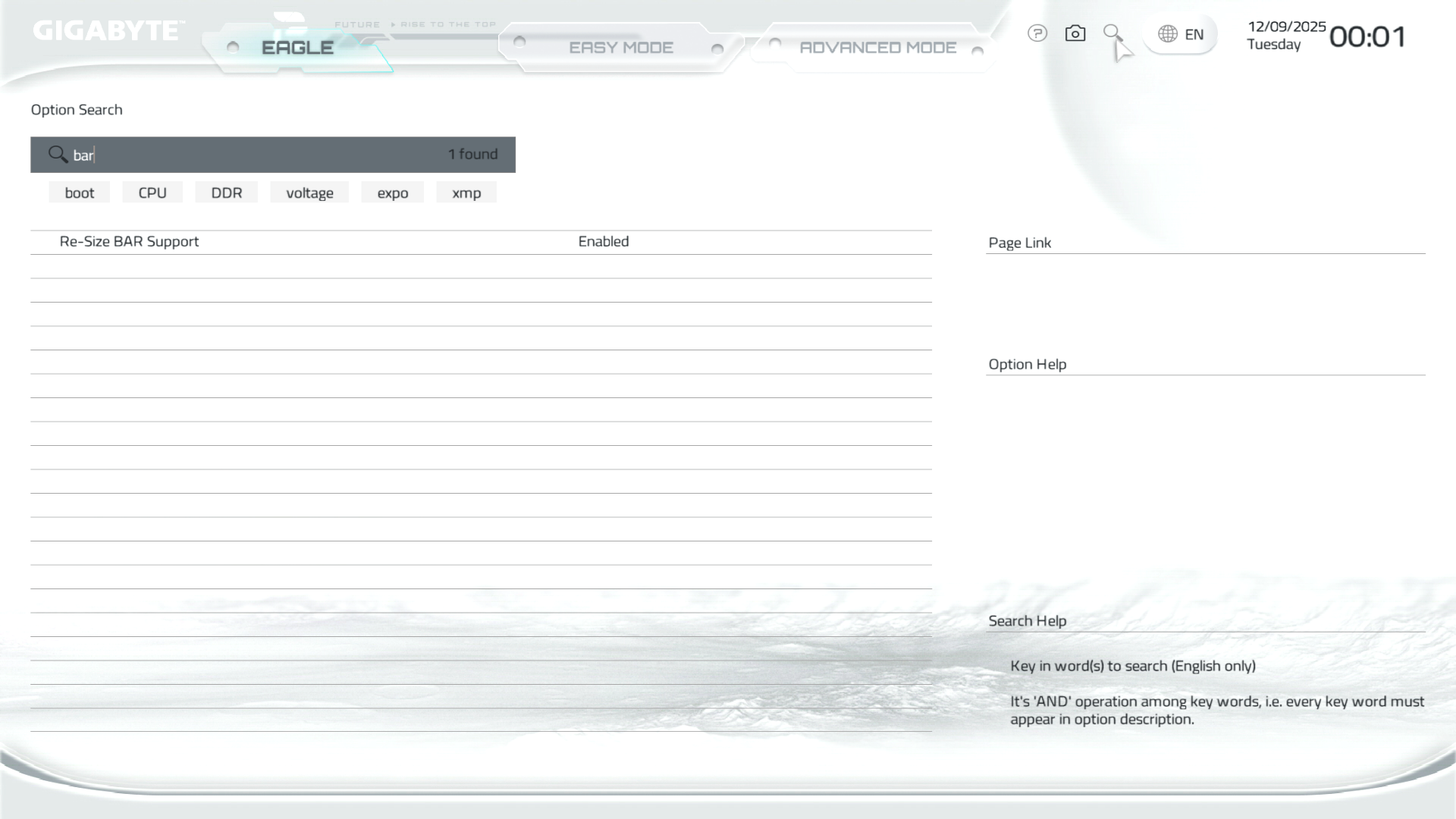 B850M Eagle WiFi6E ICE керується фірмовим UC BIOS, що передбачає два варіанти відображення налаштувань: Advanced Mode й Easy Mode.