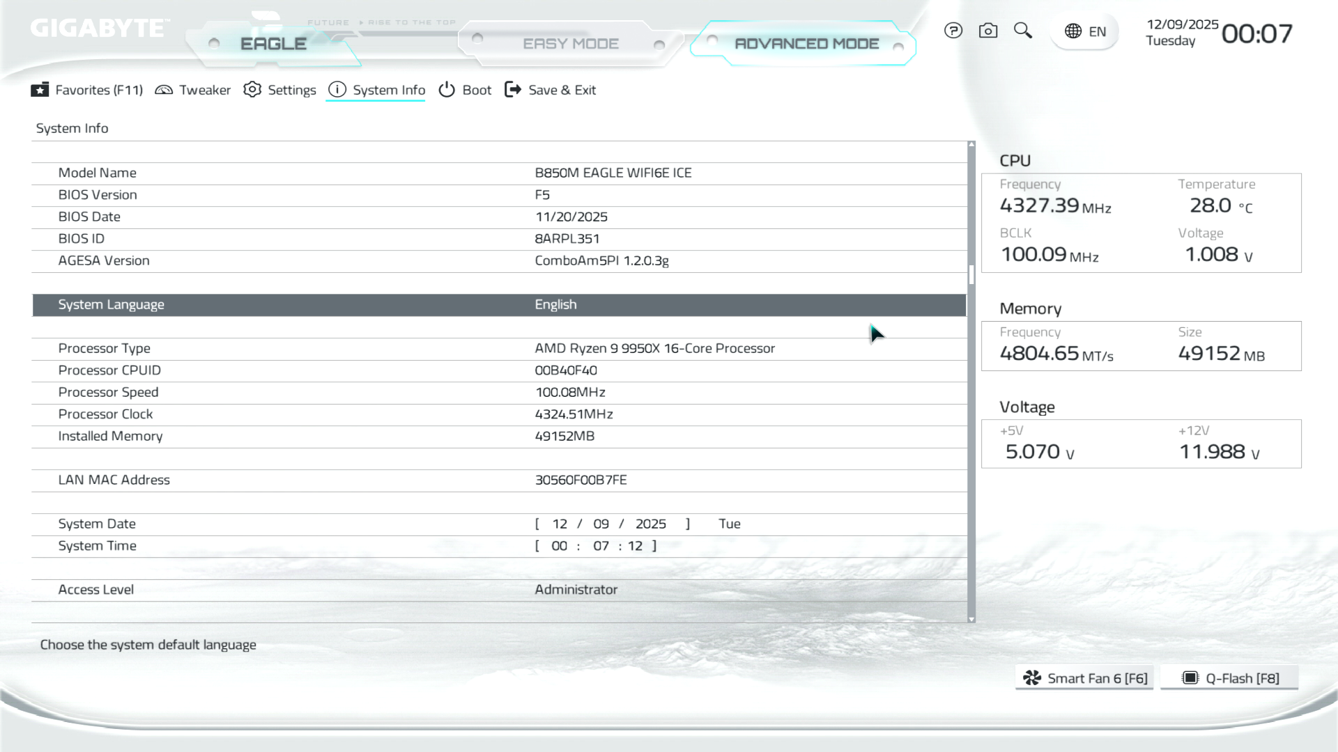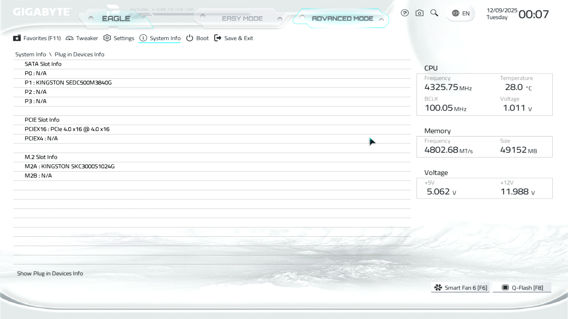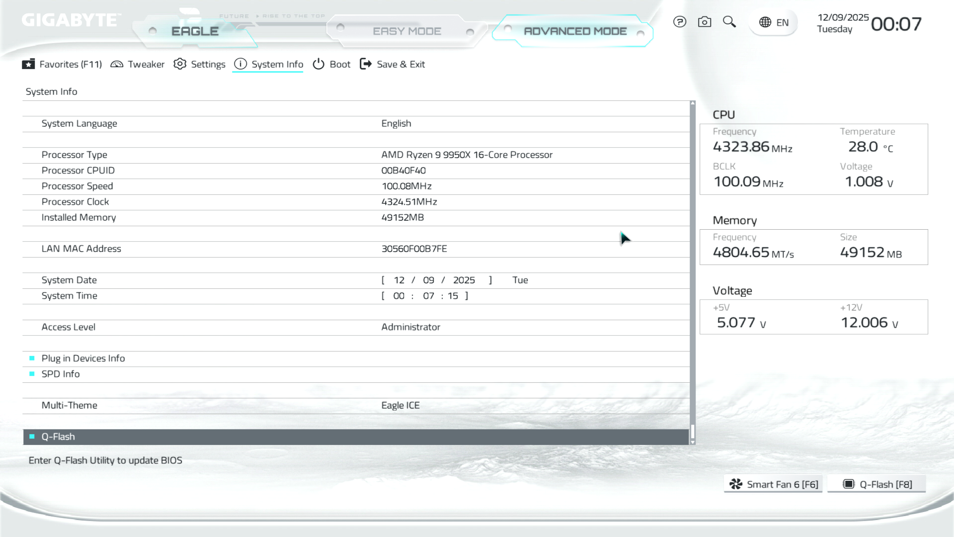Меню System Info надає звіт по ключових параметрах системи. Тут можна встановити дату, вказати мову інтерфейсу, змінити оформлення теми, вказати режим роботи POST-дисплея, викликати Q‑Flash для оновлення прошивки, ну і звісно ж подивитись на підключені пристрої та їх режими роботи в рамках материнської плати.