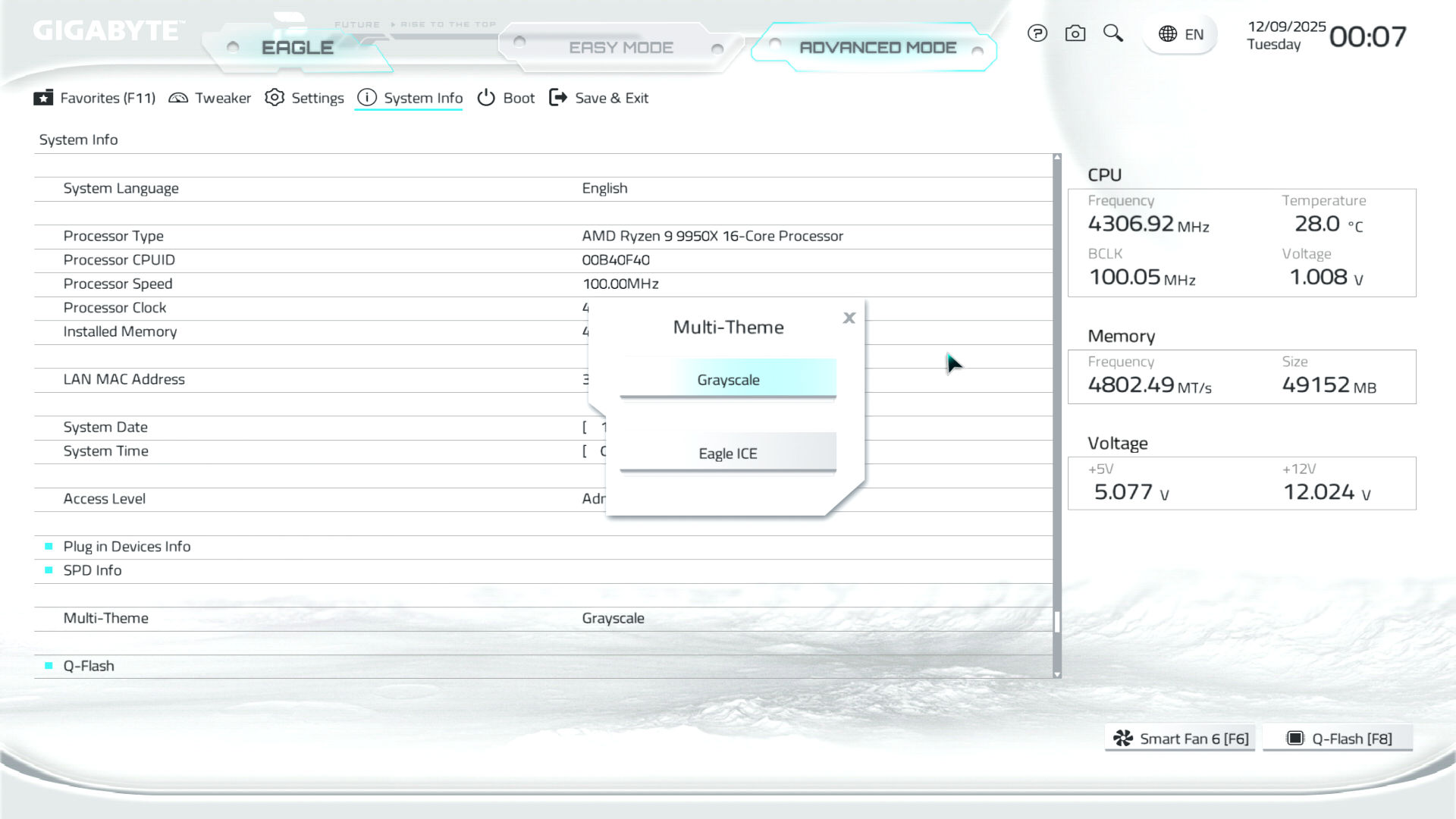 Якщо у читача раптово очі на лоба вилізли від яскравості фабричного оформлення інтерфейсу UEFI — не переймайтесь, у виробника є в наявності такий собі «dark mode» під назвою Grayscale (його можна обрати в меню System Info в інтерфейсі Advanced Mode).