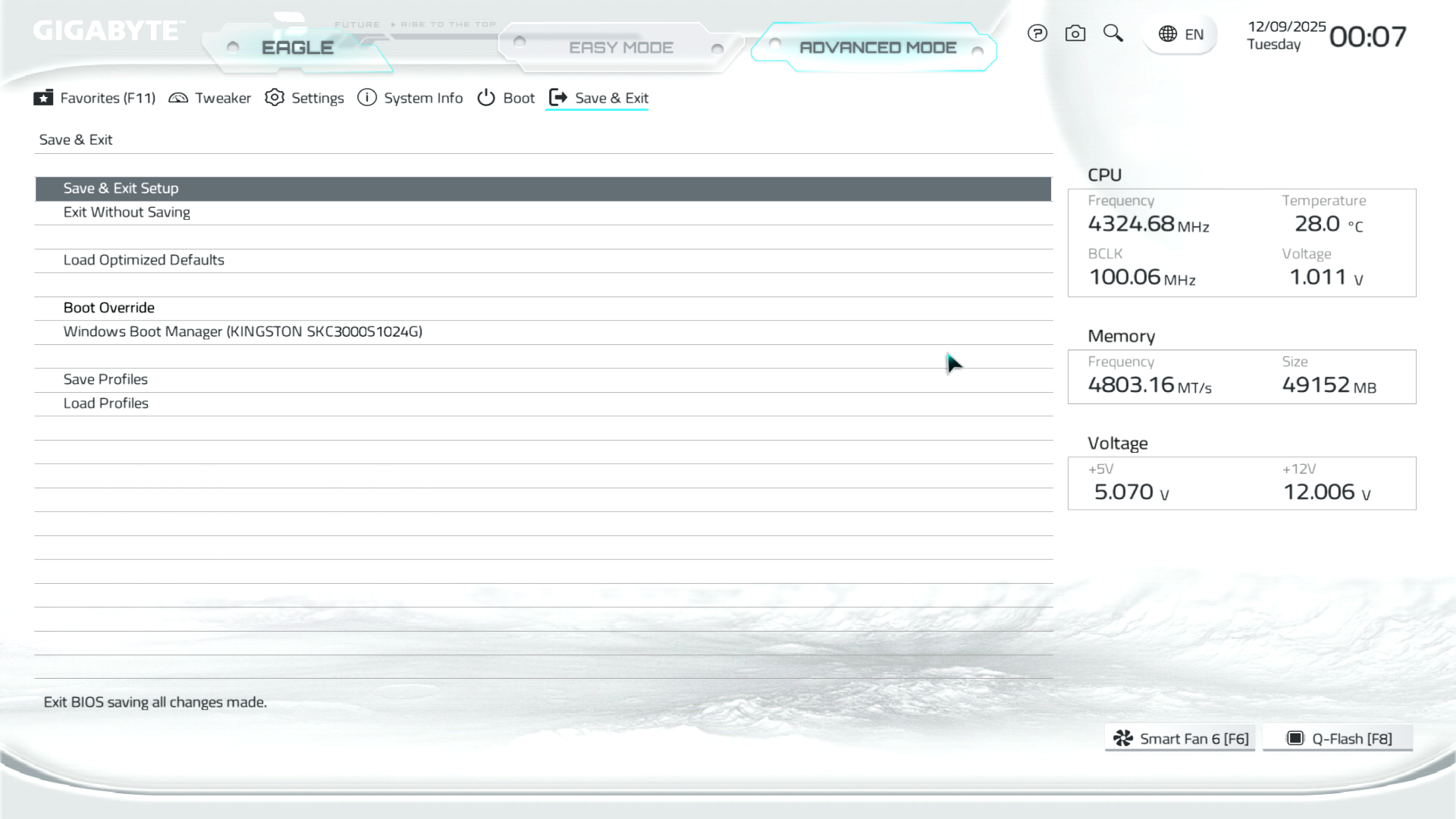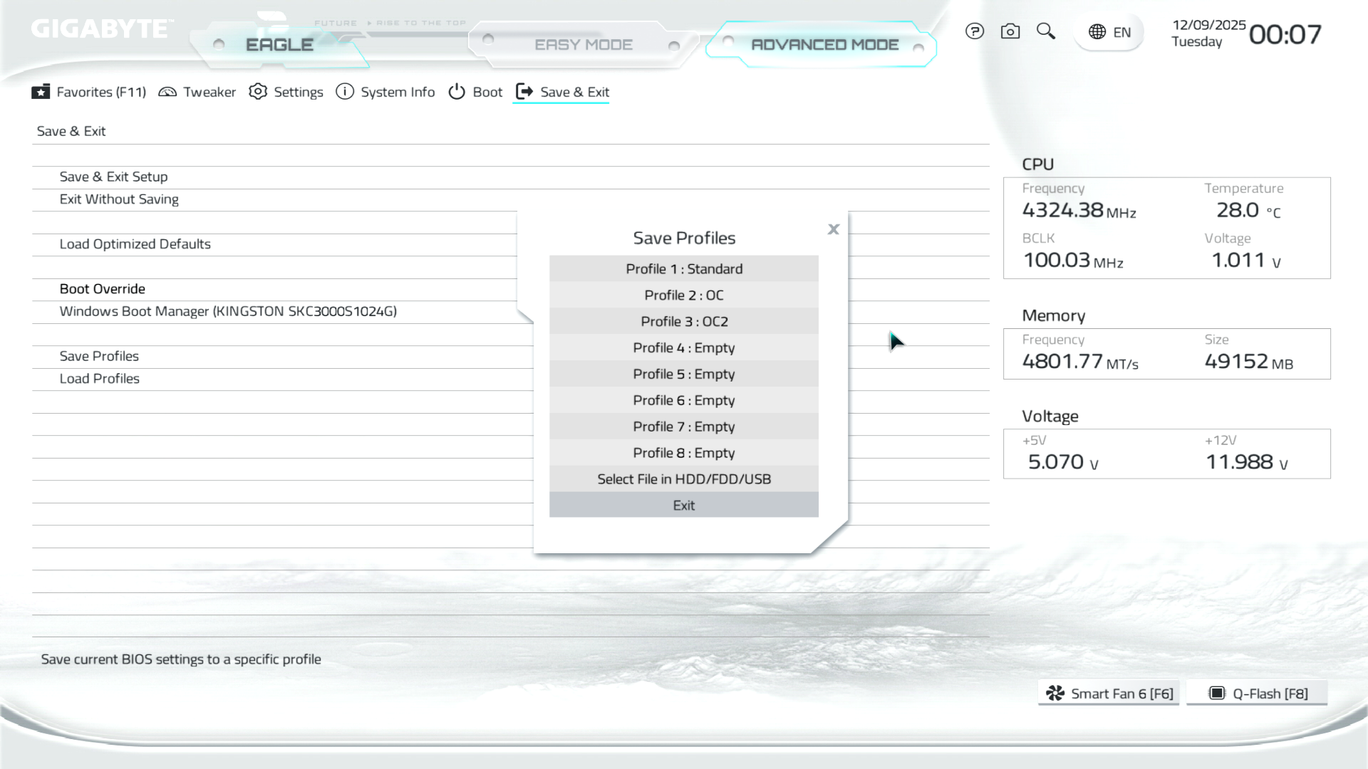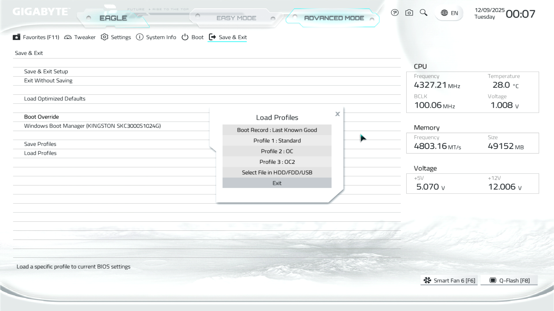 Меню Save & Exit дає можливість зберігати й завантажувати профілі користувацьких налаштувань (доступно вісім профілів на внутрішній пам’яті), а також класичні функції.