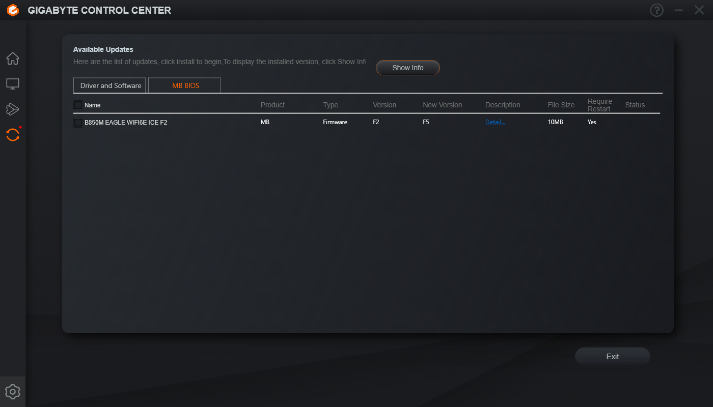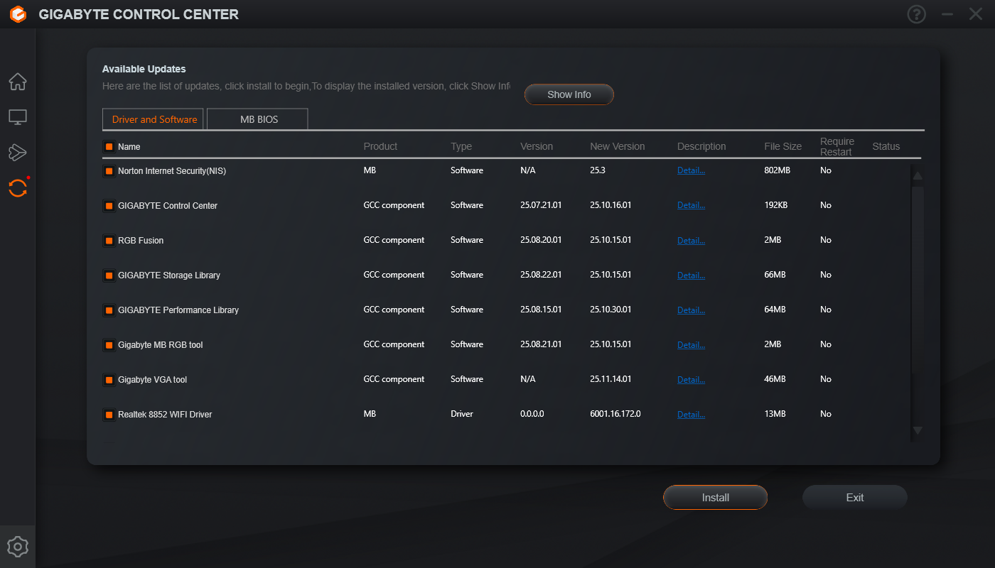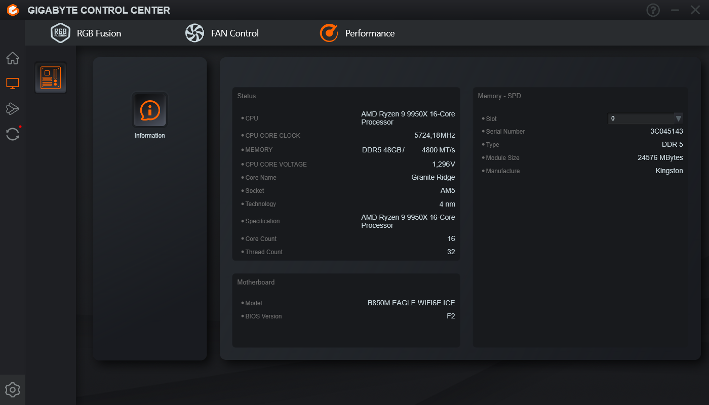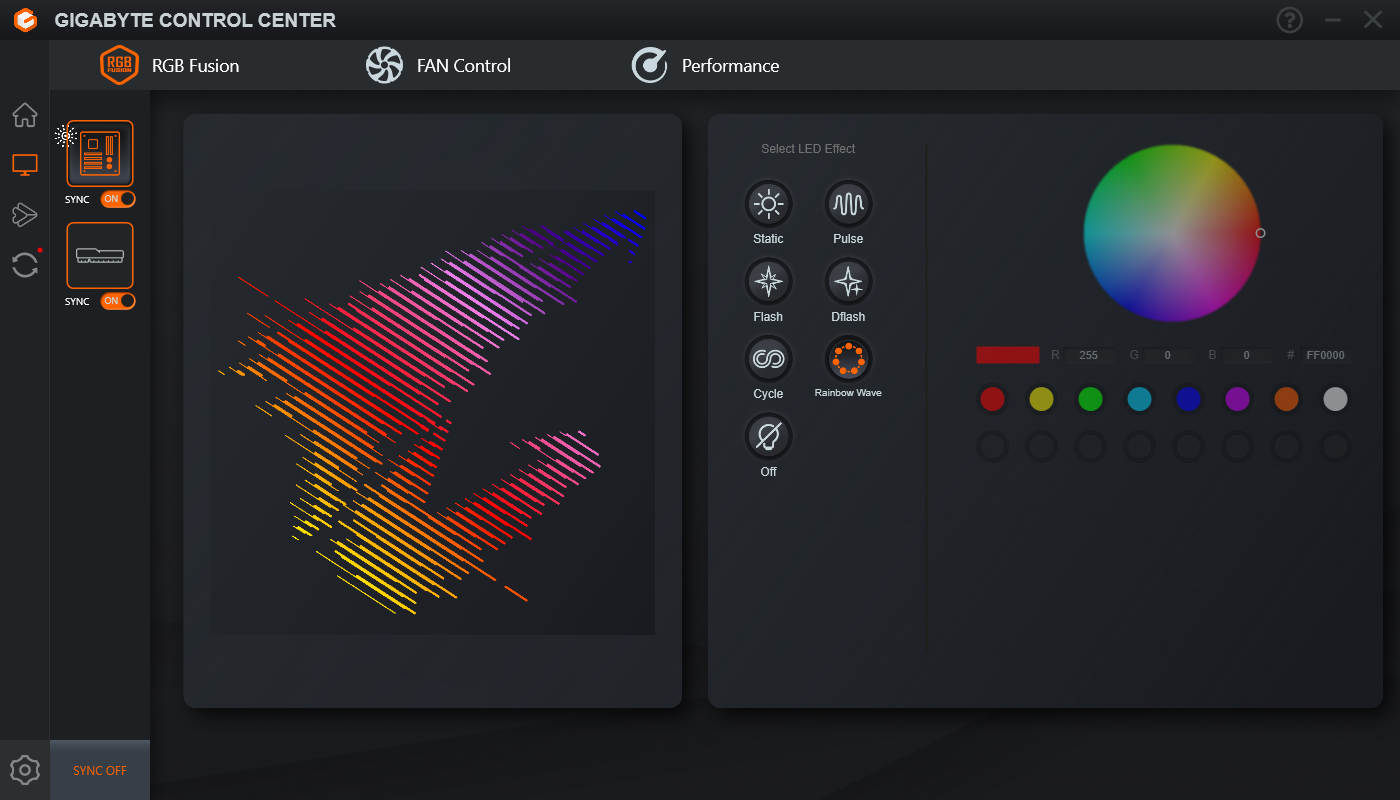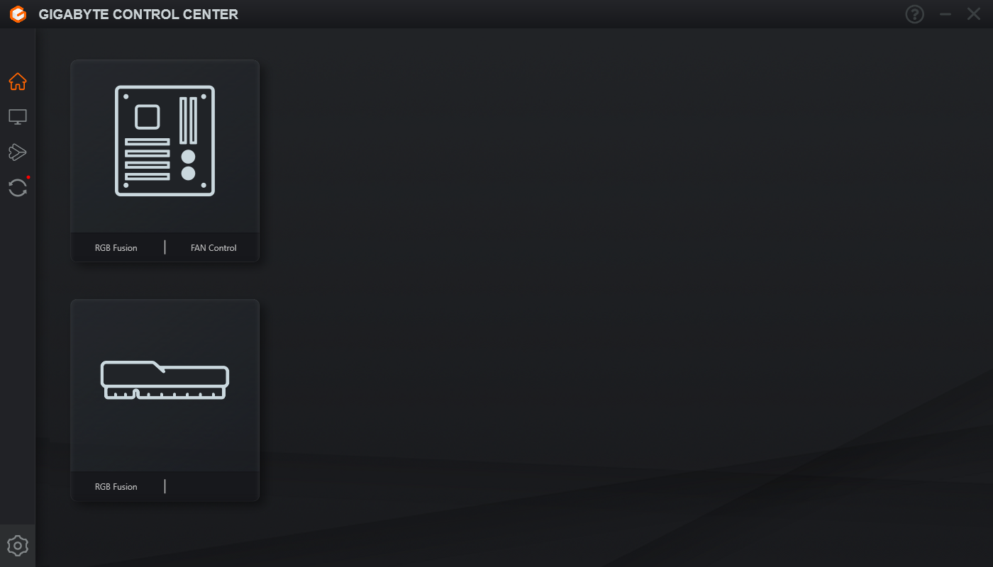 Головний хаб керування Gigabyte Control Center дає можливість налаштування RGB Fusion на всіх підключених пристроях, керувати вентиляторами, розширеними функціями налаштування Wi-Fi, а також частотами/напругами/множниками прямо з ОС наживо. Є можливість передавання файлів на інші пристрої, а також присутній інтерфейс оновлення драйверів та прошивки материнської плати.