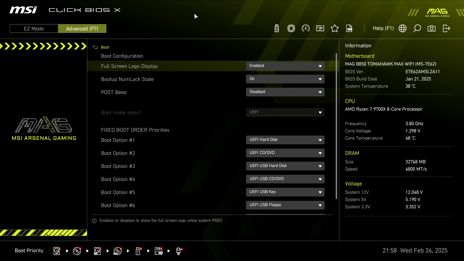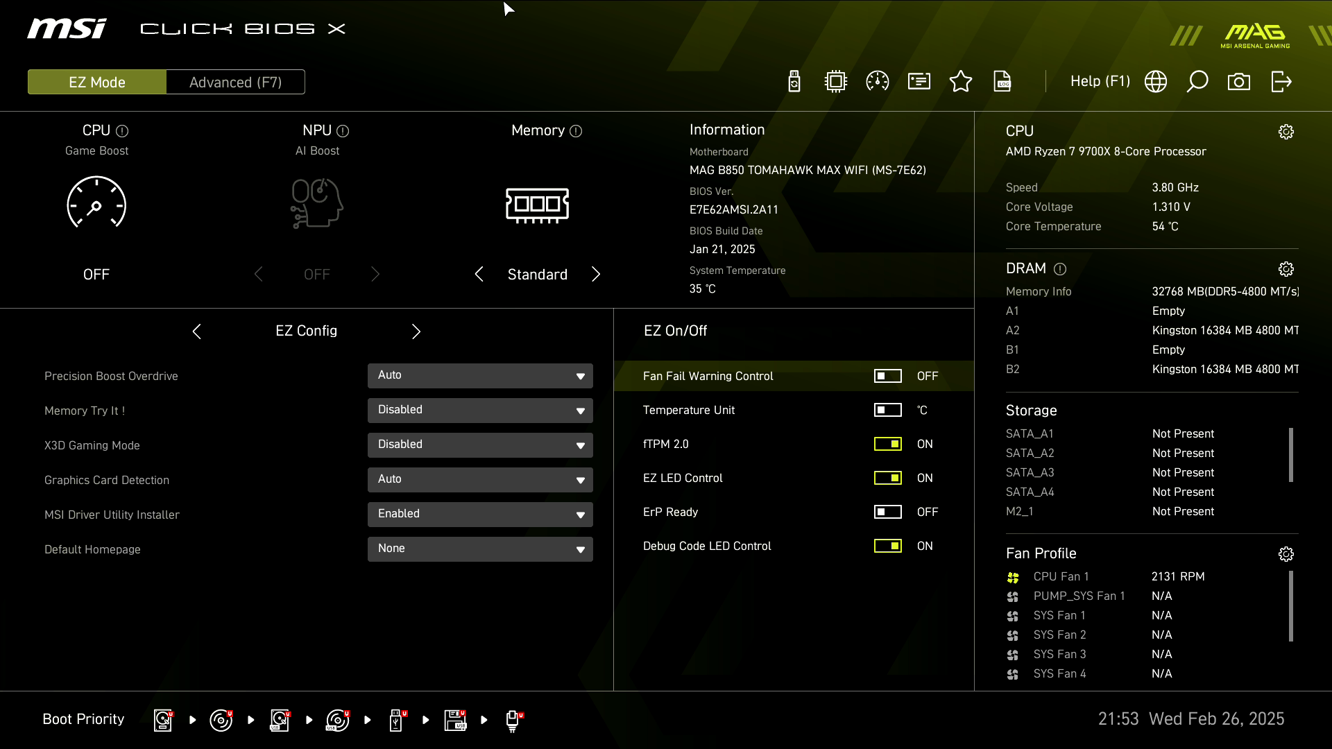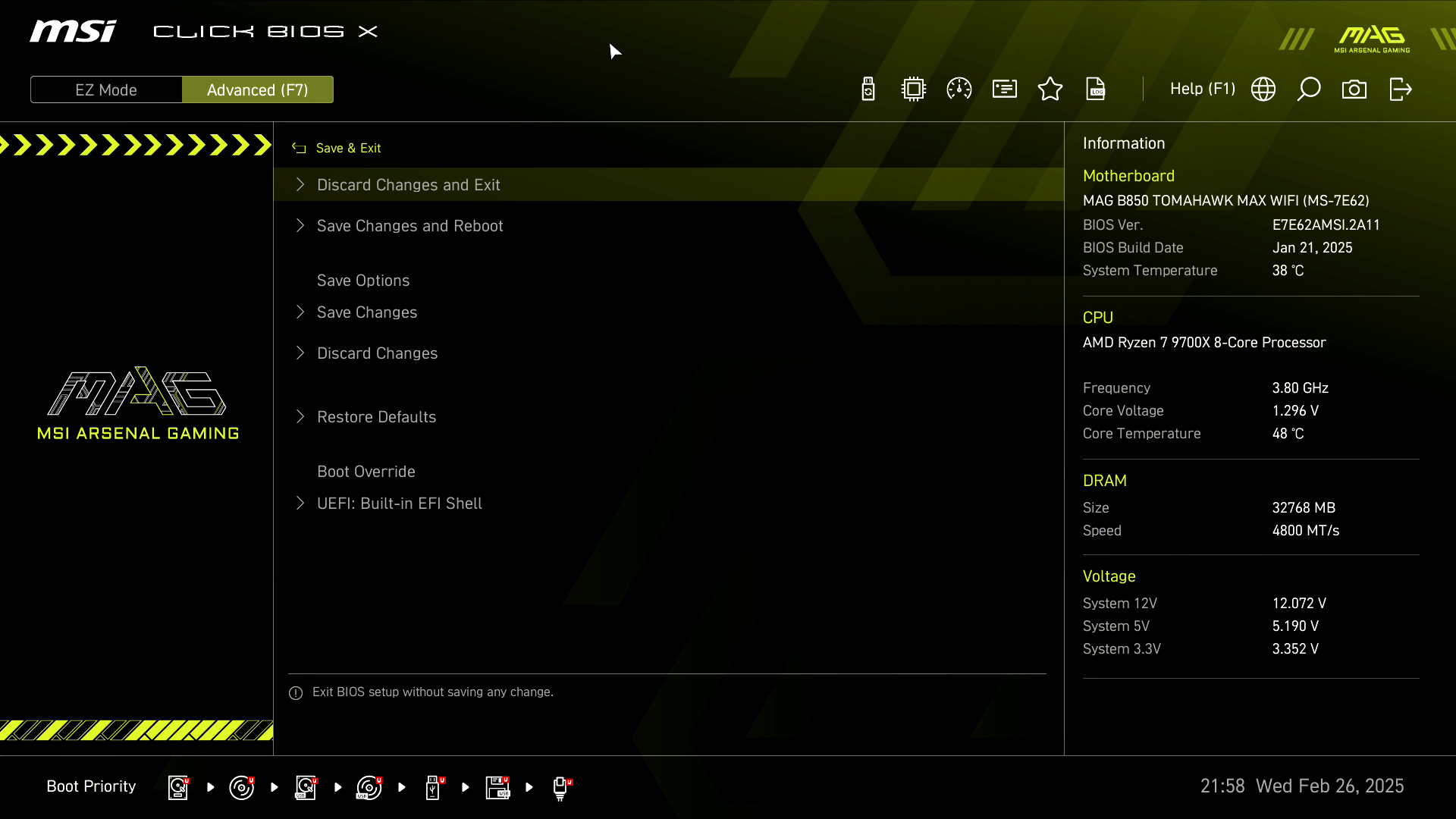- материнська плата: MSI MAG B850 TOMAHAWK MAX WIFI (UEFI 2.A11, AGESA 1.2.0.3a);