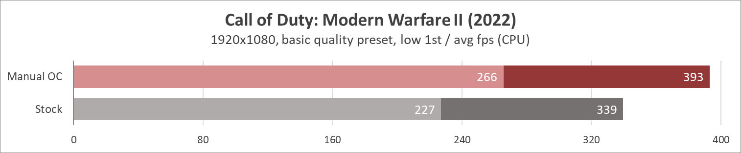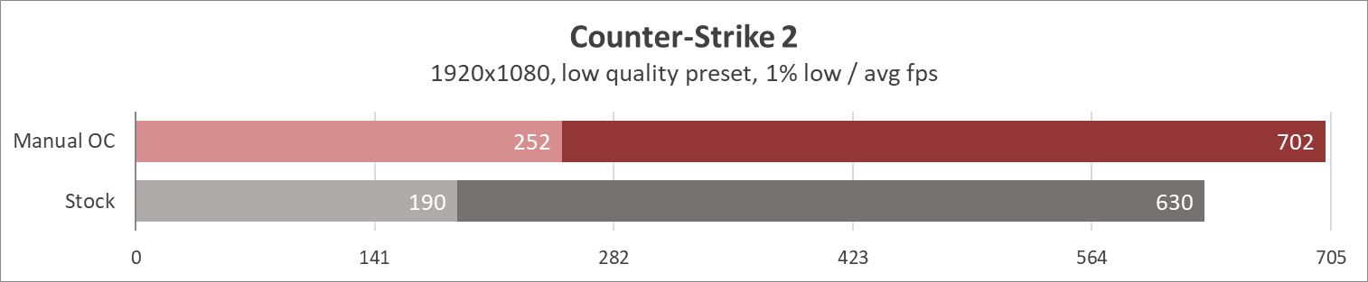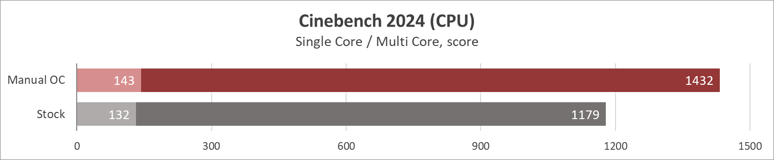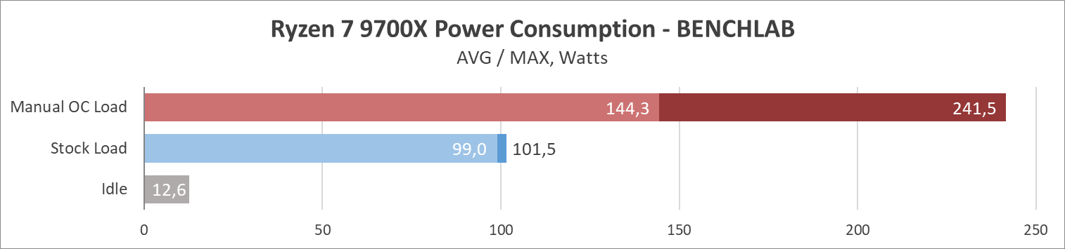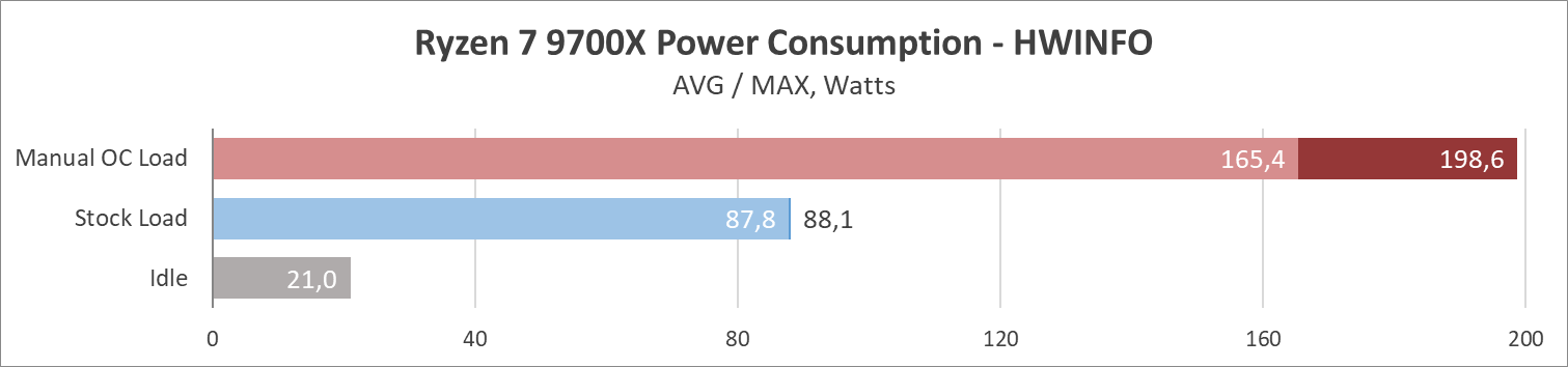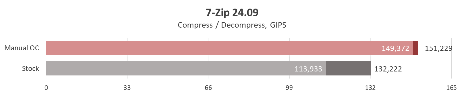 Задля різновиду й демонстрації асортименту різноманітних підходів до оверклокінгу процесорів Granite Ridge цього разу було використано PBO + Curve Optimizer. Це дозволило процесору збільшити прискорення на 200 МГц, scalar x10, офсет Curve Optimizer +5. FCLK працював на частоті 2200 МГц, оперативна пам’ять працювала в режимі DDR5-7600 CL34-46-46-36 2T, а контролер пам’яті — в режимі 1:2. Ліміти енергоспоживання знято.