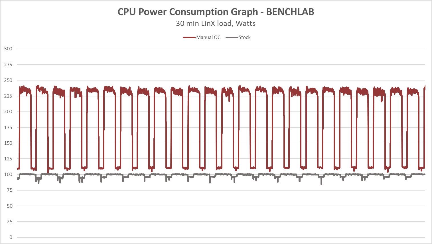 В режимі навантаження при типових налаштуваннях було забезпечено середню частоту всіх ядер на рівні 4320,1 МГц з максимальним прискоренням одного ядра до 5550 МГц.