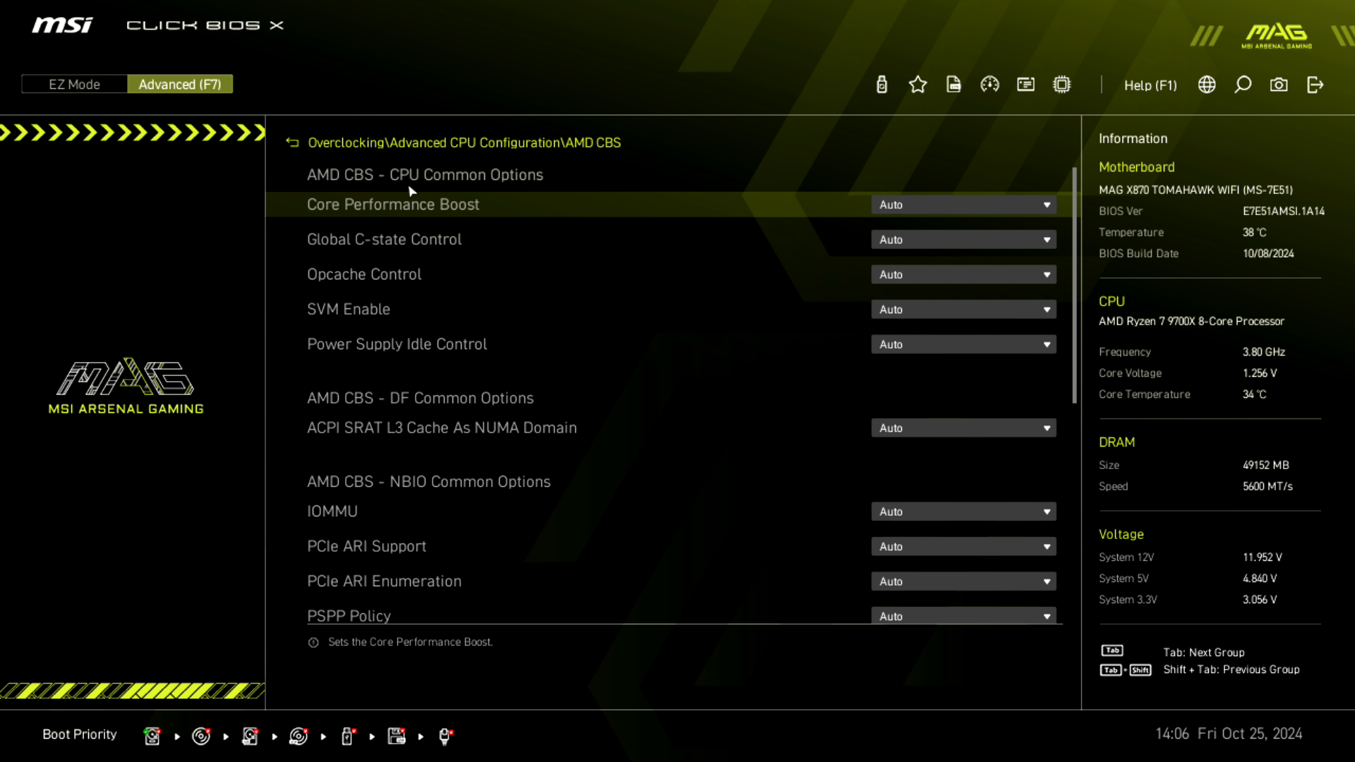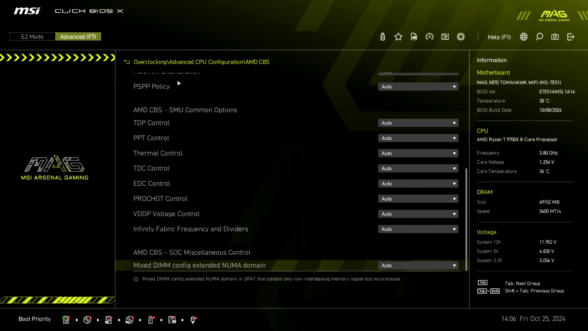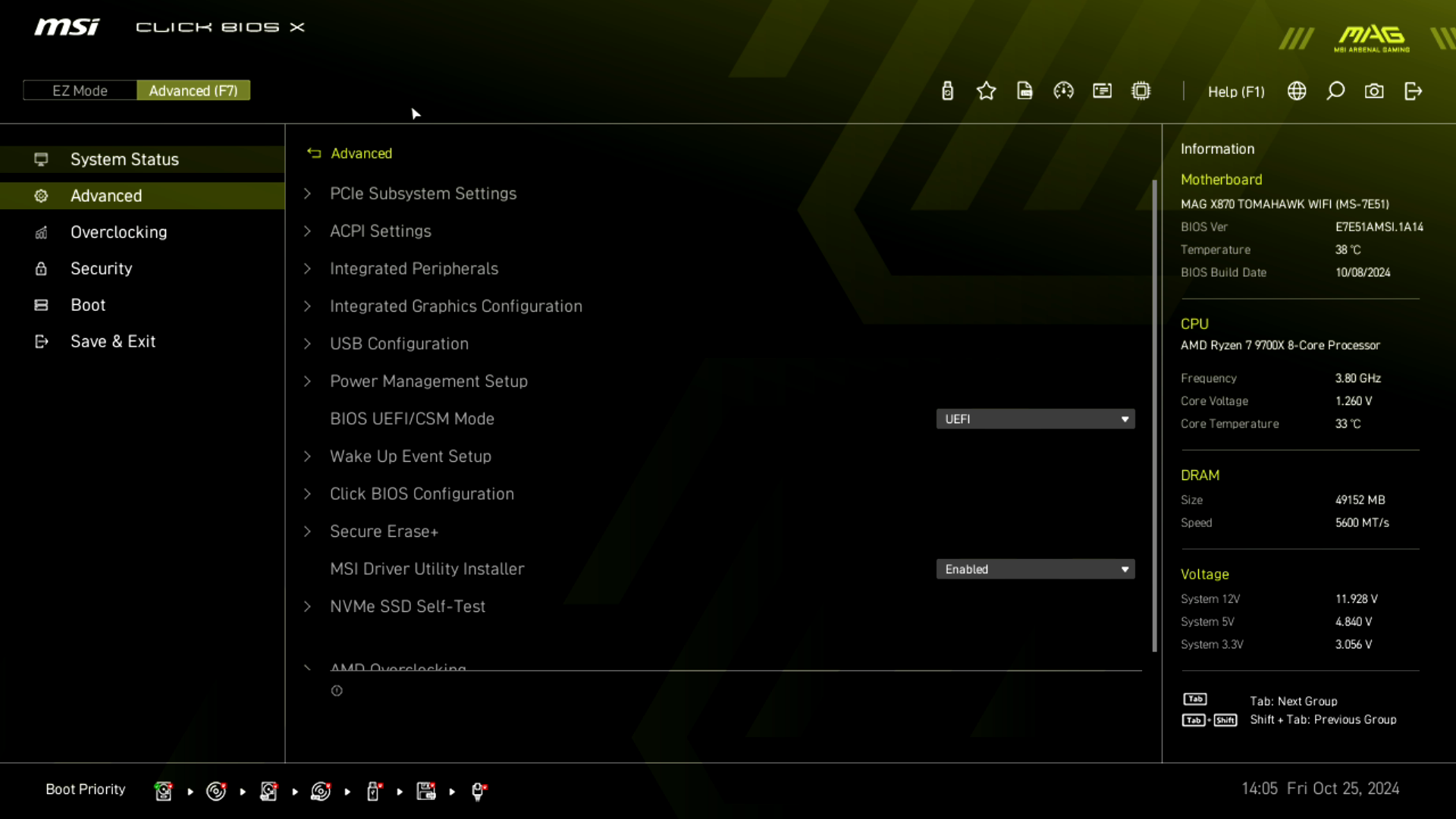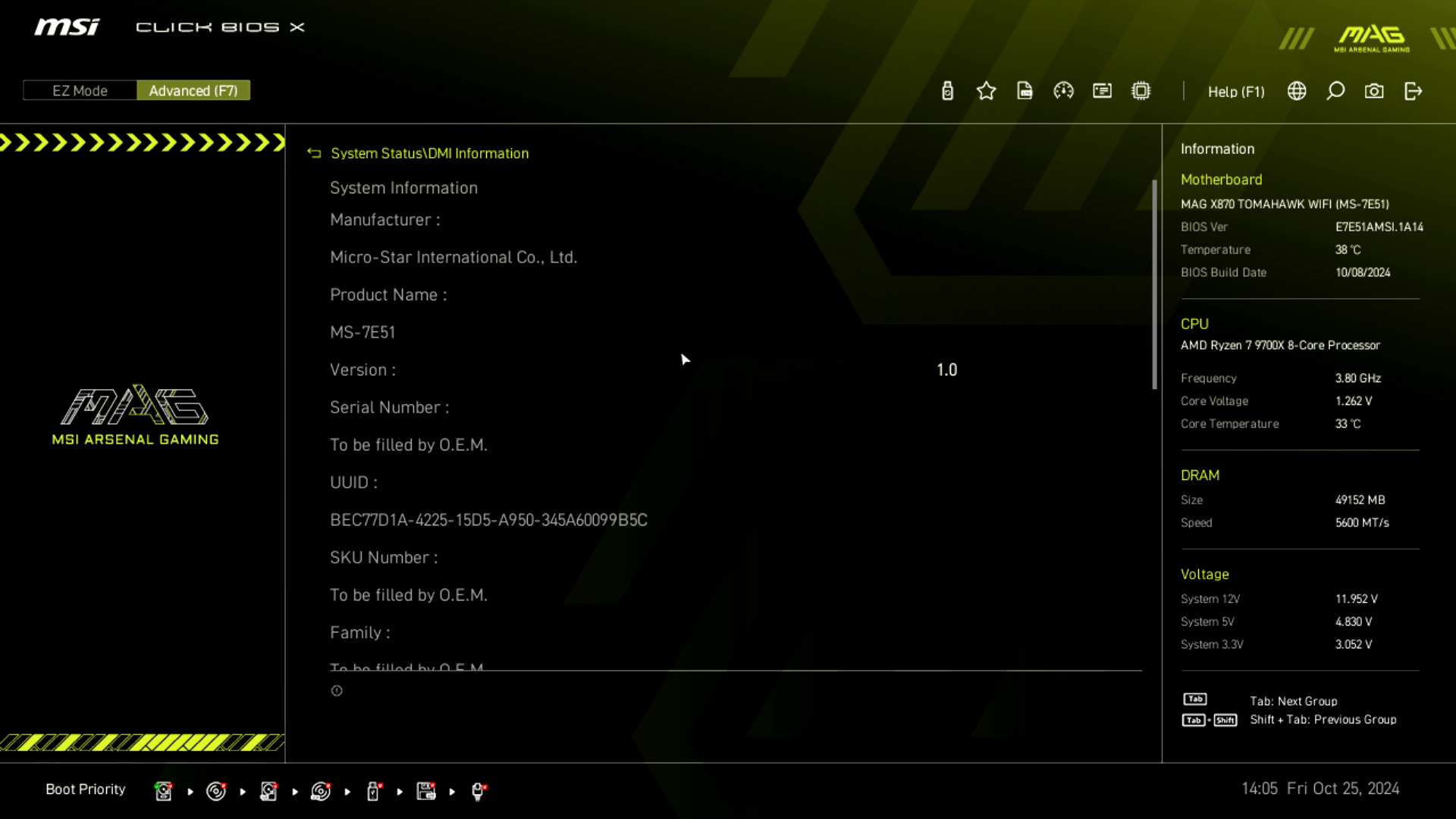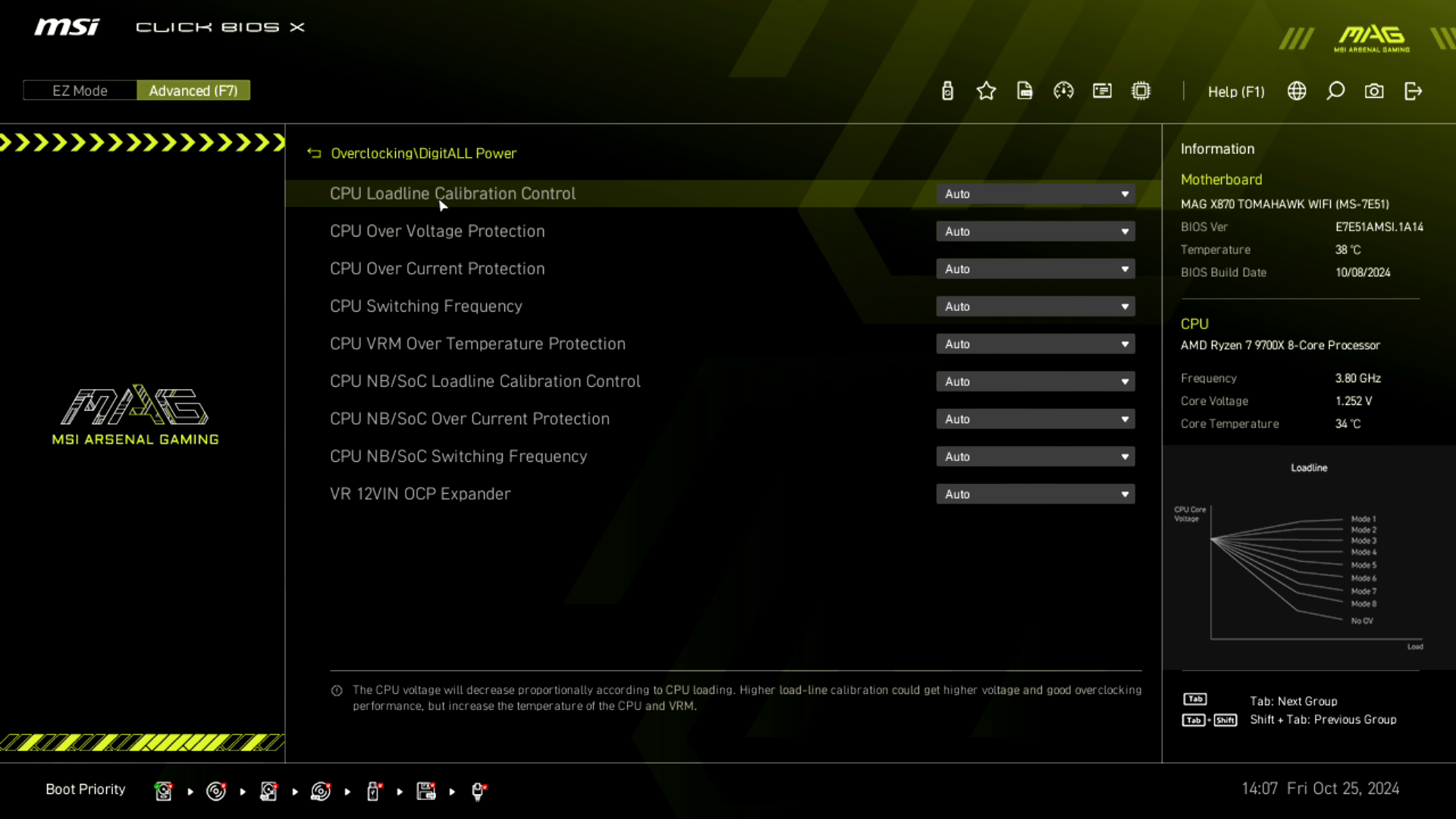 - материнська плата: MSI MAG X870 TOMAHAWK WIFI (UEFI 1.A14, AGESA 1.2.0.2);