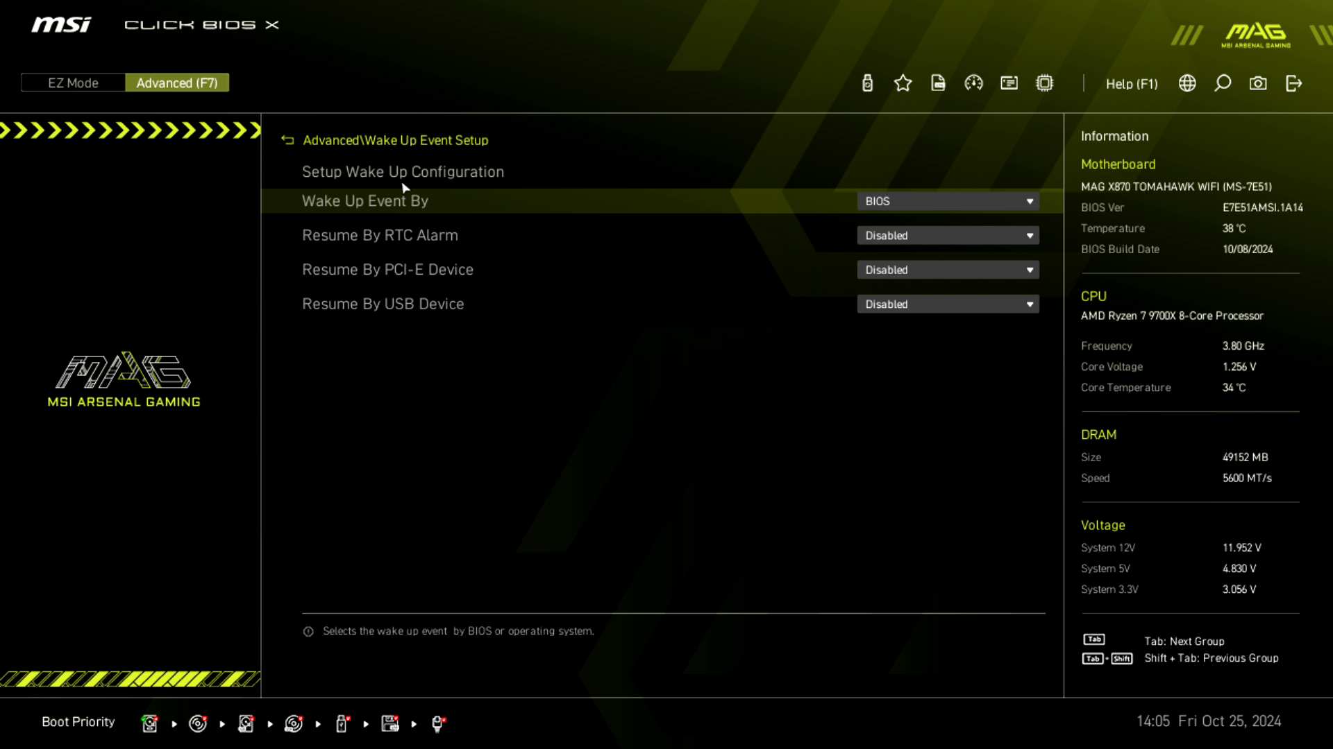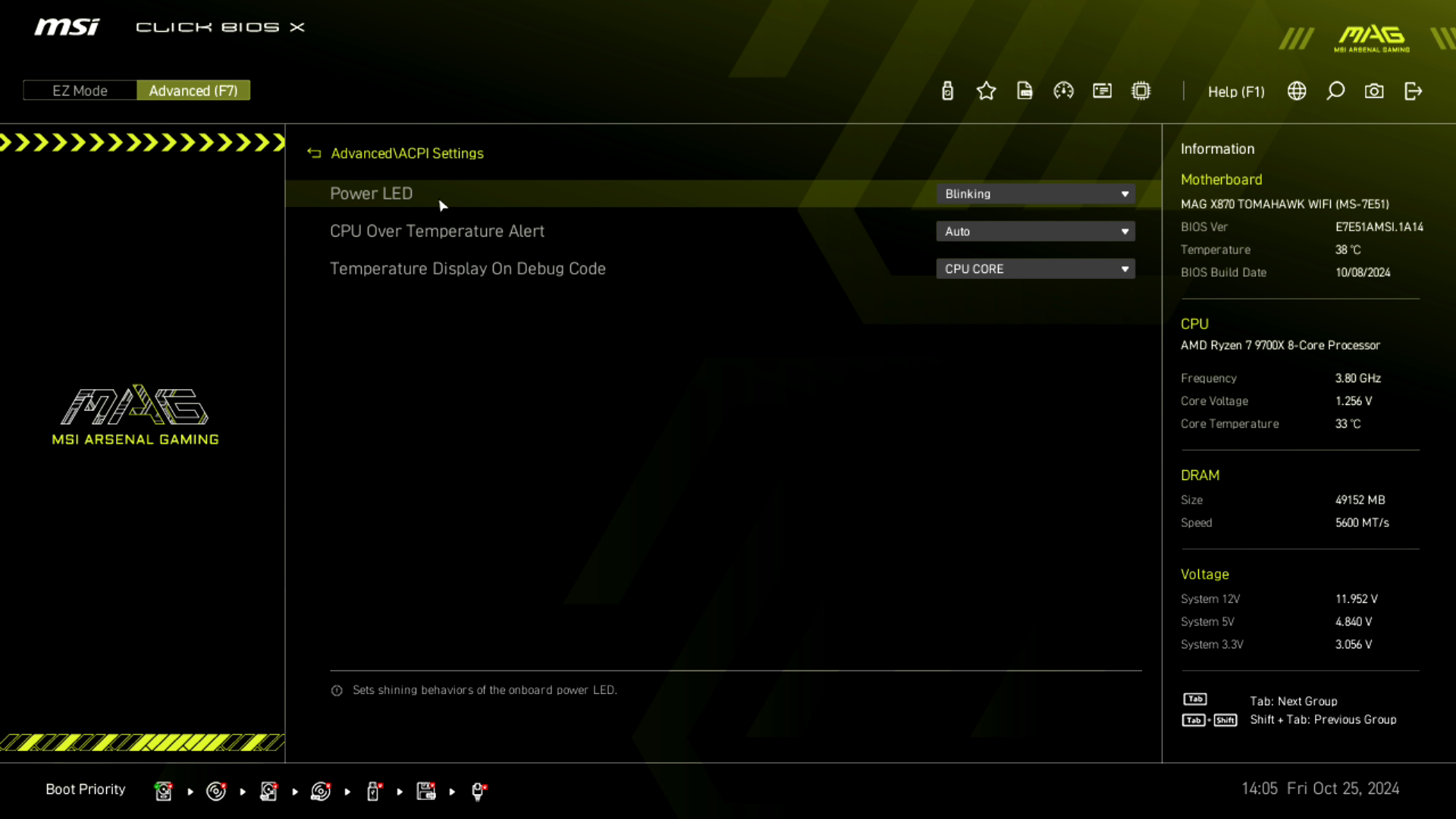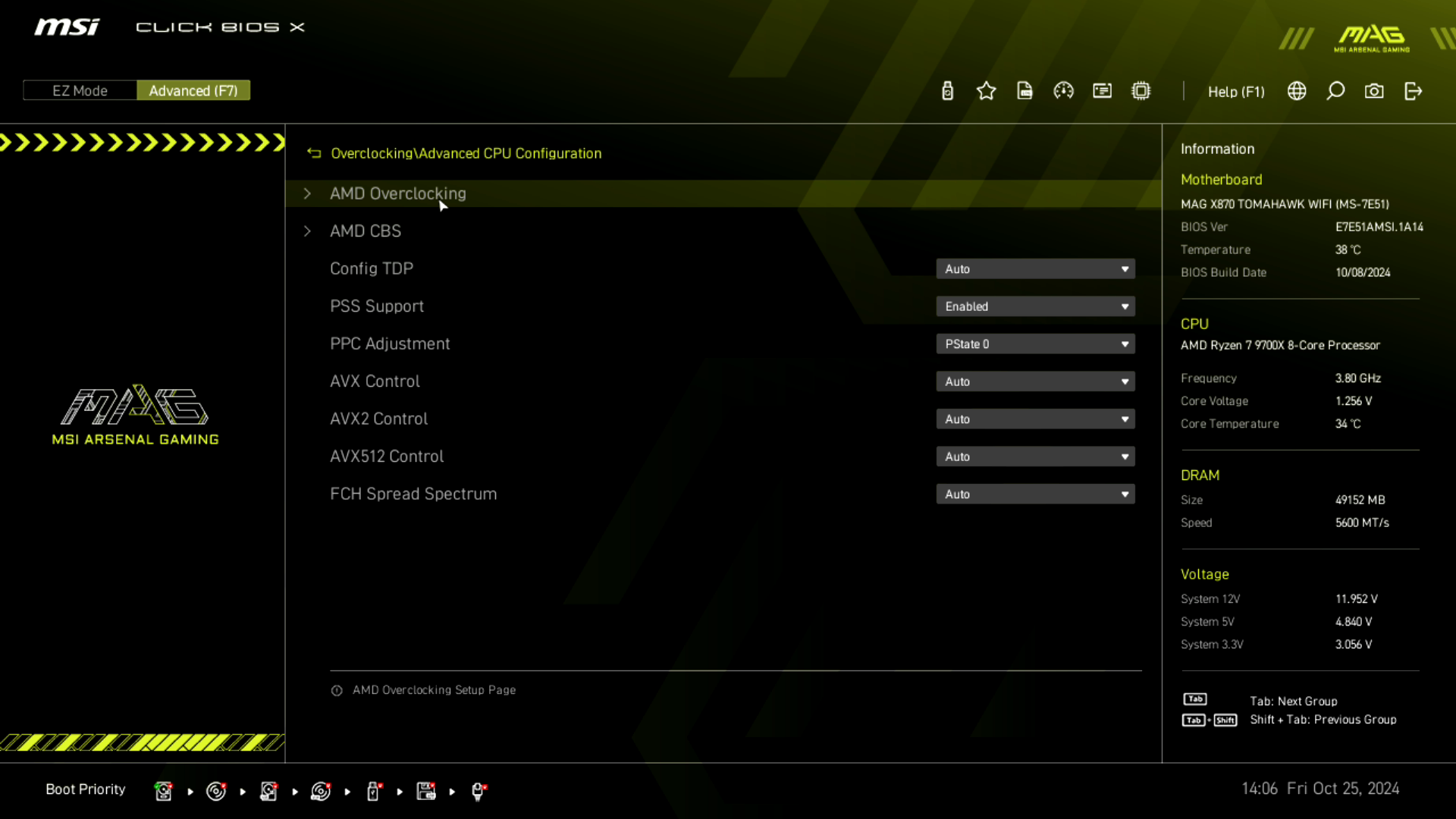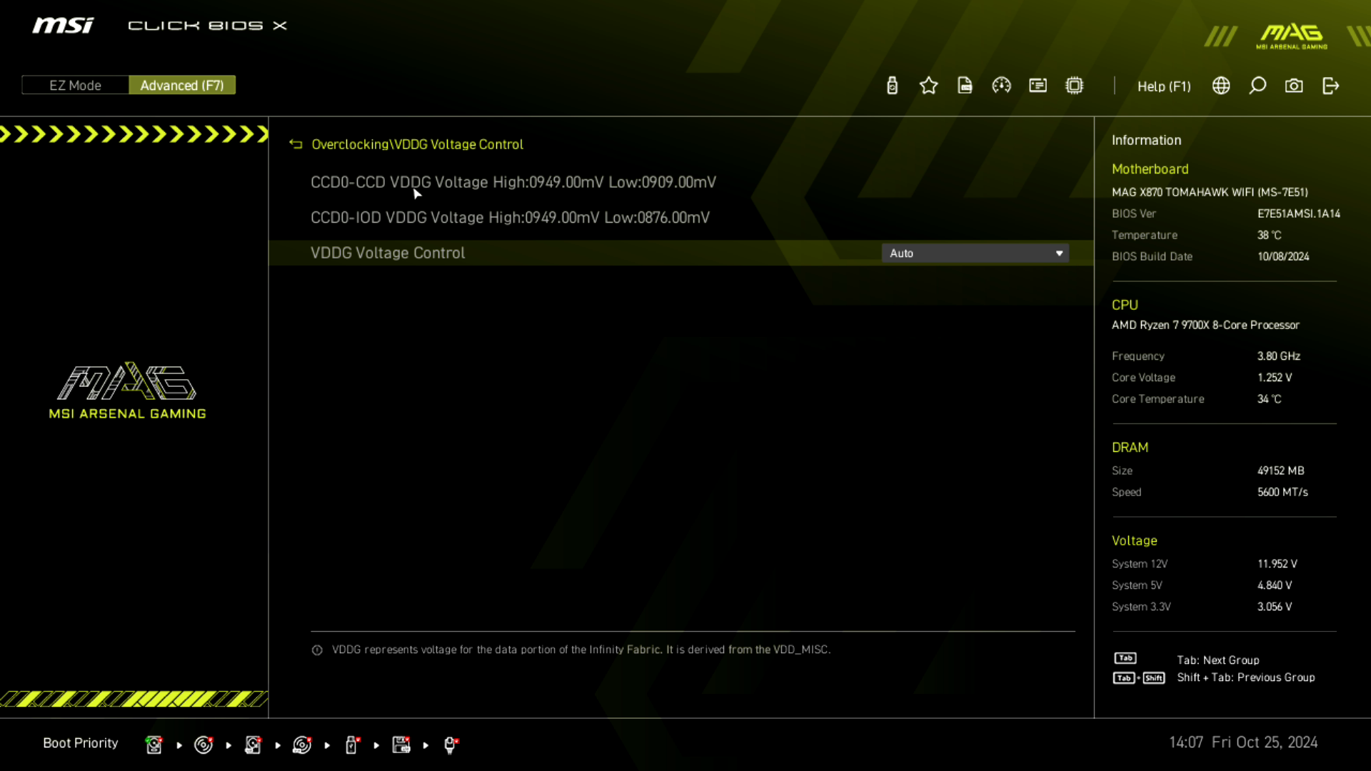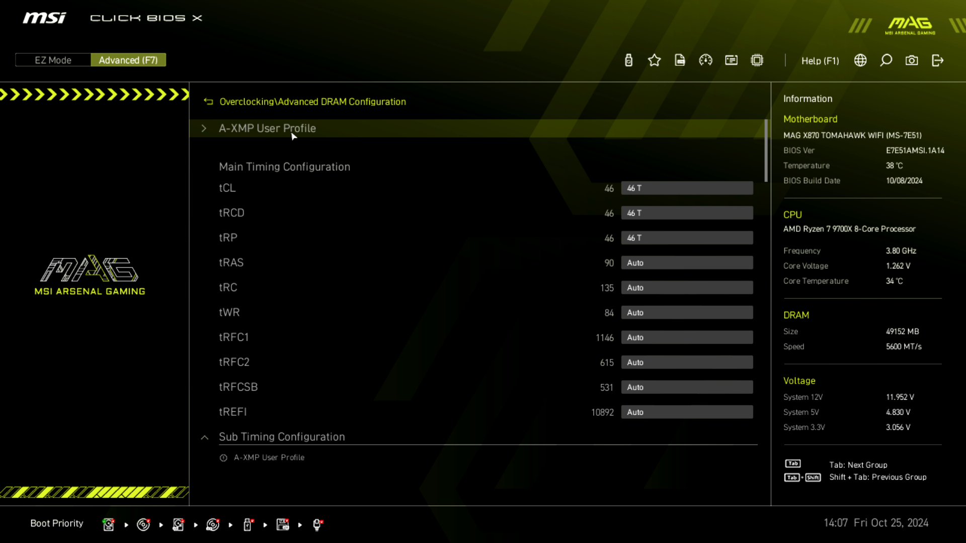 - материнська плата: MSI MAG X870 TOMAHAWK WIFI (UEFI 1.A14, AGESA 1.2.0.2);