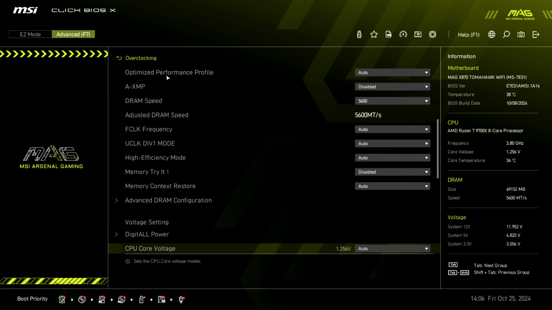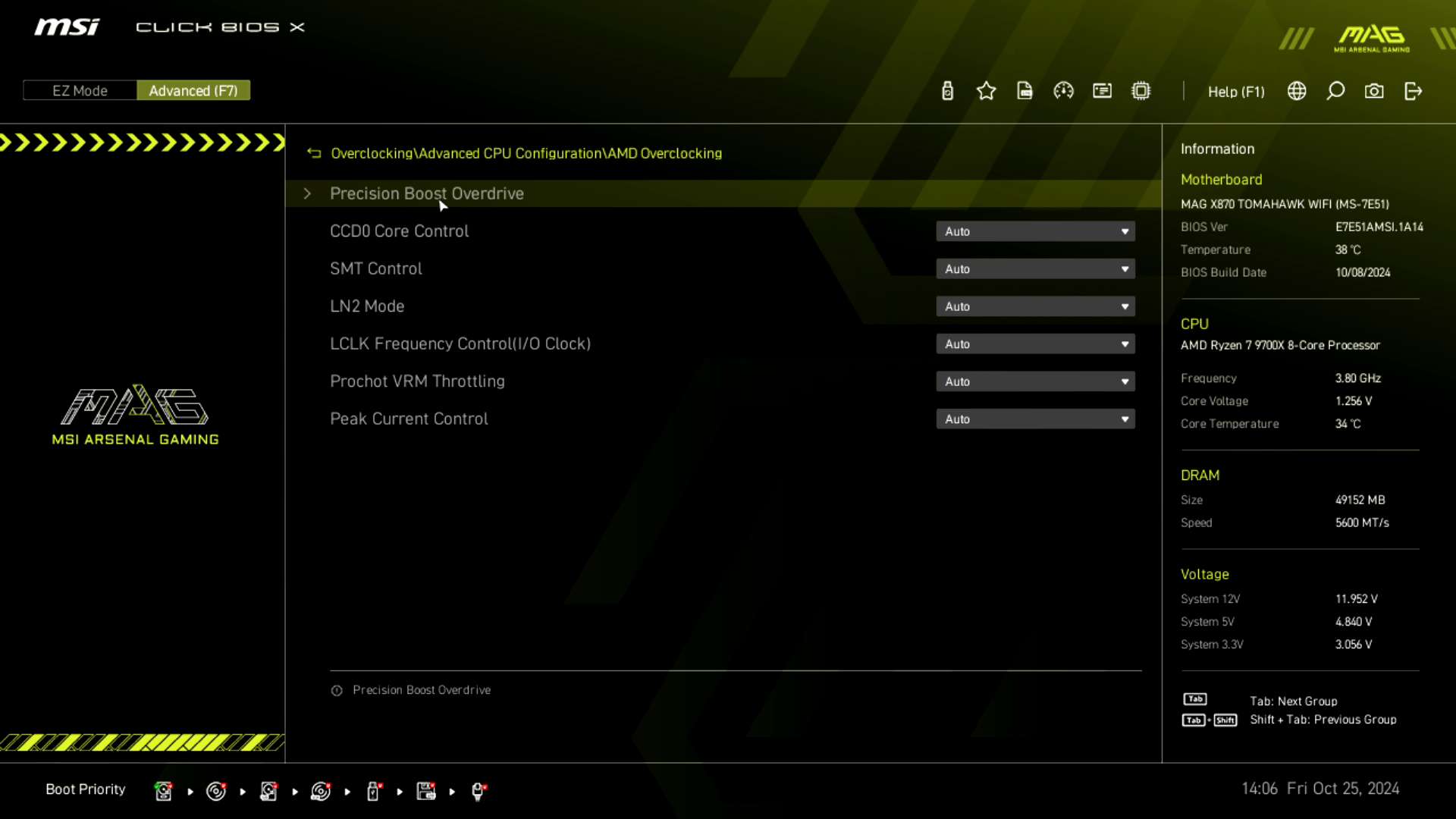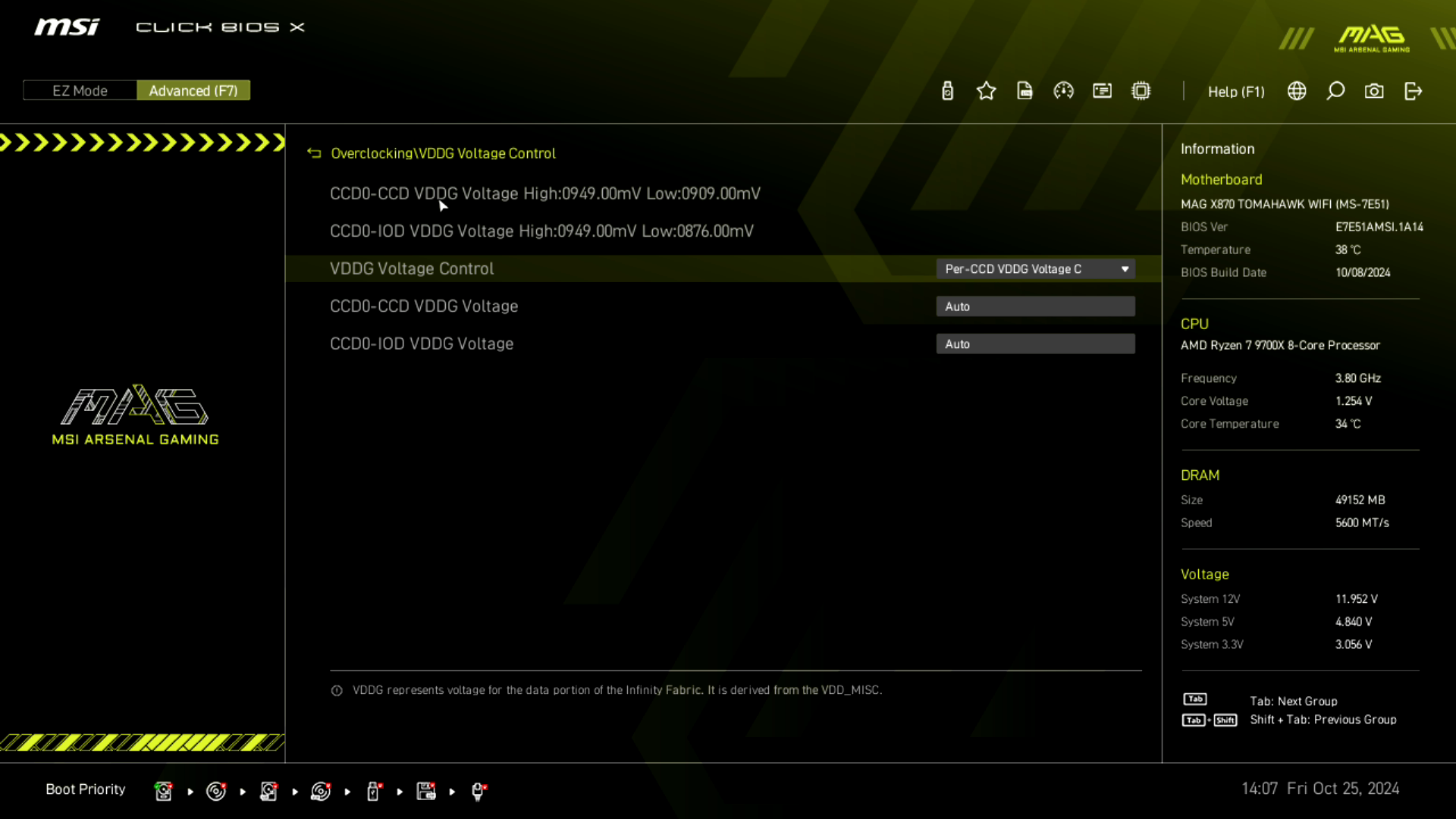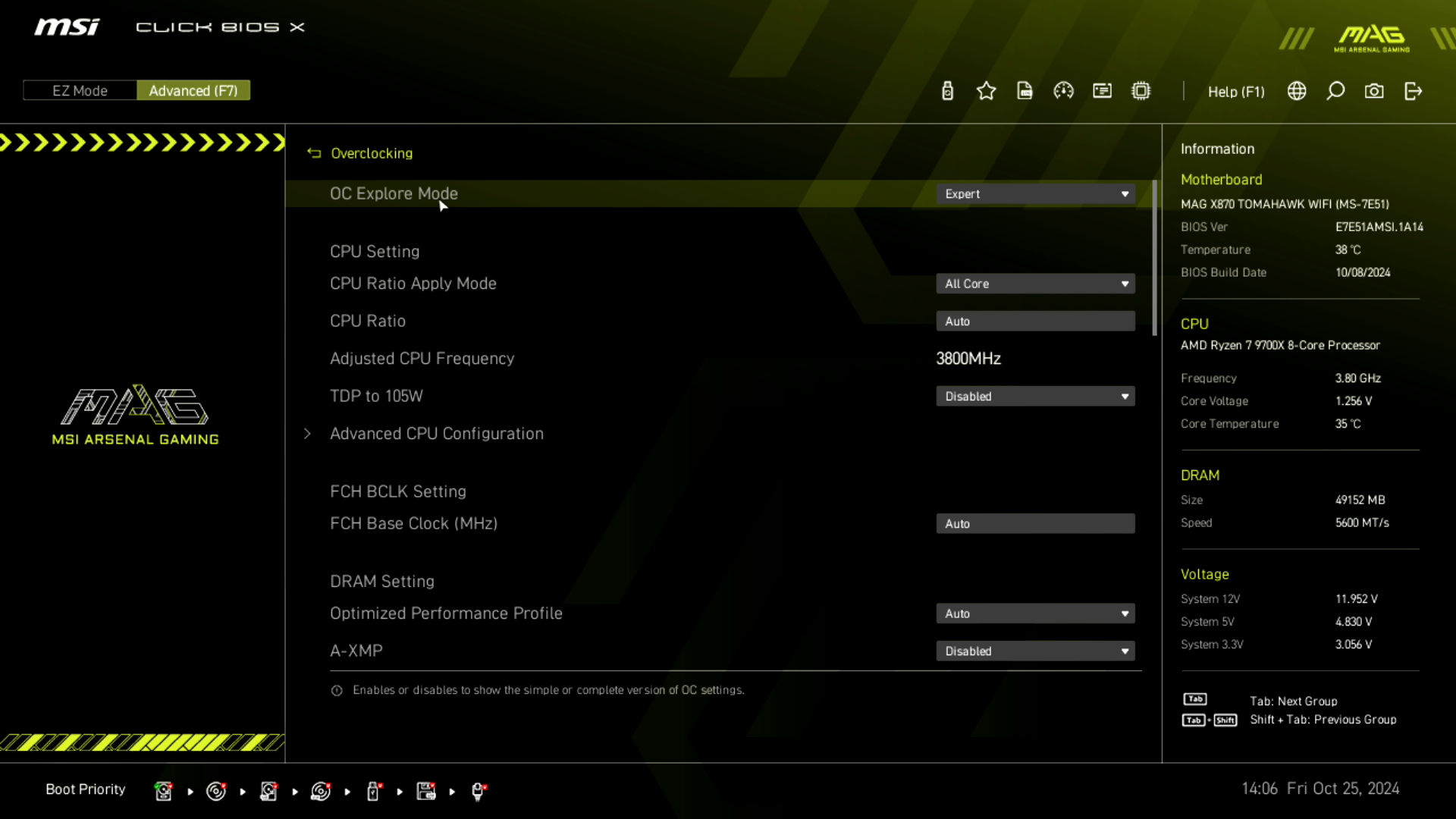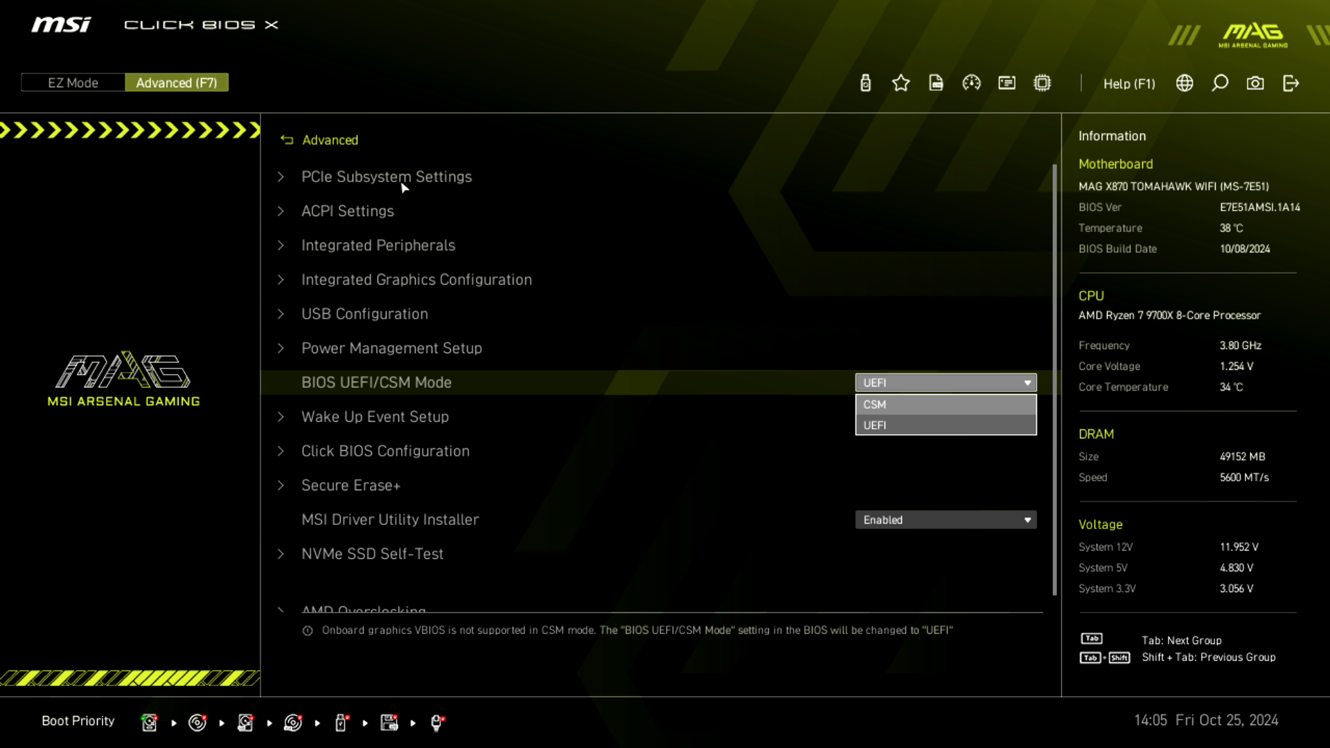 - материнська плата: MSI MAG X870 TOMAHAWK WIFI (UEFI 1.A14, AGESA 1.2.0.2);