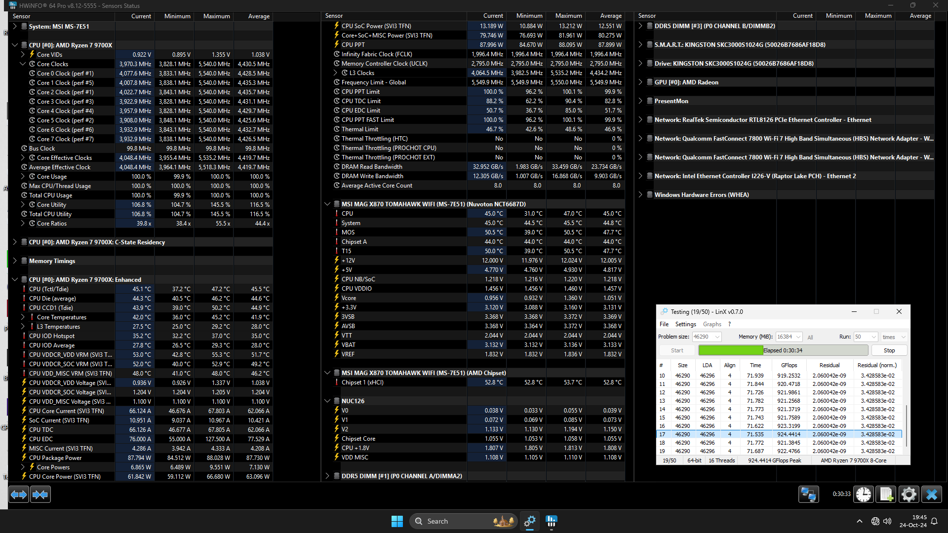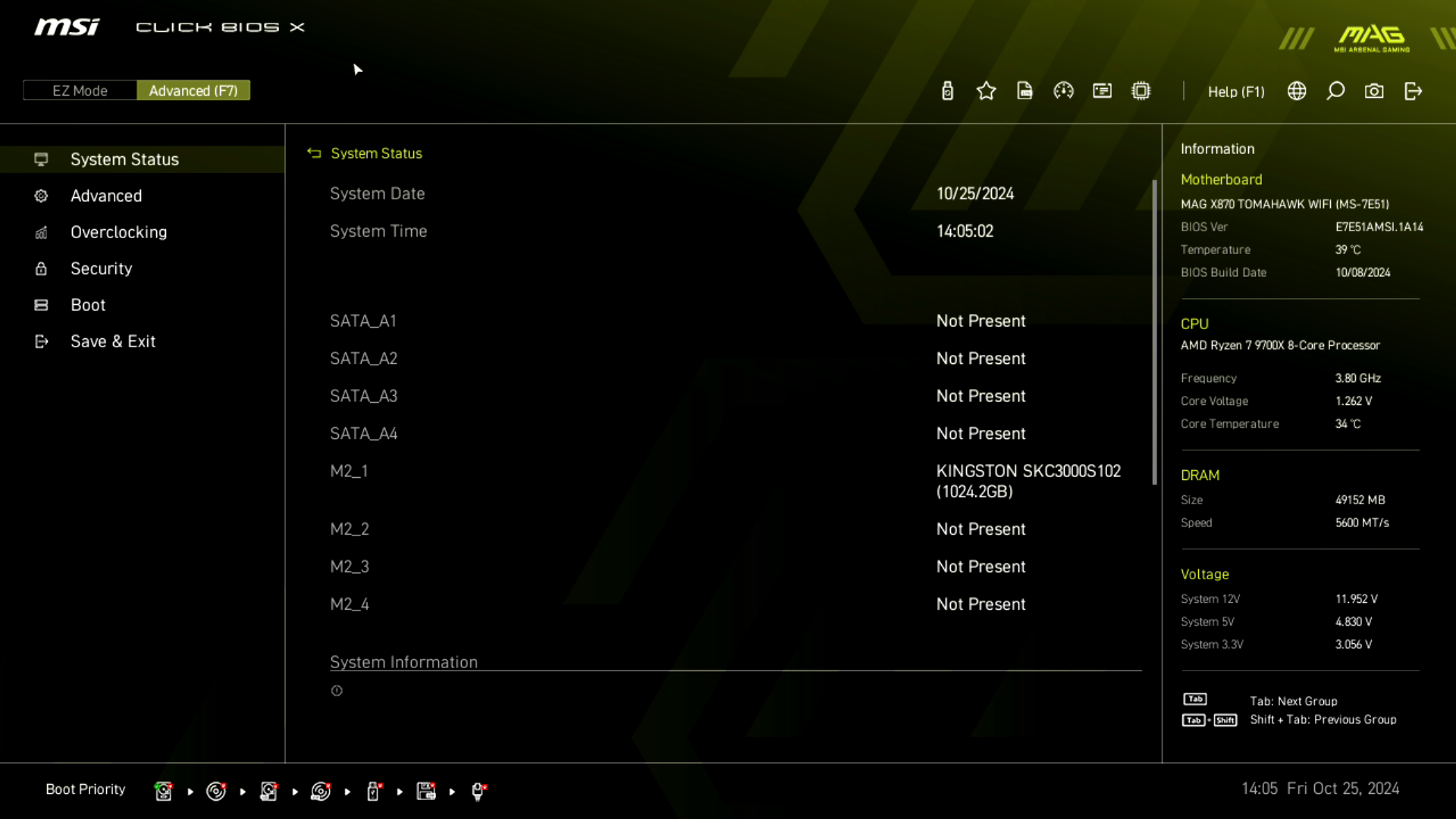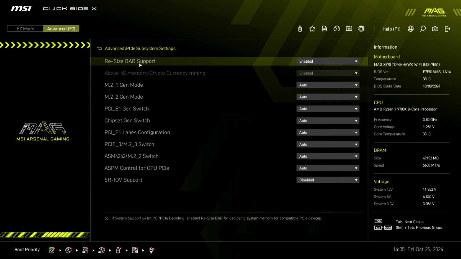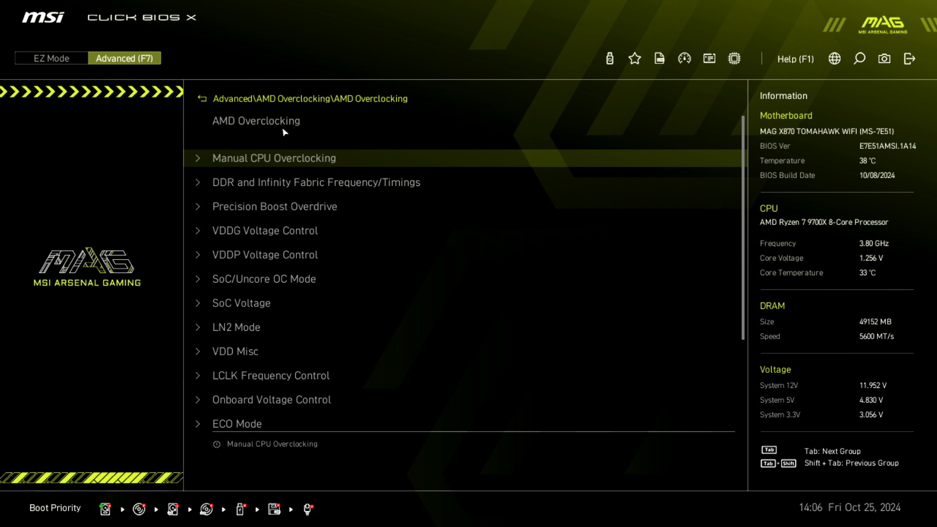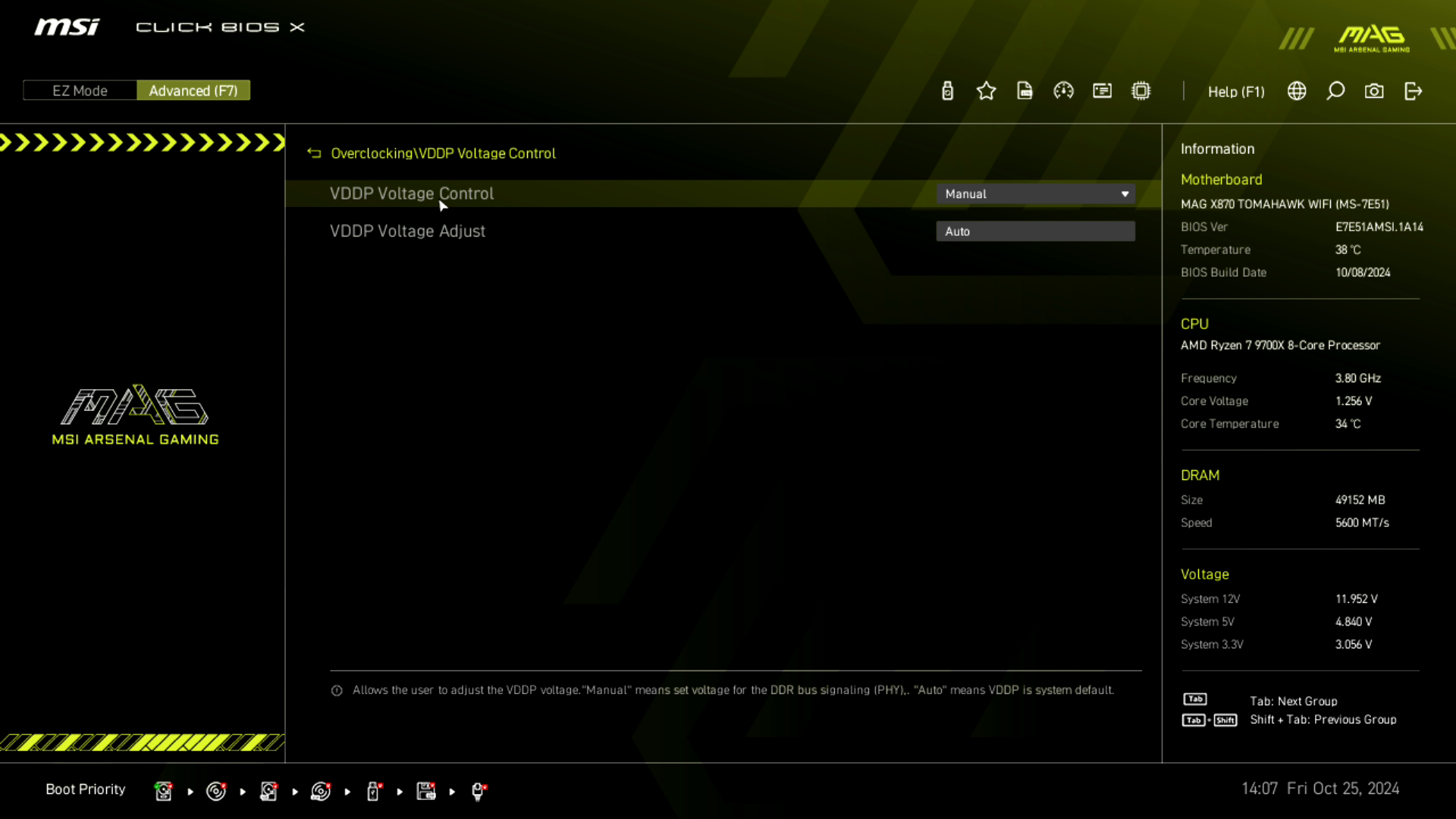 - материнська плата: MSI MAG X870 TOMAHAWK WIFI (UEFI 1.A14, AGESA 1.2.0.2);