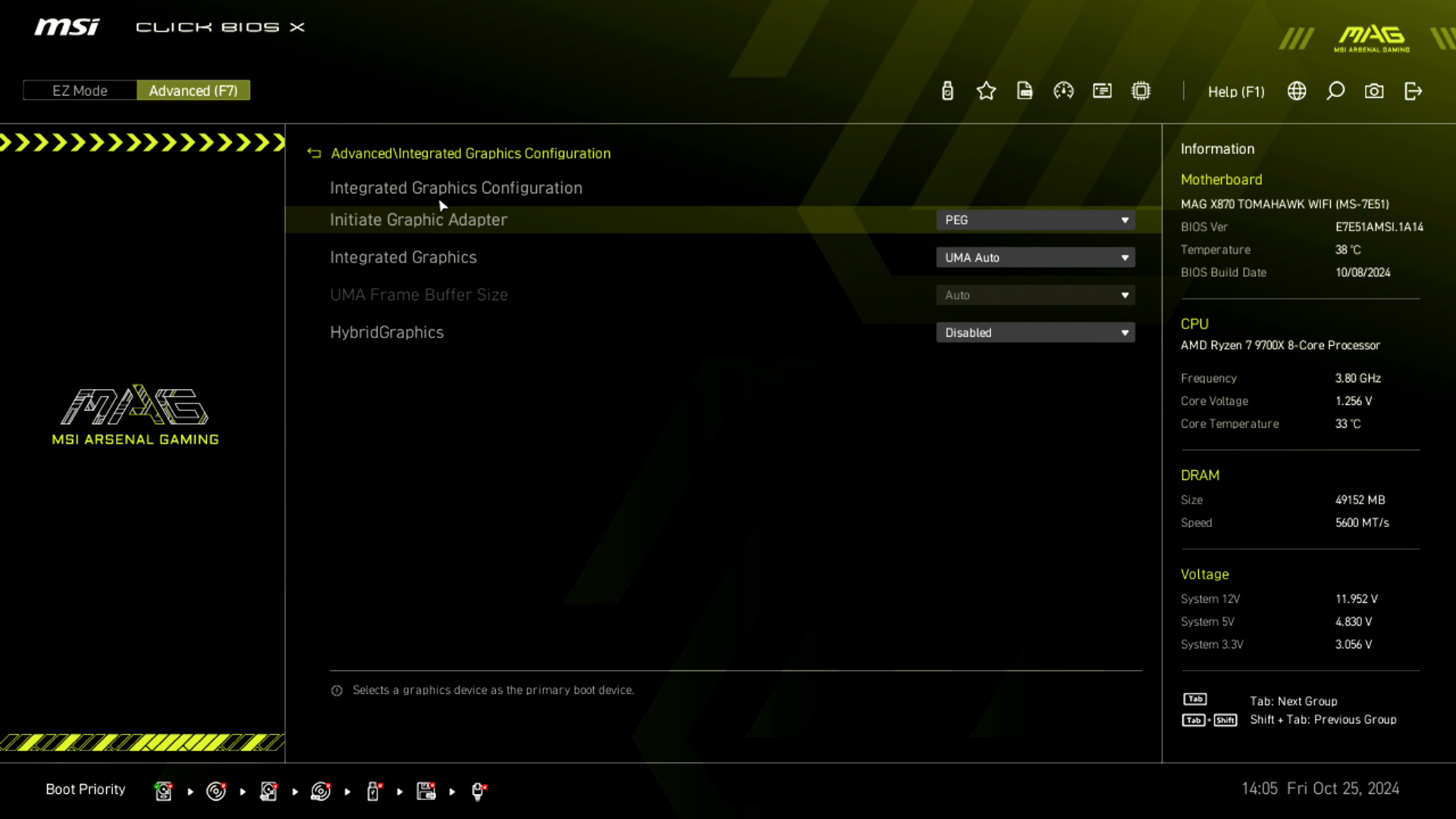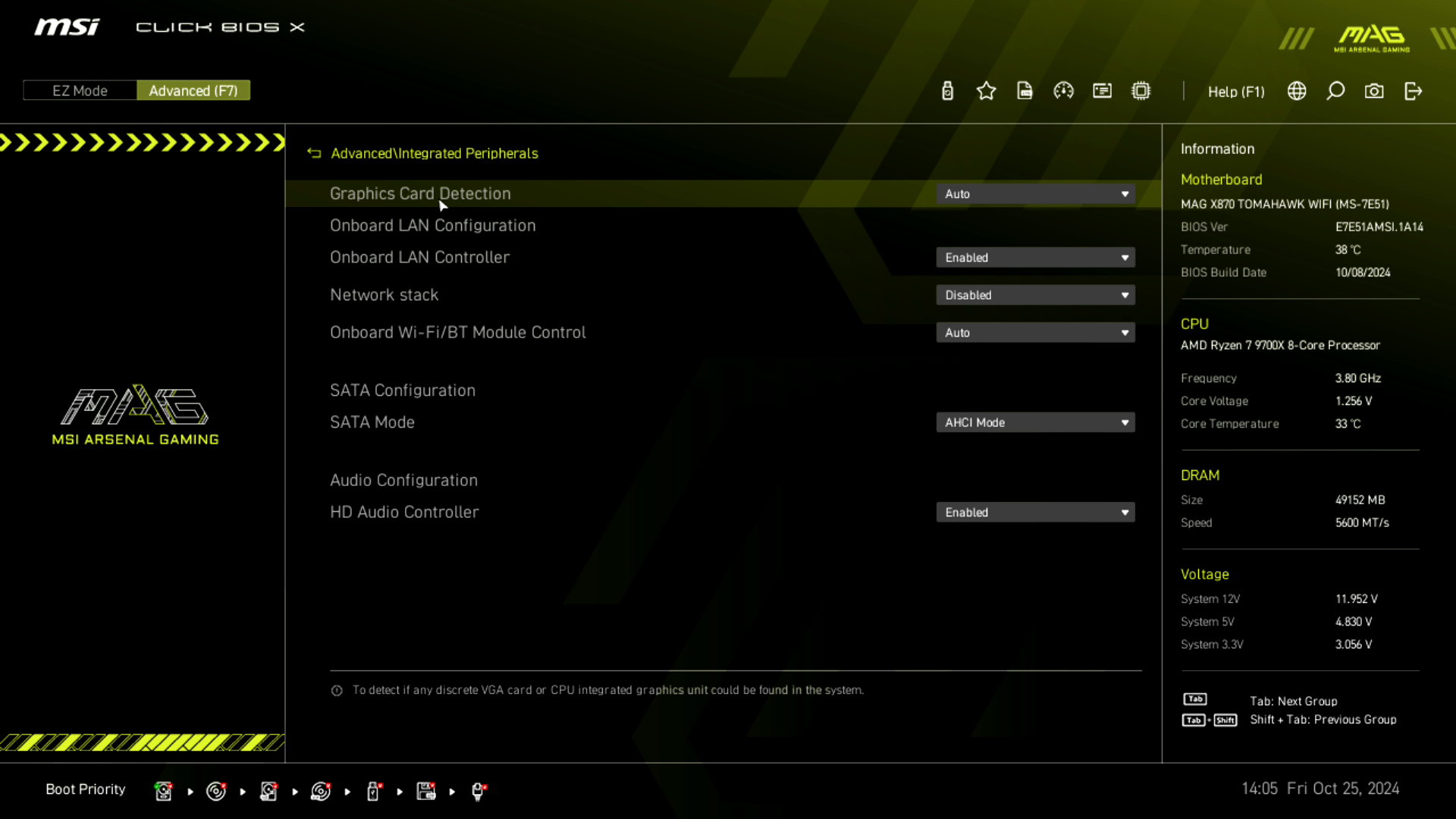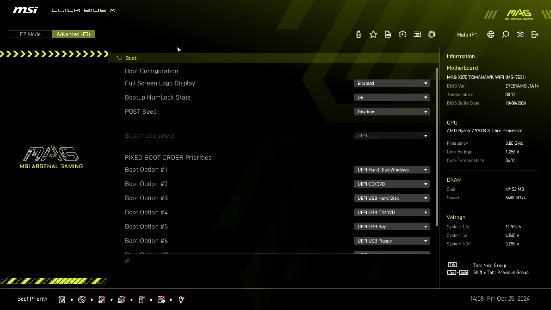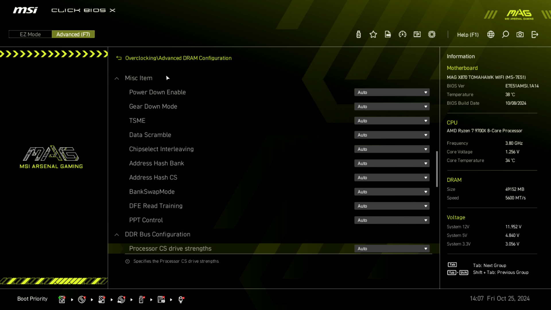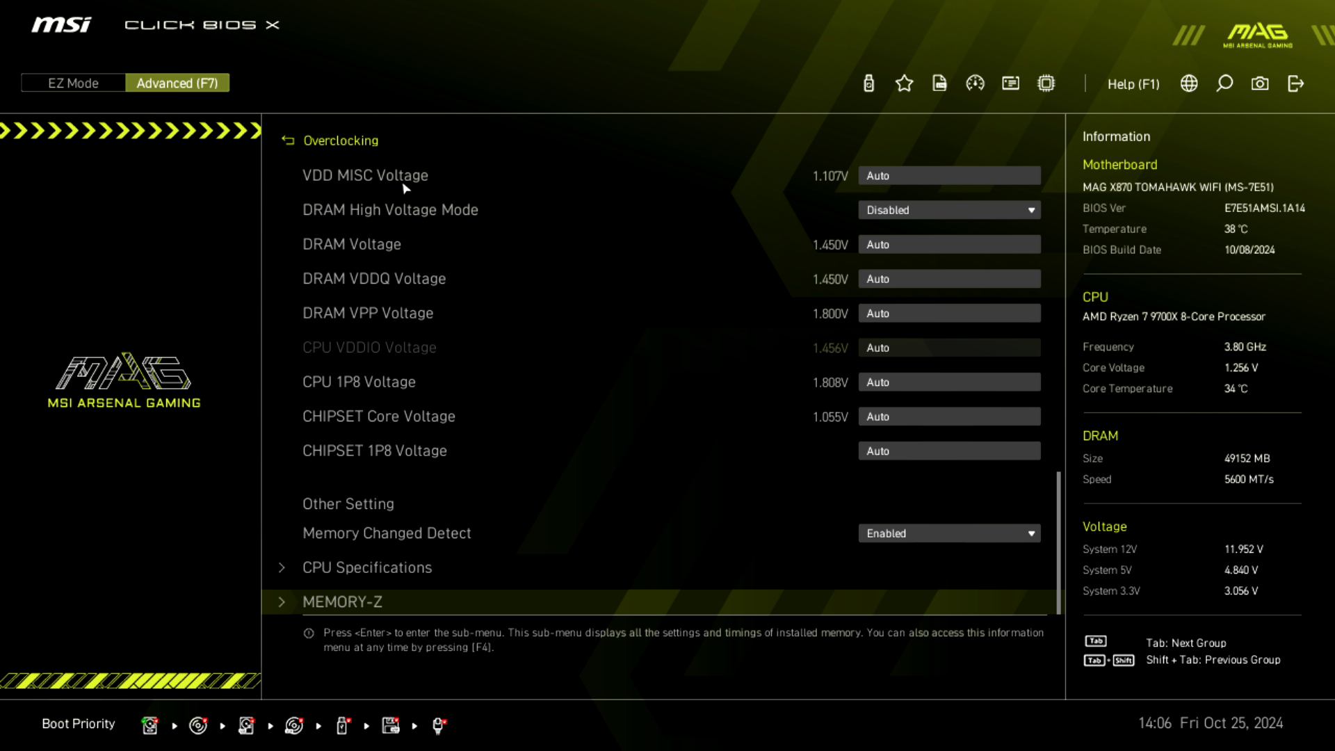 - материнська плата: MSI MAG X870 TOMAHAWK WIFI (UEFI 1.A14, AGESA 1.2.0.2);