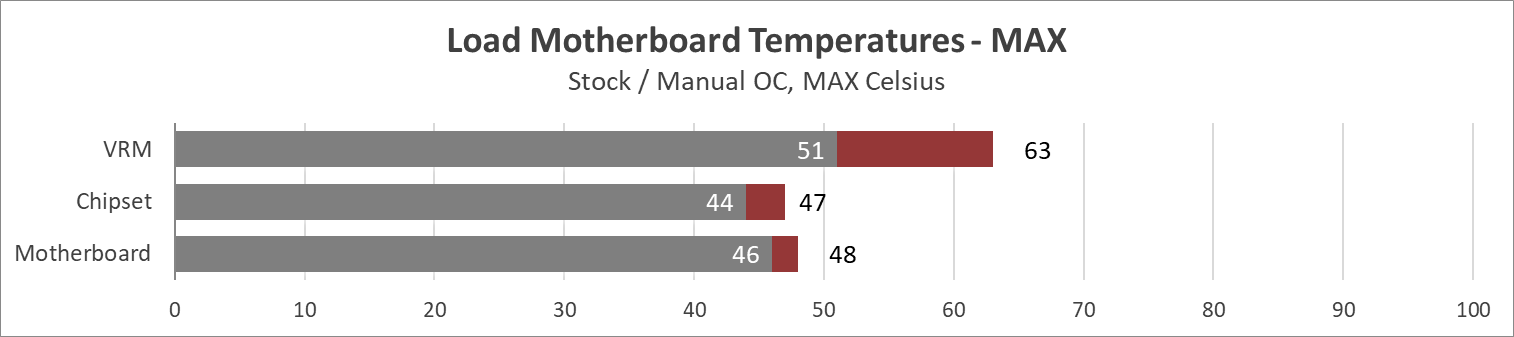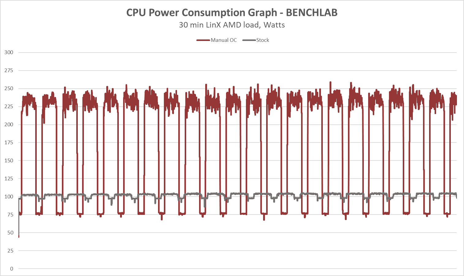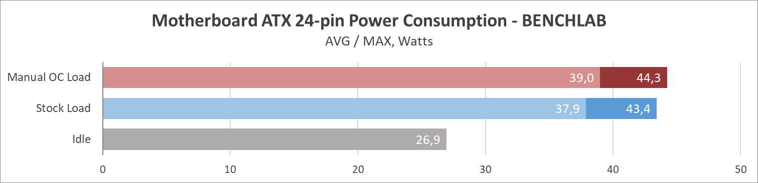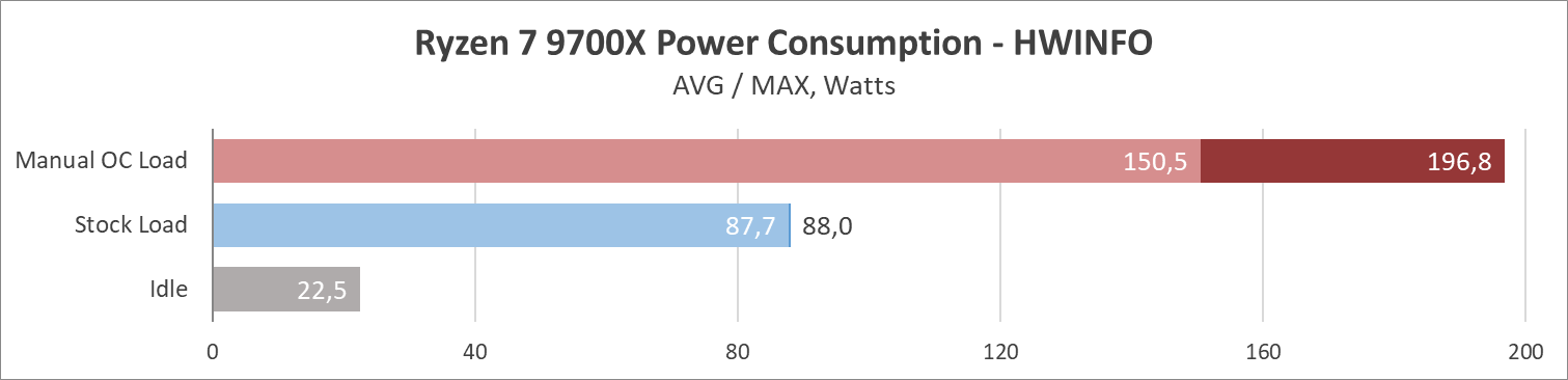 Будучи платою mainstream-сегменту вона без проблем співпрацює з відповідним 8-ядерним процесором. Запас міцності, навіть з урахуванням розгону, присутній, тож потенційно ніщо не заважатиме комбінувати старші процесори, і бавитись в оверклокінг і з ними. Переходимо до споживання та температур у вигляді графіків: