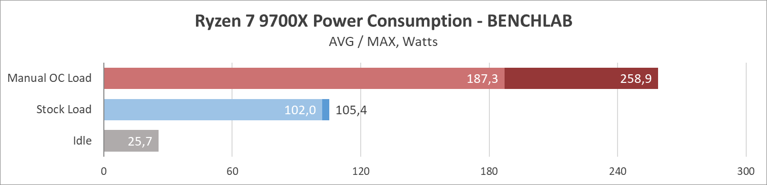 Температура в приміщенні утримувалась на рівні 20 градусів за Цельсієм. Вимір енергоспоживання процесора відбувався через прямий замір EPS12V за допомогою BENCHLAB (опитування датчика кожні 100 мс). Вимір температури фіксувався за програмними датчиками HWINFO, а також з термофото, що було виконано тепловою камерою UNI-T RX-600. Тест являв собою забіг 30 хвилин LinX 0.7.0 AMD (problem size 46290). Кожен бенчмарк запускався п'ять разів, у результатах зазначено середнє арифметичне. Ігри тестувались на заводських пресетах мінімальної якості в стандартних бенчмарках. Counter-Strike 2 тестувався на мапі майстерні CS2 FPS BENCHMARK.