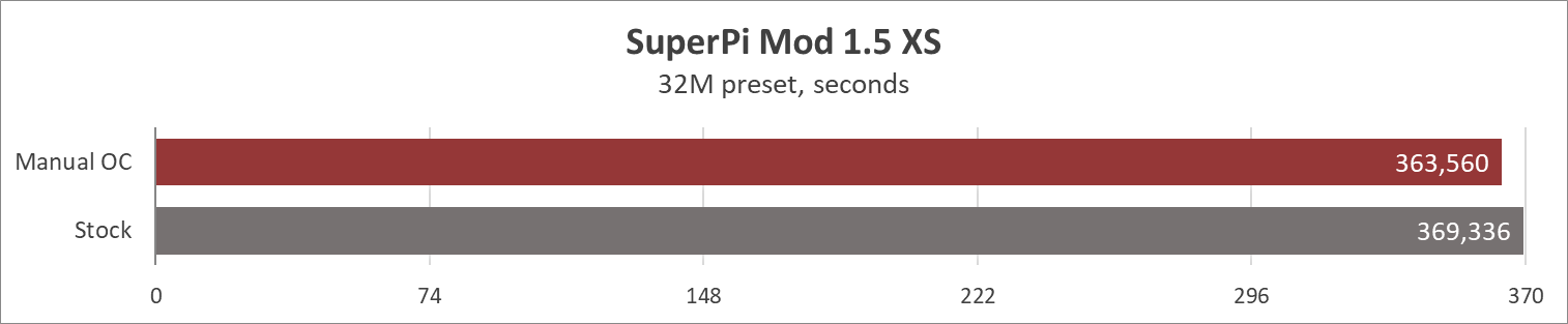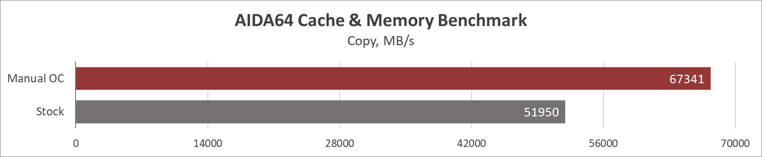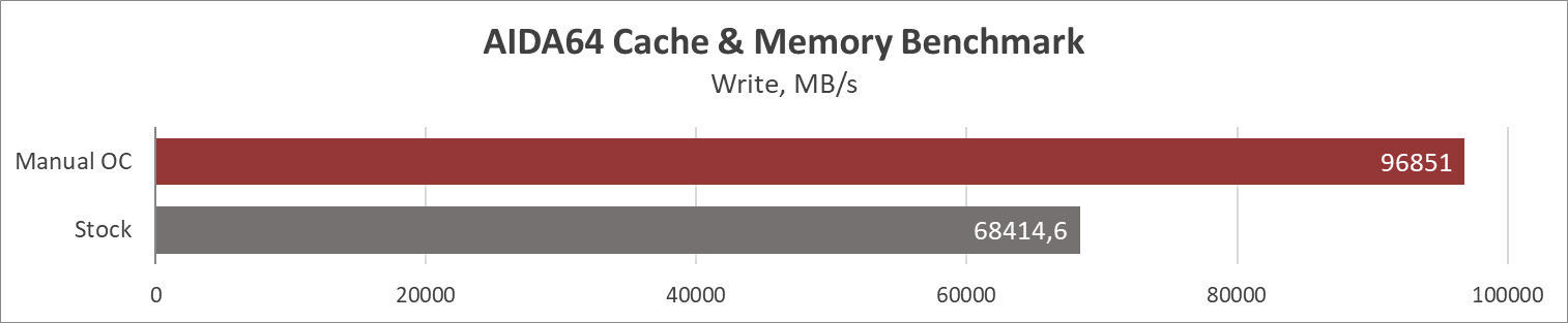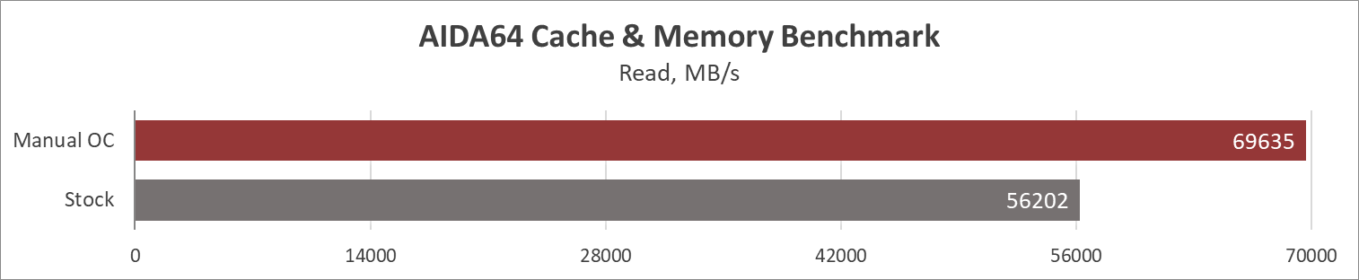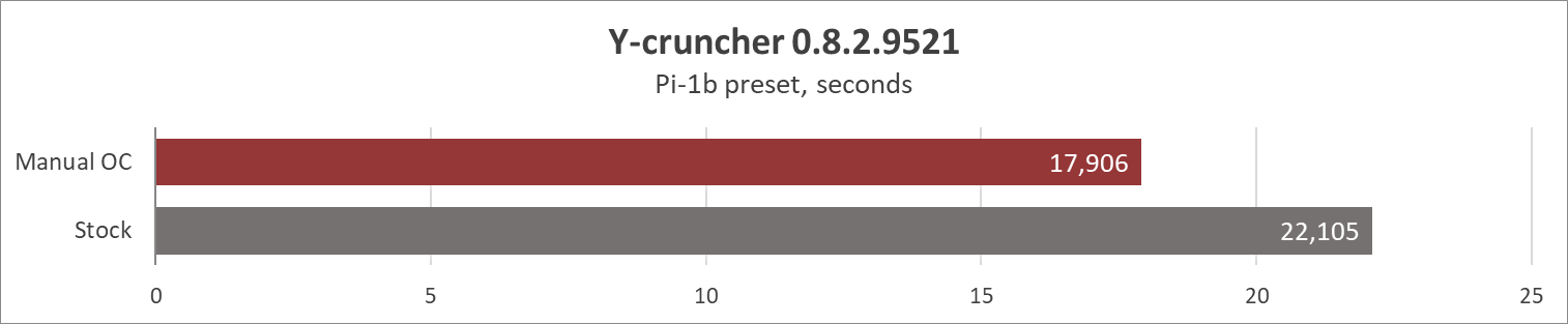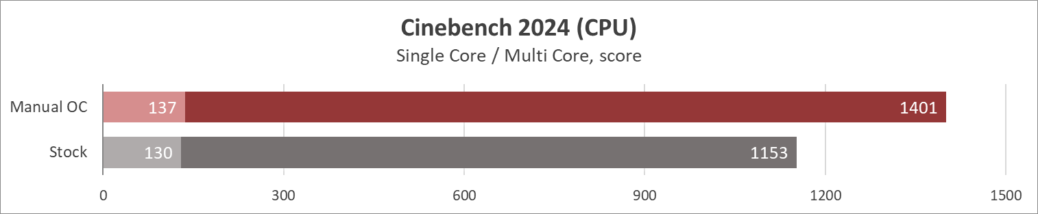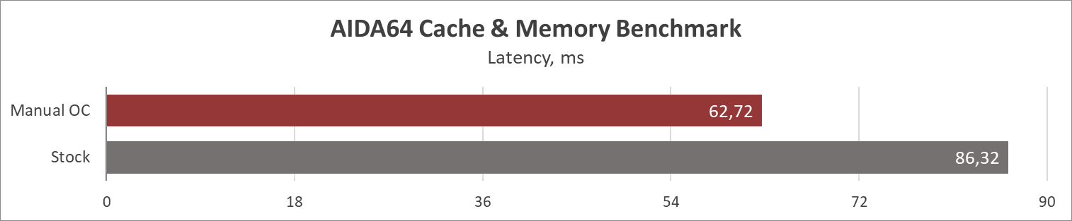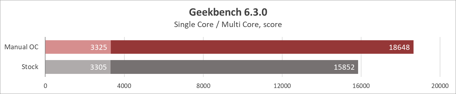 В умовах розгону без цих ваших систем безпеки плата ідеально, без жодного натяку на дрейфування чи тротлінг, тримала 5425 МГц на всіх ядрах протягом всього часу тесту. Як нескладно здогадатись плата готова форсувати систему і далі, однак процесор став стримувальним фактором.