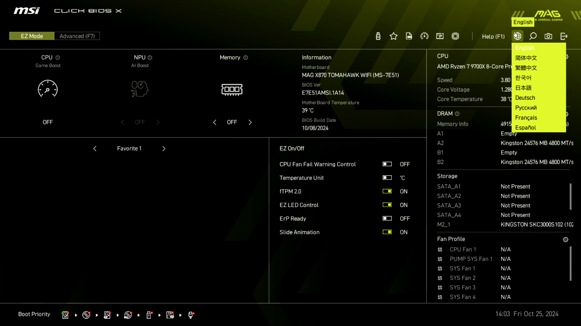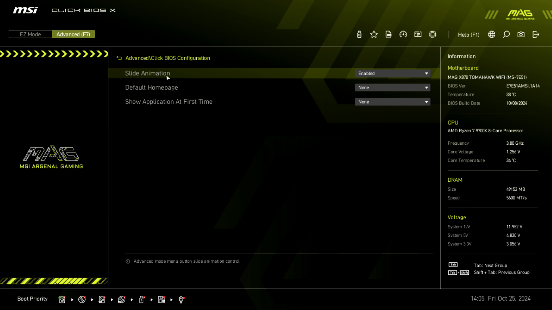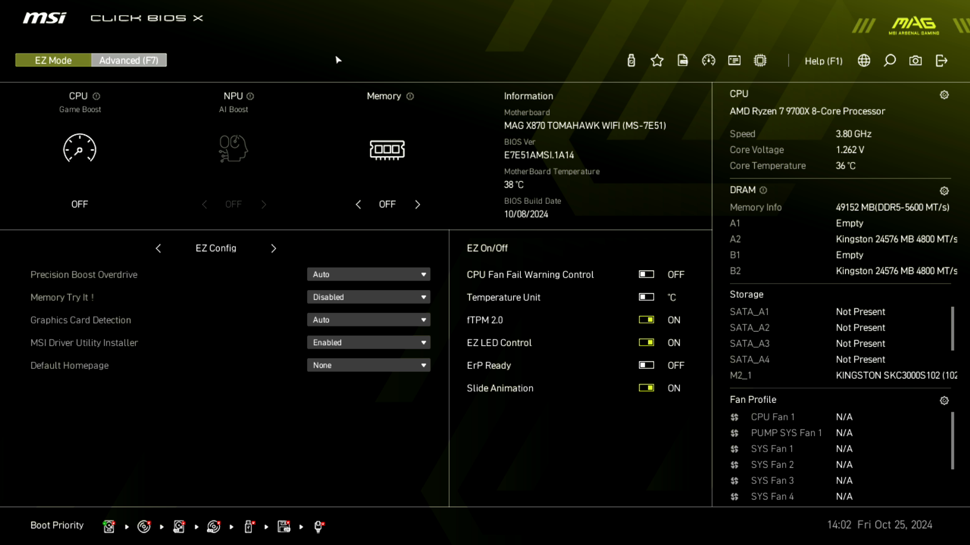 Рекомендуємо читачу затриматись тут, адже MSI вирішила оновити свій інтерфейс керування материнською платою. MAG X870 TOMAHAWK WIFI керується MSI Click BIOS X та традиційно може оперуватись у двох режимах: EZ Mode та Advanced Mode. Почнемо з першого: