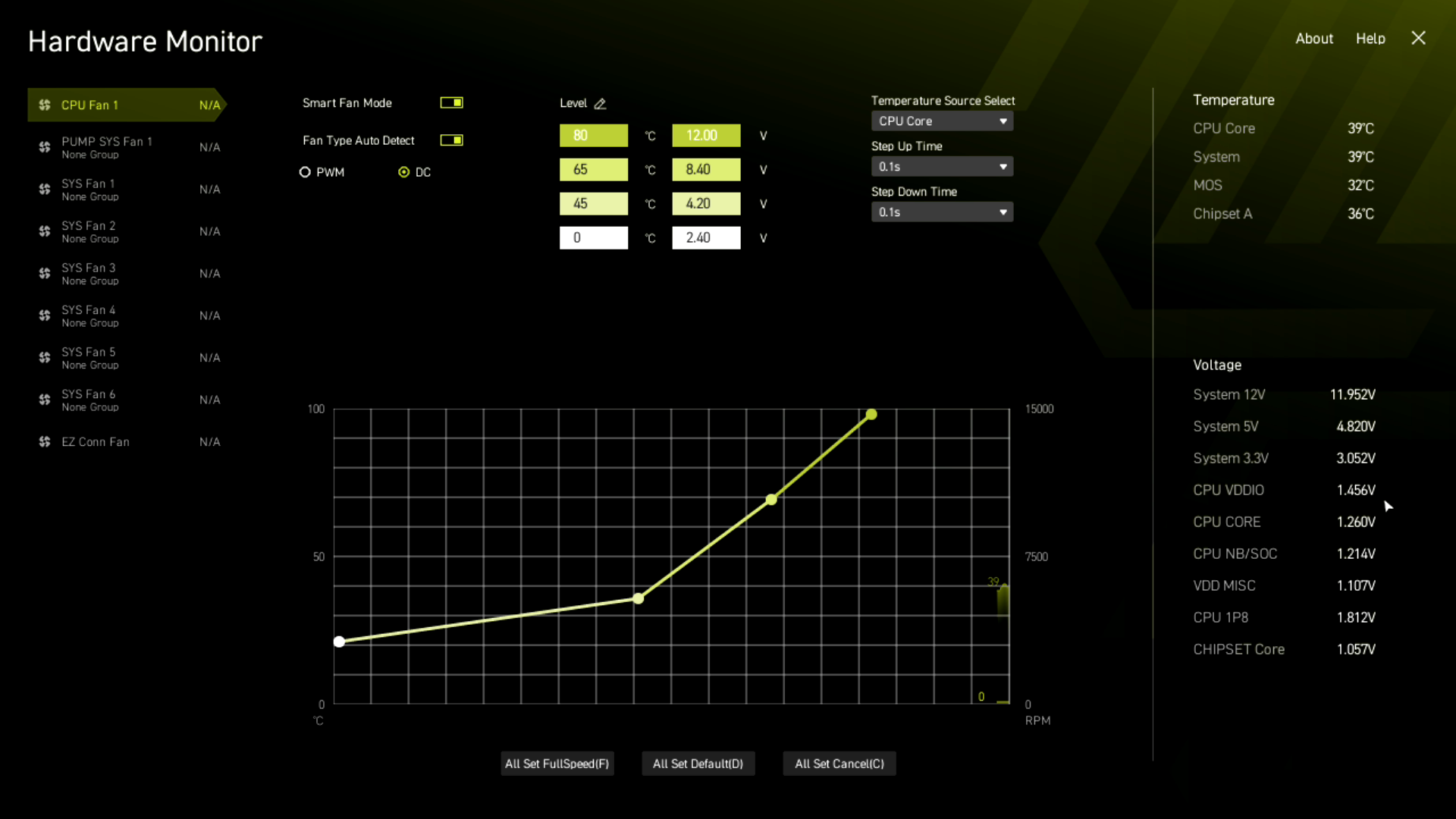 | Chipset Core Voltage (V) | 0,85–1,5 | 0,01 |