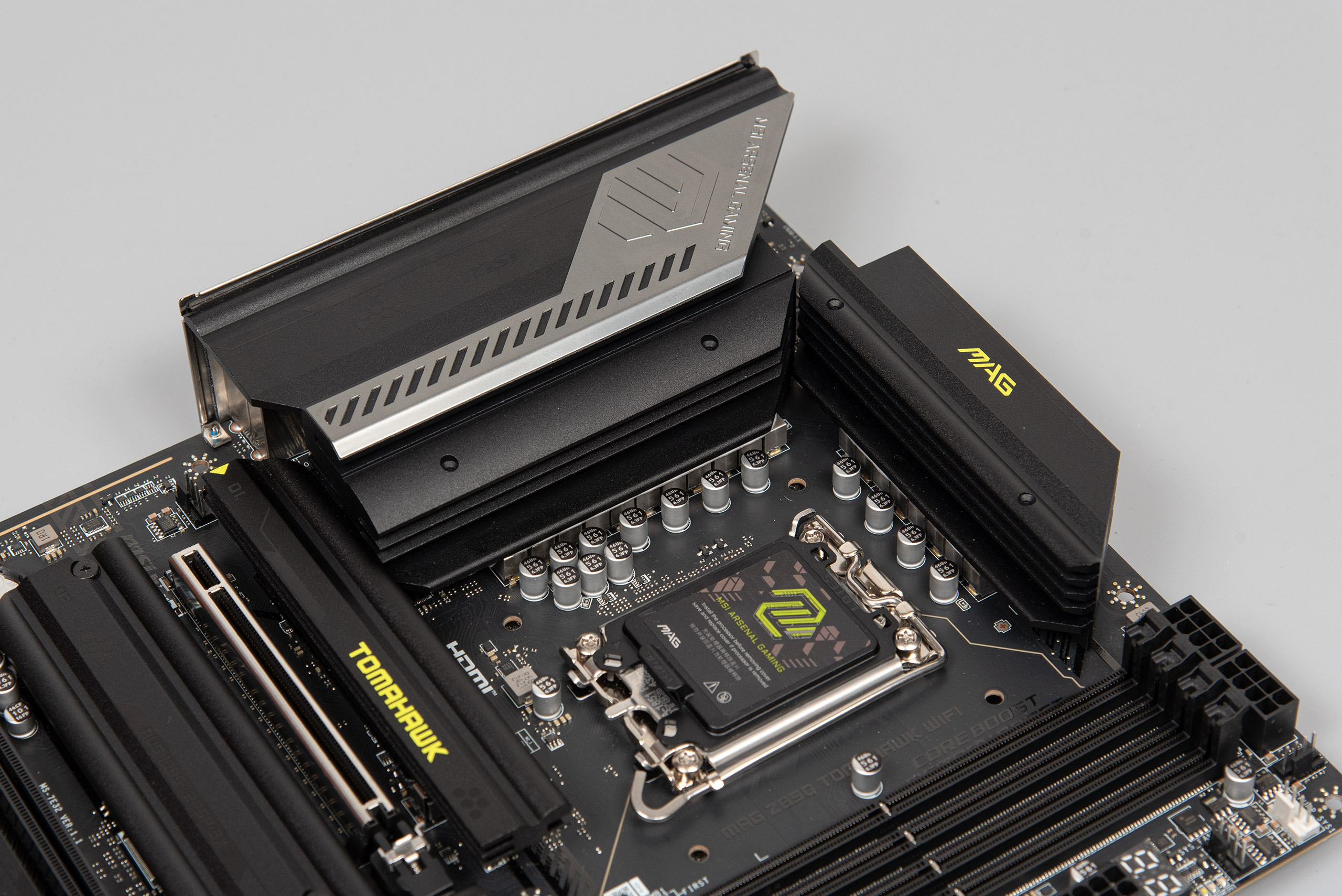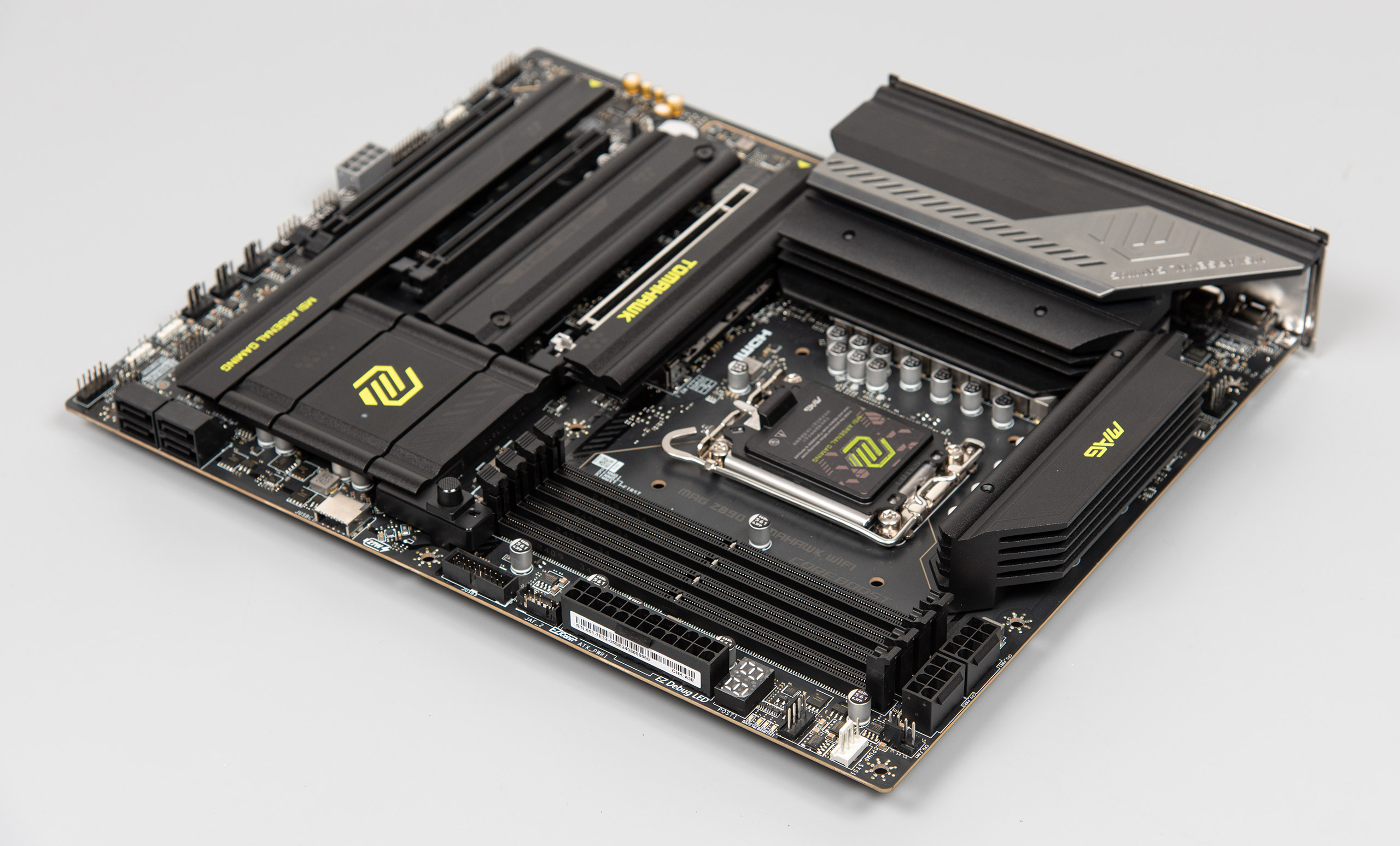 Материнська плата виглядає стандартно для серії продуктів TOMAHAWK, використовується гама темних відтінків з лаймовим як акцентуючим. Помітна частина текстоліту накрита різноманітними радіаторами.