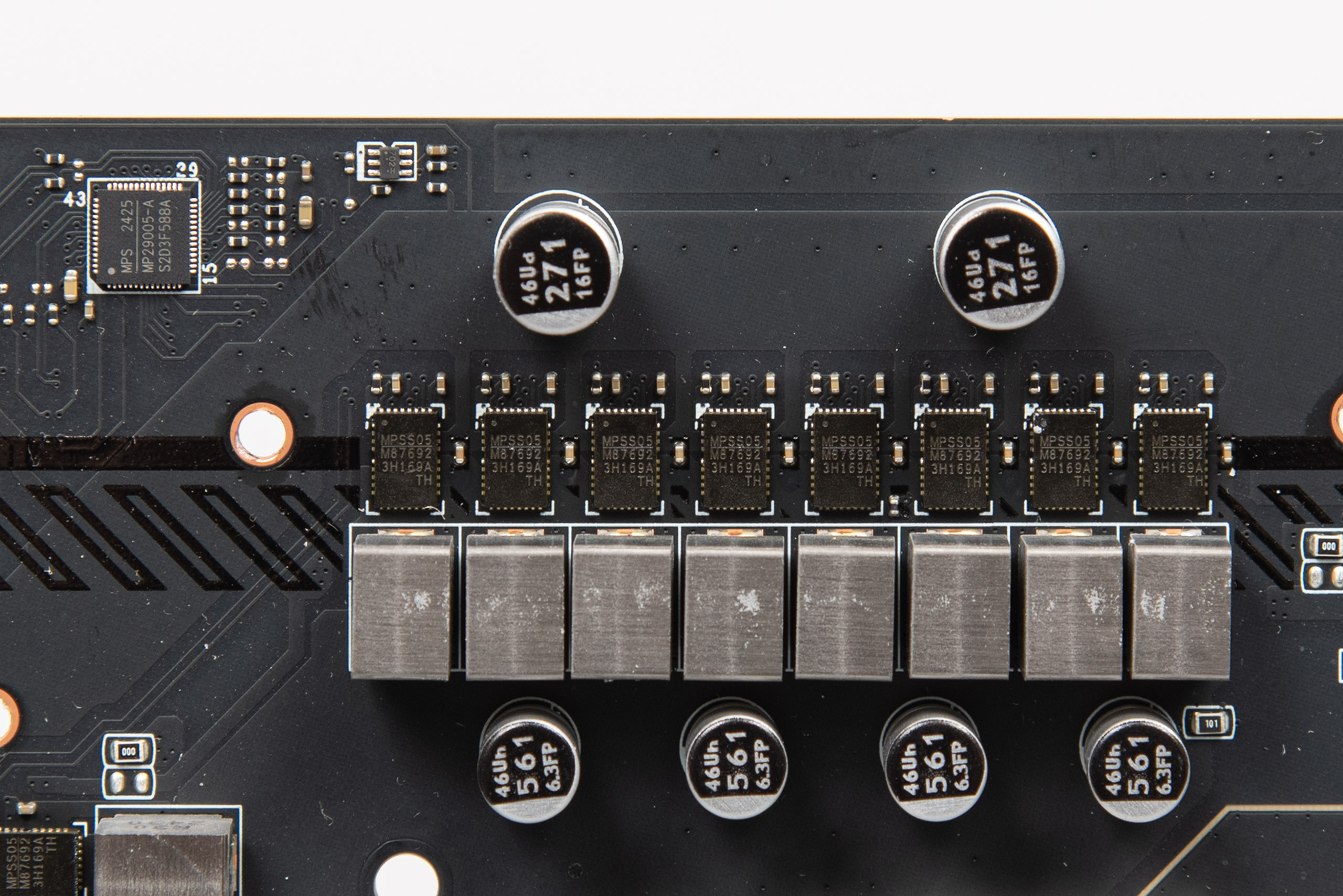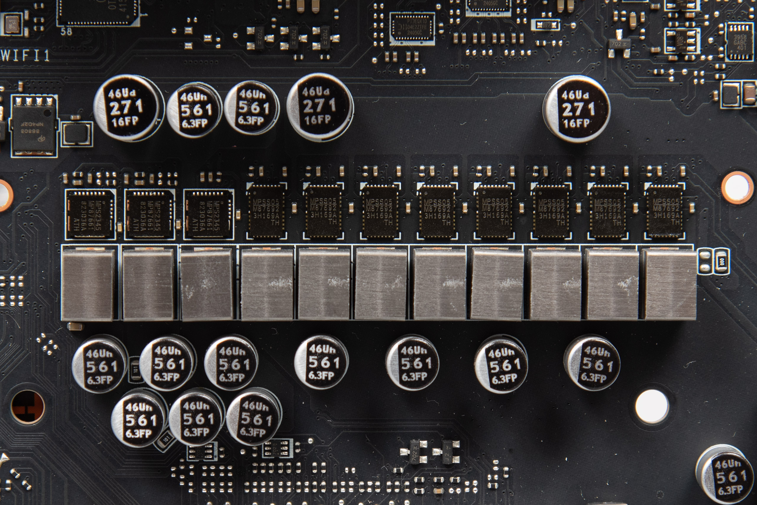 Силова підсистема живлення побудована за схемою 16+1+1+1 (VCPU+SA+GT+VNNAON). Керування цим хазяйством делеговано ШІМ-контролеру Monolithic Power Systems MP29005‑A. Процесорна група представлена 16 силовими елементами MPS M87692, що розраховані на 90 А. Інші вузли мають по одному власному MPS MP87661 на 60 А. Живлення процесора забезпечується двома типовими конекторами EPS12V, однак слід звернути увагу, що ці самі конектори зміщені праворуч — вони знаходяться біля слотів оперативної пам’яті.