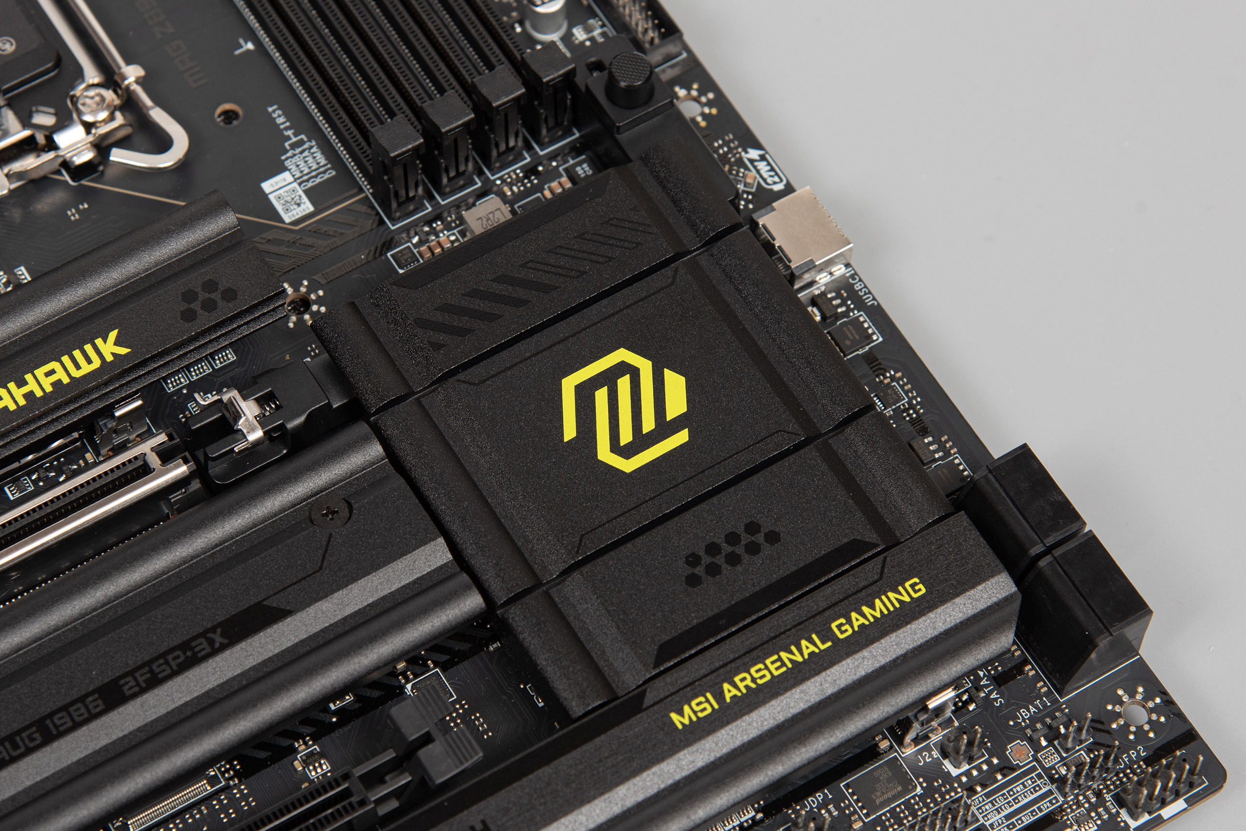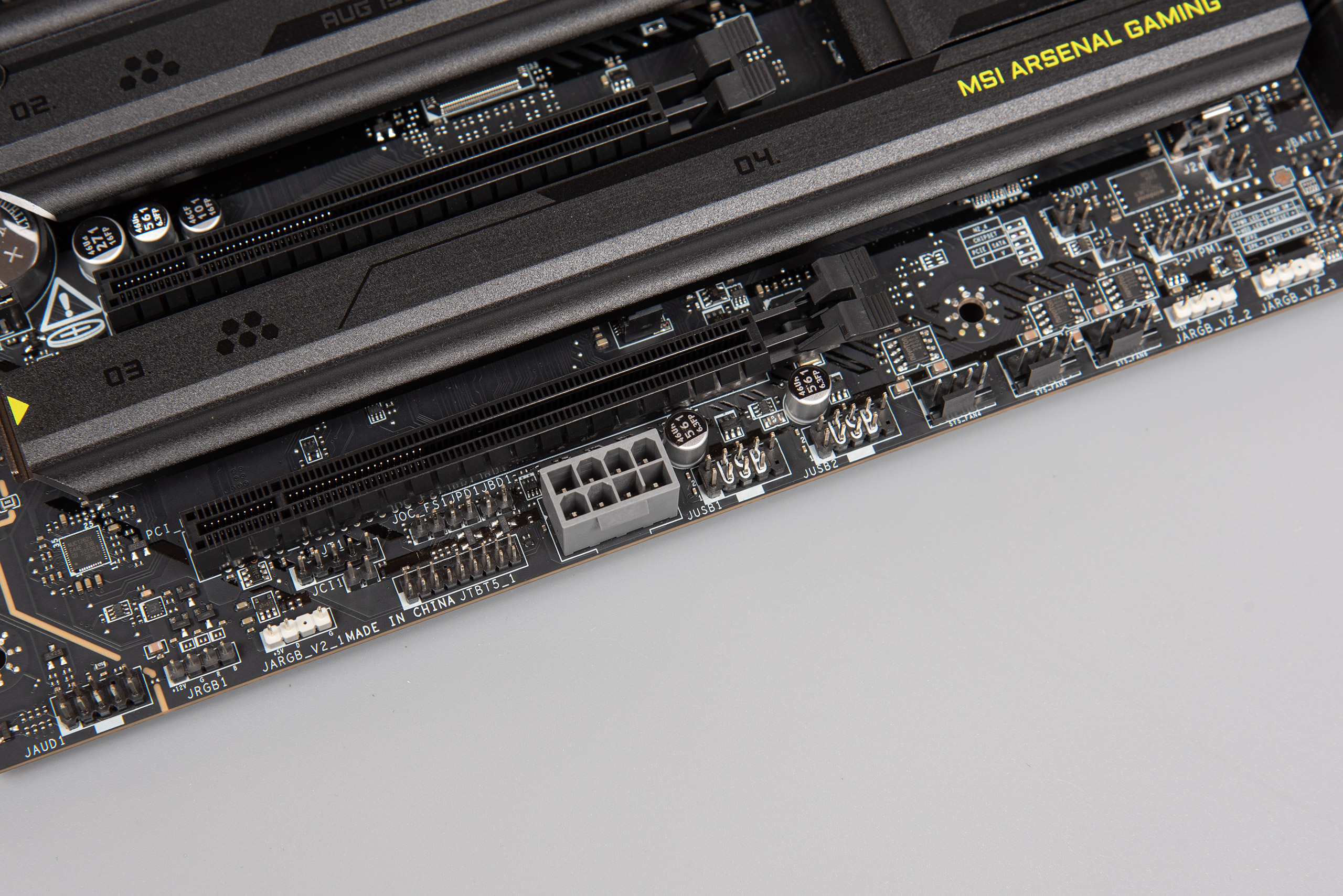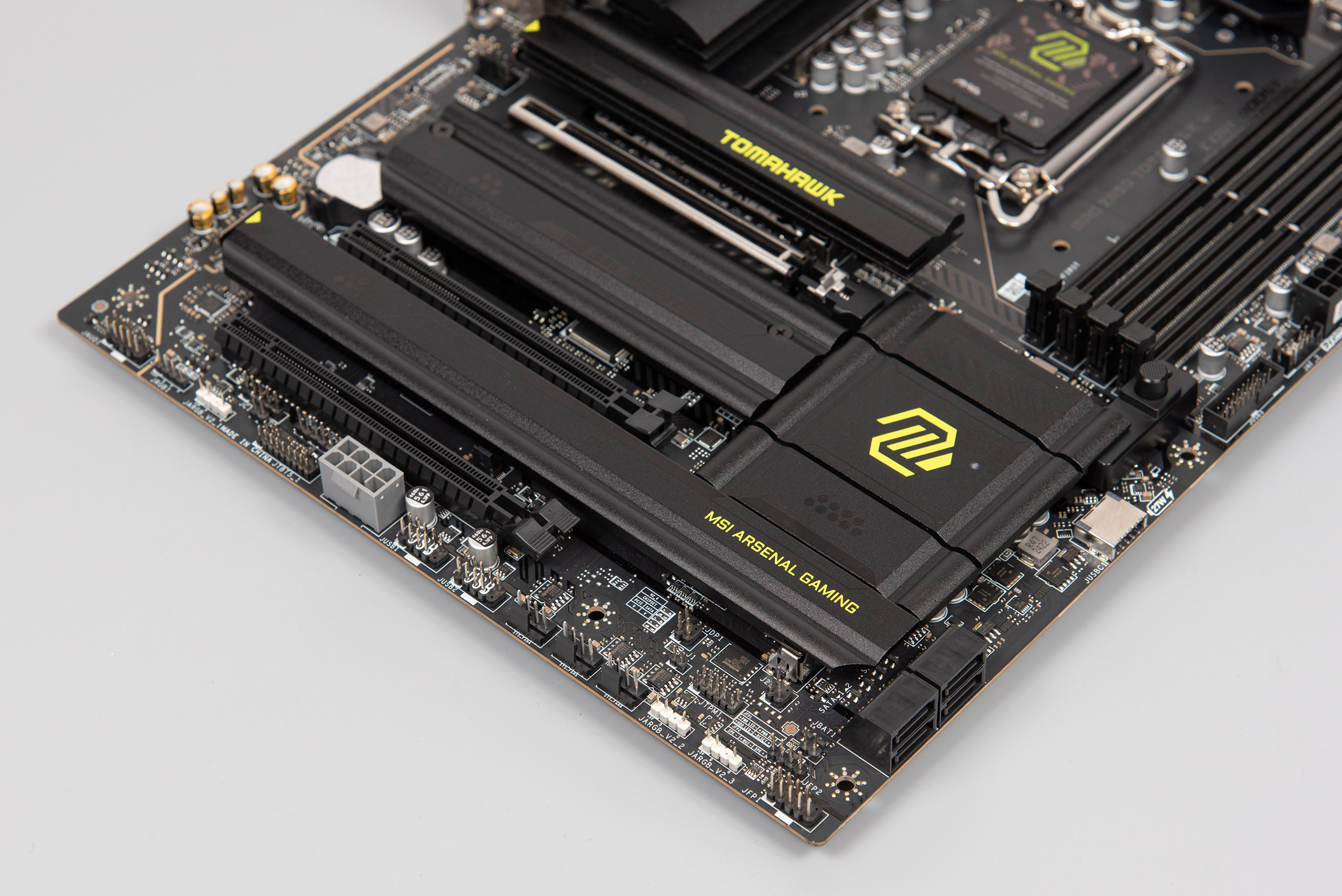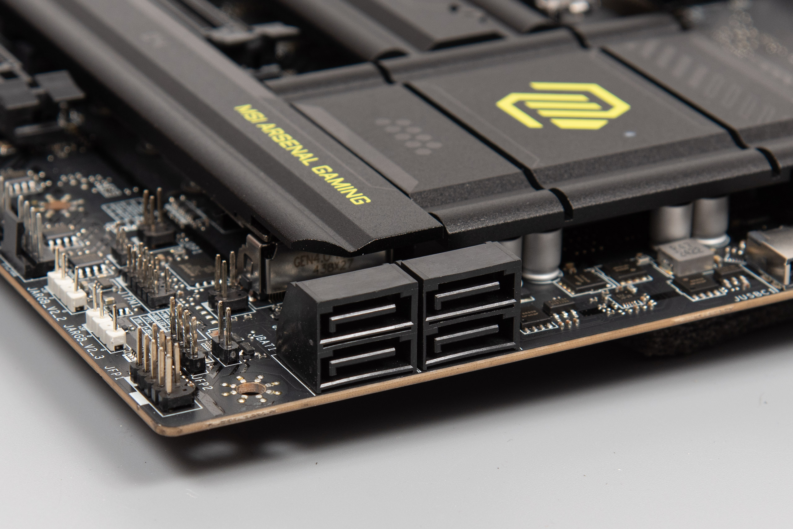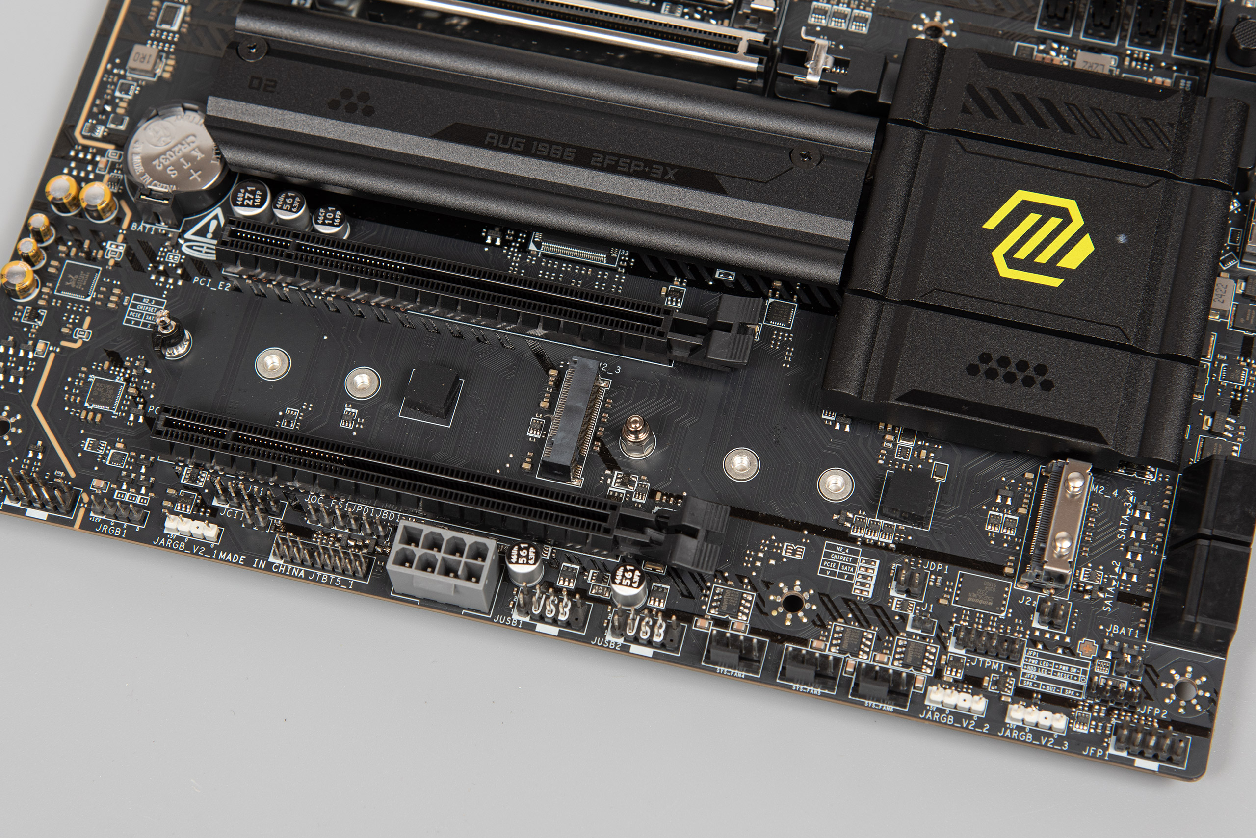 Праворуч розташовано три конектори вентиляторів, два конектори JARGB_V2 (RGB 5 V), джампер CLEAR_CMOS, конектор TPM, а також традиційна контактна група FRONT_PANEL.