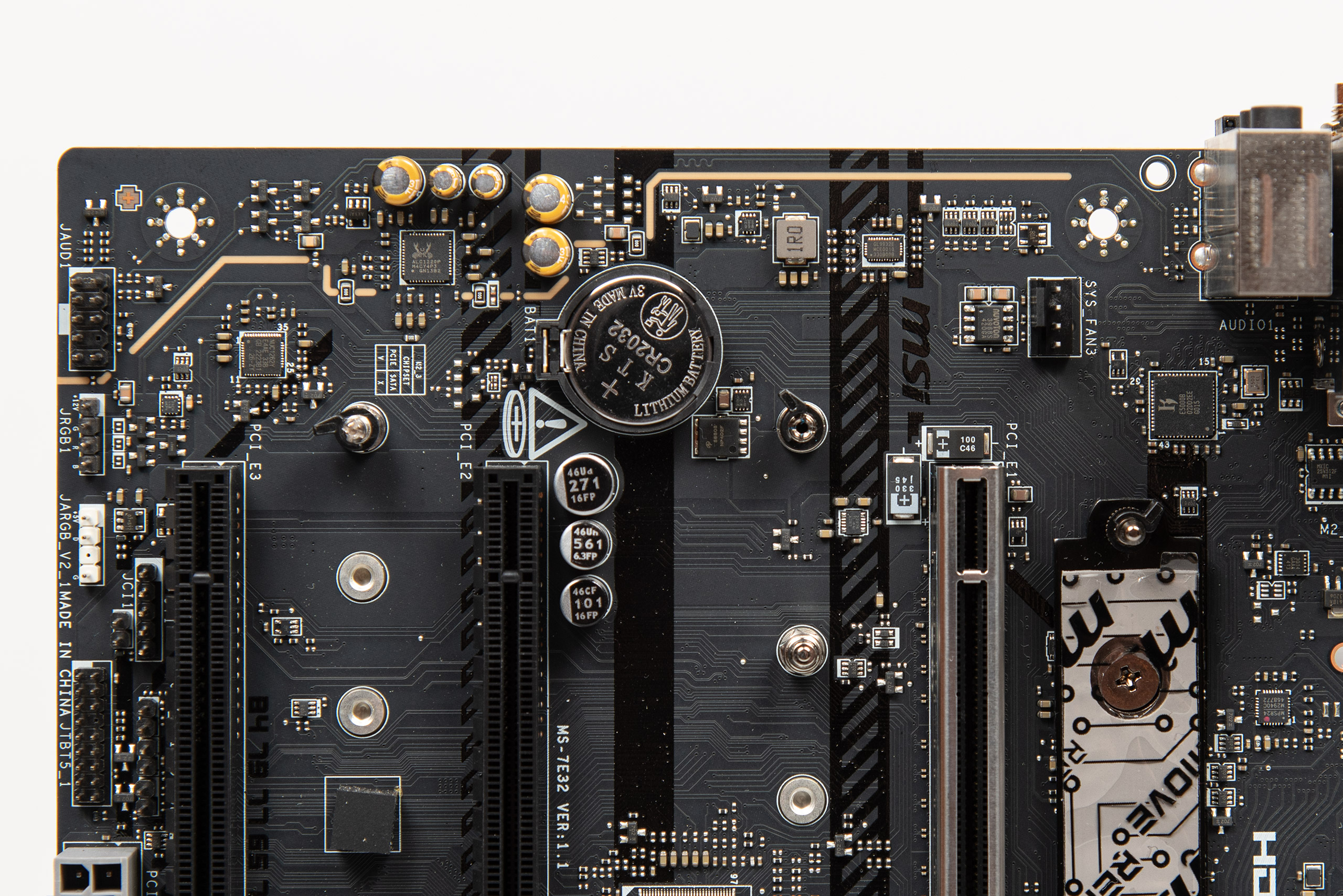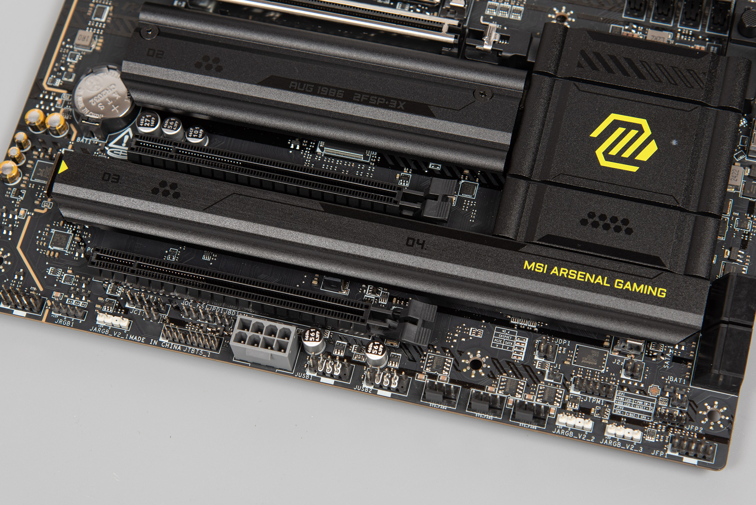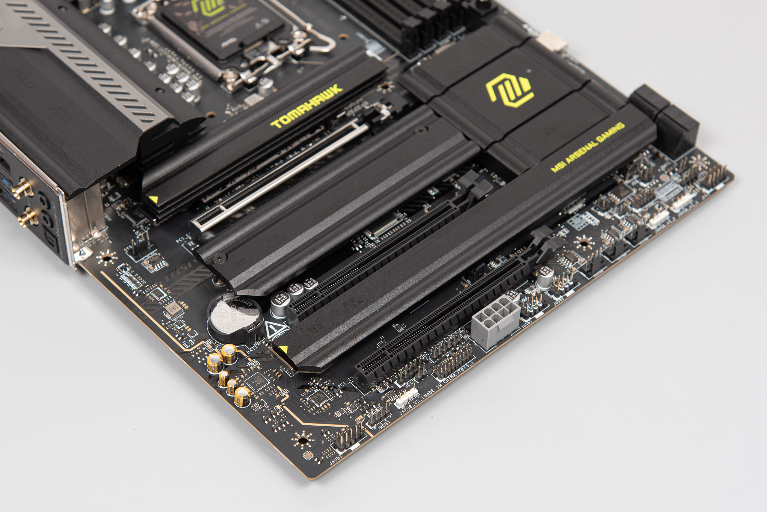 Тепер перейдемо до контактних груп й інших елементів на текстоліті. Біля зони I/O присутній роз’єм вентилятора, а біля другого слота розширення PCIe знаходиться CMOS-батарейка. Вона збереже пряму доступність, якщо використовується відеокарта не вище двох слотів. Знизу ліворуч розташовано контактну групу HD_AUDIO, конектор JRGB1 й JARGB_V2 (RGB 12 V й 5 V), контактну групу JTBT5 (для підключення карти розширення Thunderbolt), конектор живлення PCIe (для роботи більших напруг і струму USB Type‑C), дві контактні групи USB 2.0, датчик відкриття шасі, а також джампер форсування функції Safe Boot.