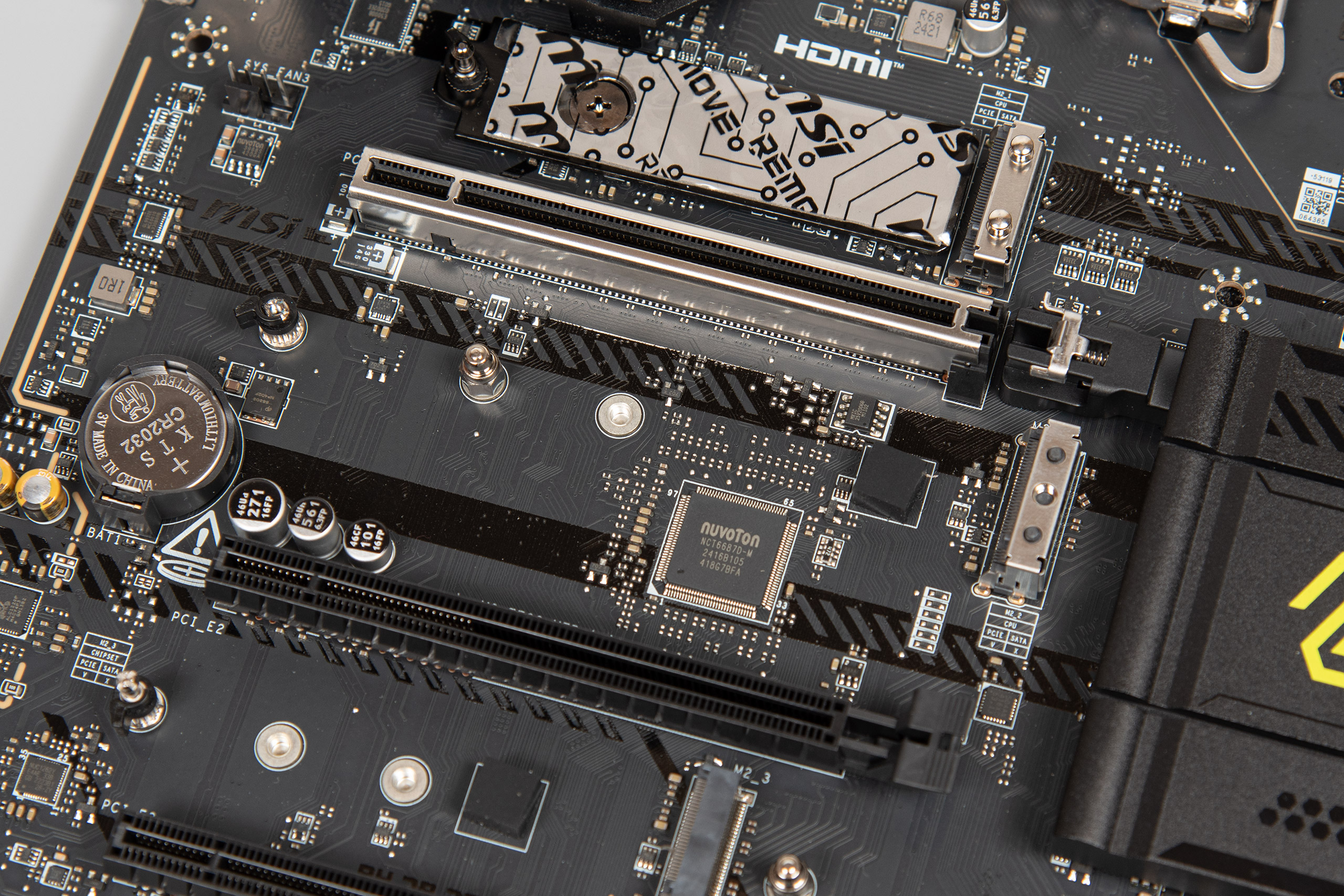- M2_3 працює на швидкості PCIe 4.0 x4. Сумісний з розмірами 2242 / 2260 / 2280 (Key M). Під’єднано до чипсета.