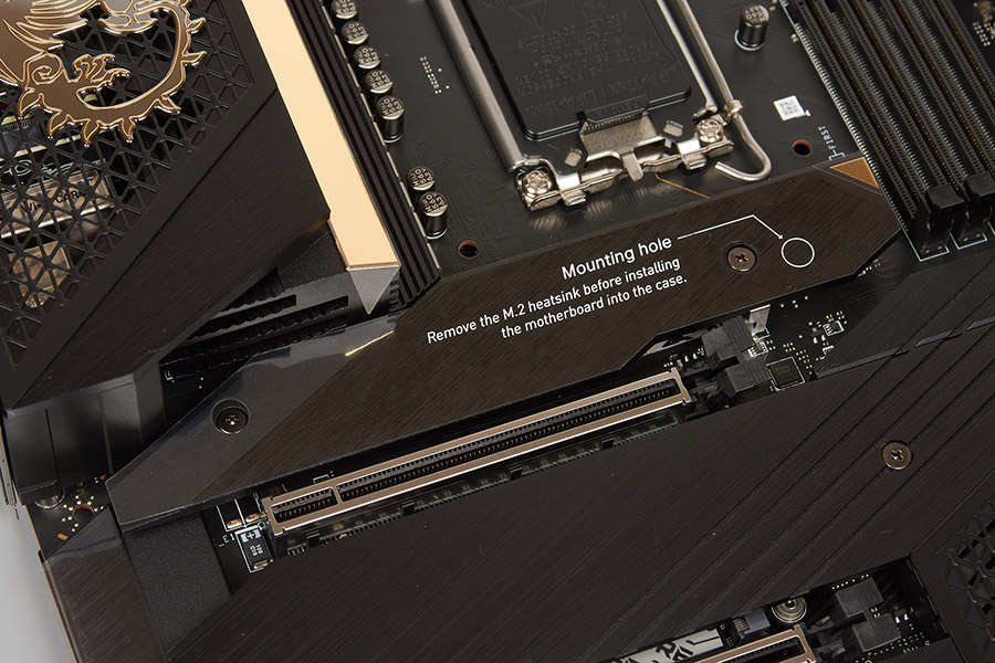 Слот M.2_1 підключений безпосередньо до процесора і забезпечує підключення PCI-E 4.0 x4. Можна встановити накопичувачі 2242/2260/2280/22110. Користувачеві також потрібно пам'ятати про те, що за радіатором знаходиться отвір для монтажу плати в корпус.