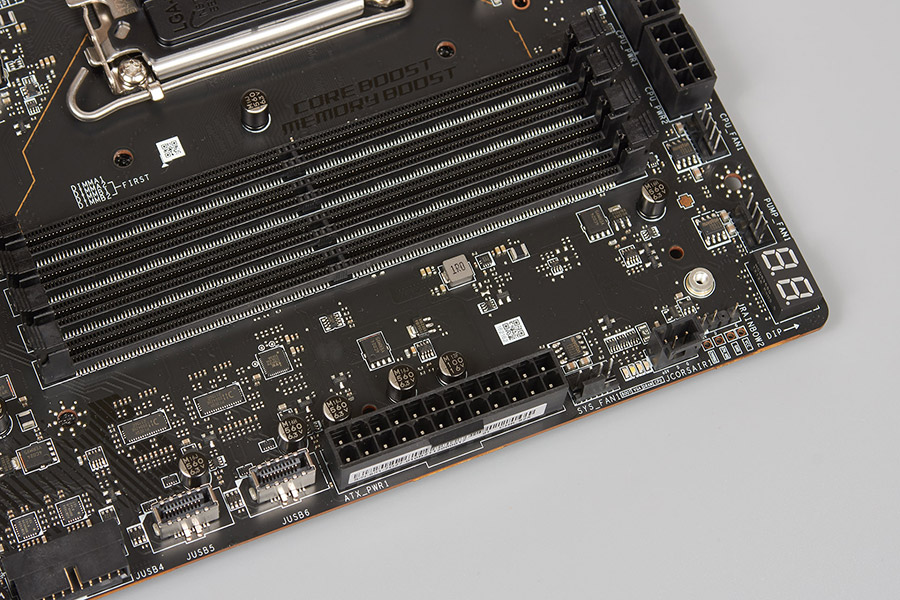 У правій частині знизу знаходяться дві колодки USB 3.2 Gen 2 (Type-C), під кутом 90 градусів дві колодки USB 3.2 Gen 1, шість SATA-портів, а в самому низу колодки скидання CMOS, датчик відкриття шасі.