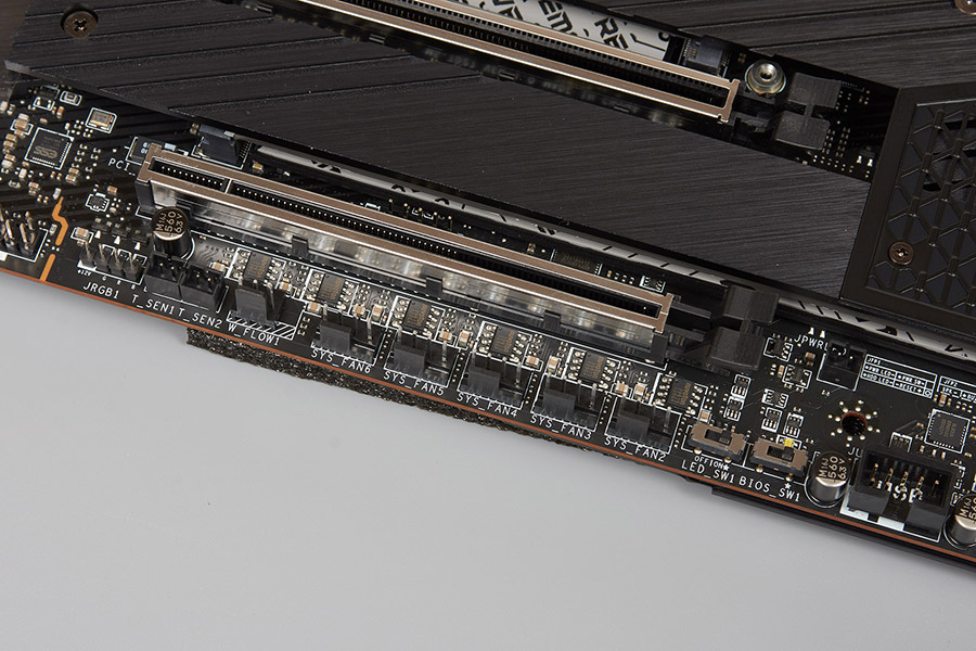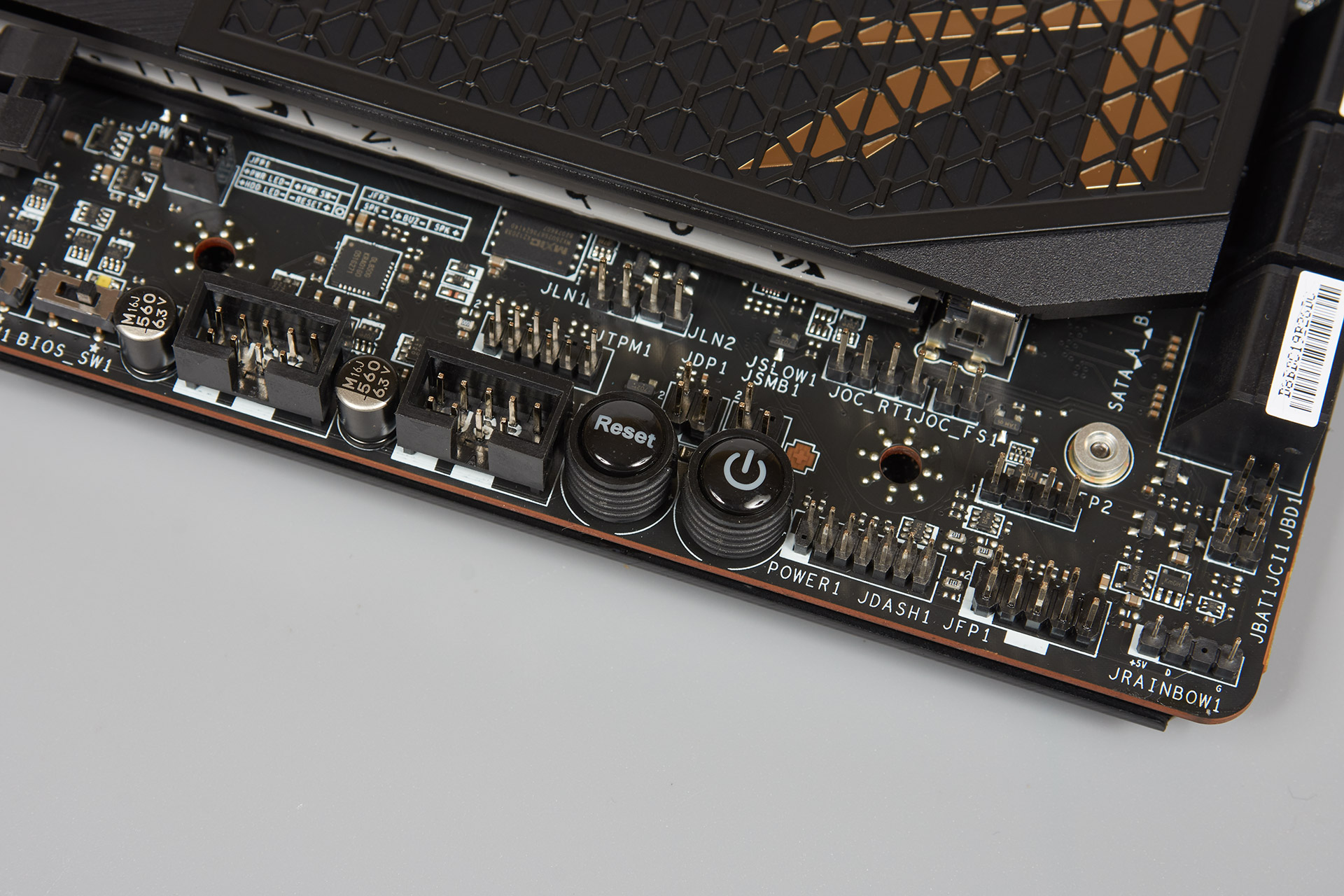 Внизу в правій частині знаходяться колодка RAINBOW LED, колодка передньої панелі, колодка екстремального оверклокінгу (режими LN2, Slow Mode, Safe Boot, Low Temperature boot проти колдбага), колодка TPM, колодка для термодатчика, кнопки включення та перезавантаження, дві колодки USB 2.0, перемикач мікросхем прошивок та вимикач підсвічування кнопок.