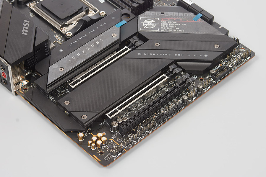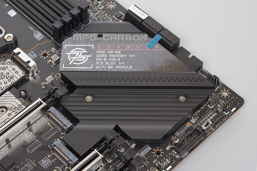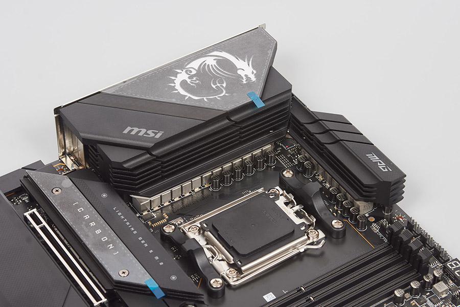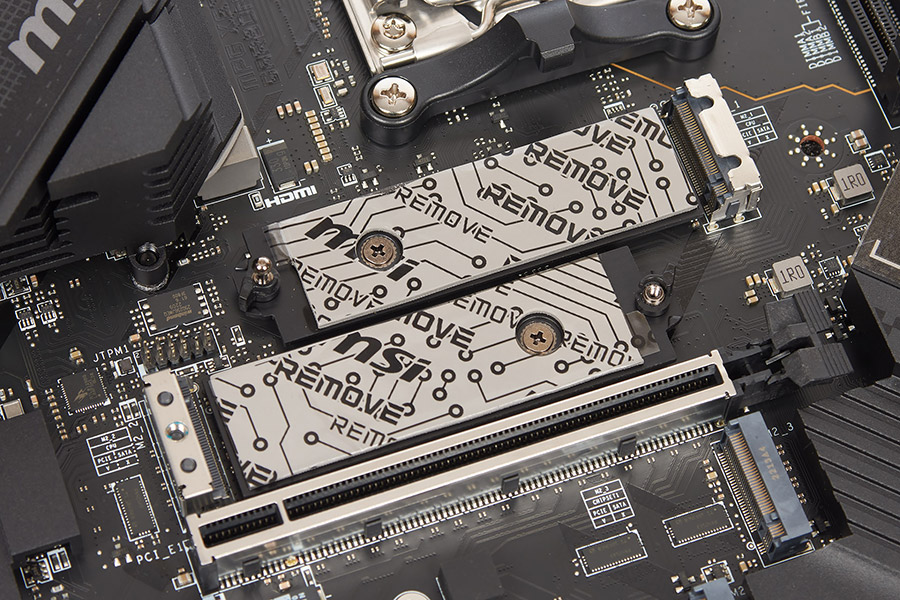 - M.2_1 працює на швидкості PCI-E 5.0 x4, розрахований для накопичувачів 2260/2280. Підключений до CPU. Додаткове охолодження зворотної сторони накопичувача.