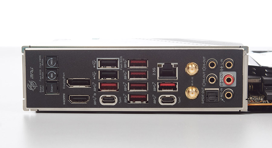 На I/O-панелі встановлена заглушка. Наявні кнопки CLR_CMOS, Flash BIOS Button для автономної прошивки, і програмована кнопка Smart Button. Функцію останньої можна налаштувати через UEFI, це може бути перезавантаження (Reset — за замовчуванням), вмикання/вимикання RGB, встановлення обертів всіх вентиляторів на 100% або Safe Boot.