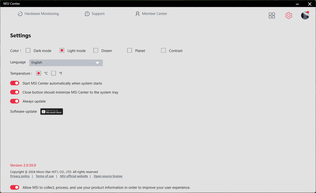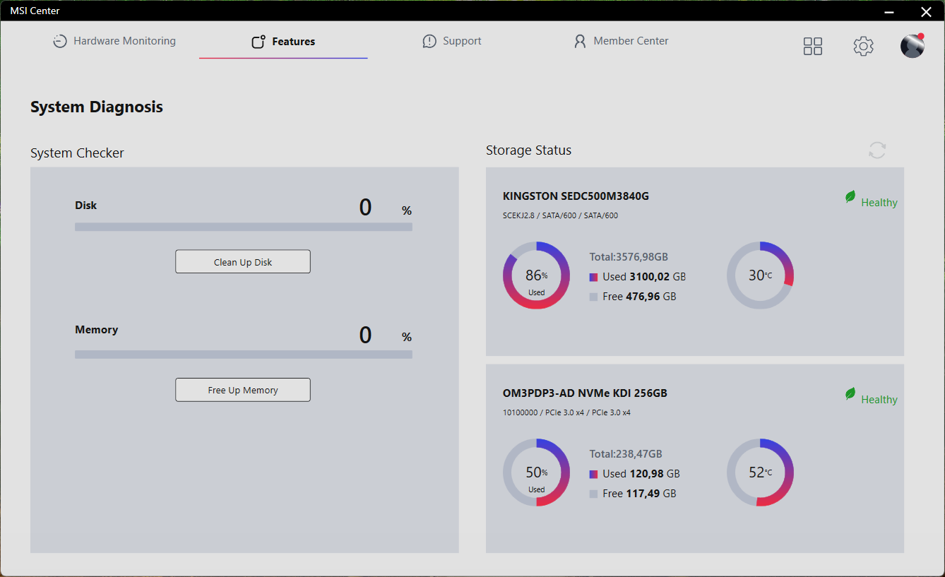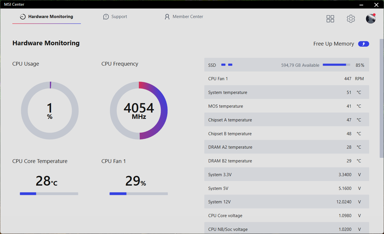 Головне ядро фірмового ПЗ виробника — MSI Center. Це модульний застосунок, який користувач самостійно налаштовує під свої завдання. Він може бути простим засобом моніторингу системи та материнської плати, але якщо необхідно — перетвориться на функціональний програмний комплекс з багатими можливостями.