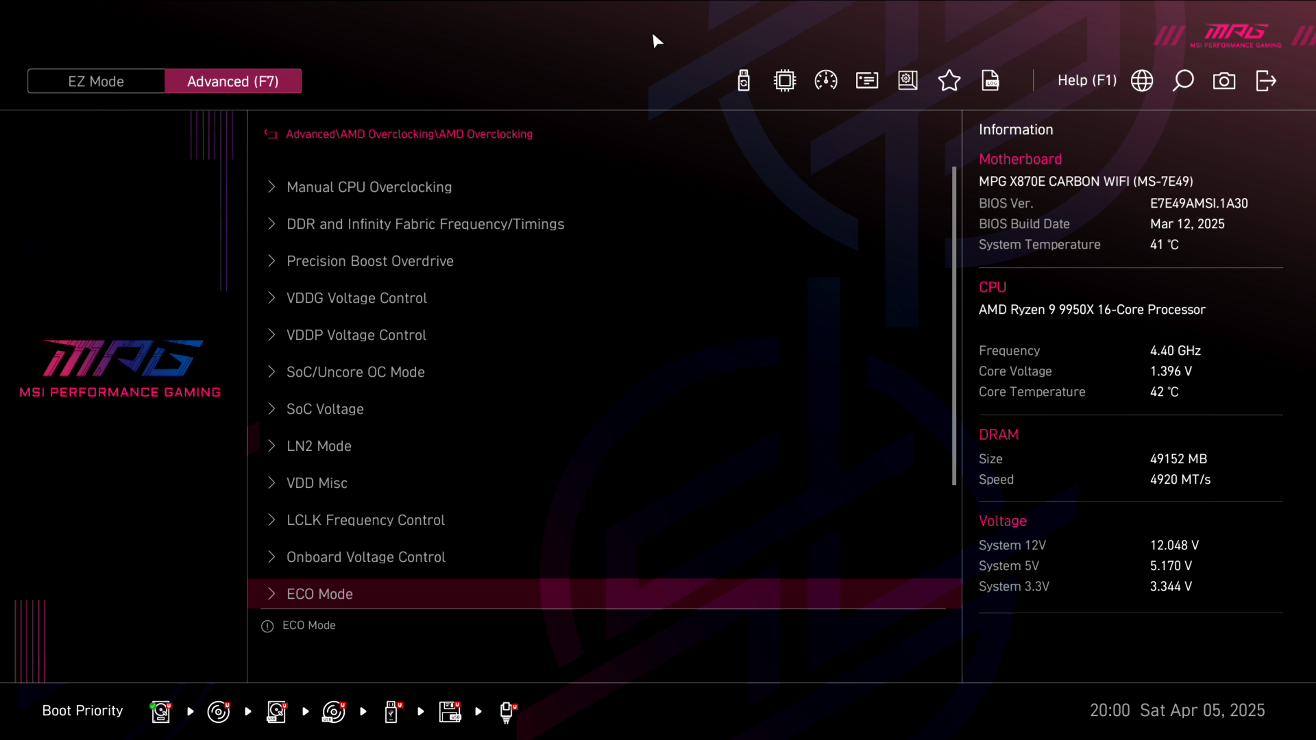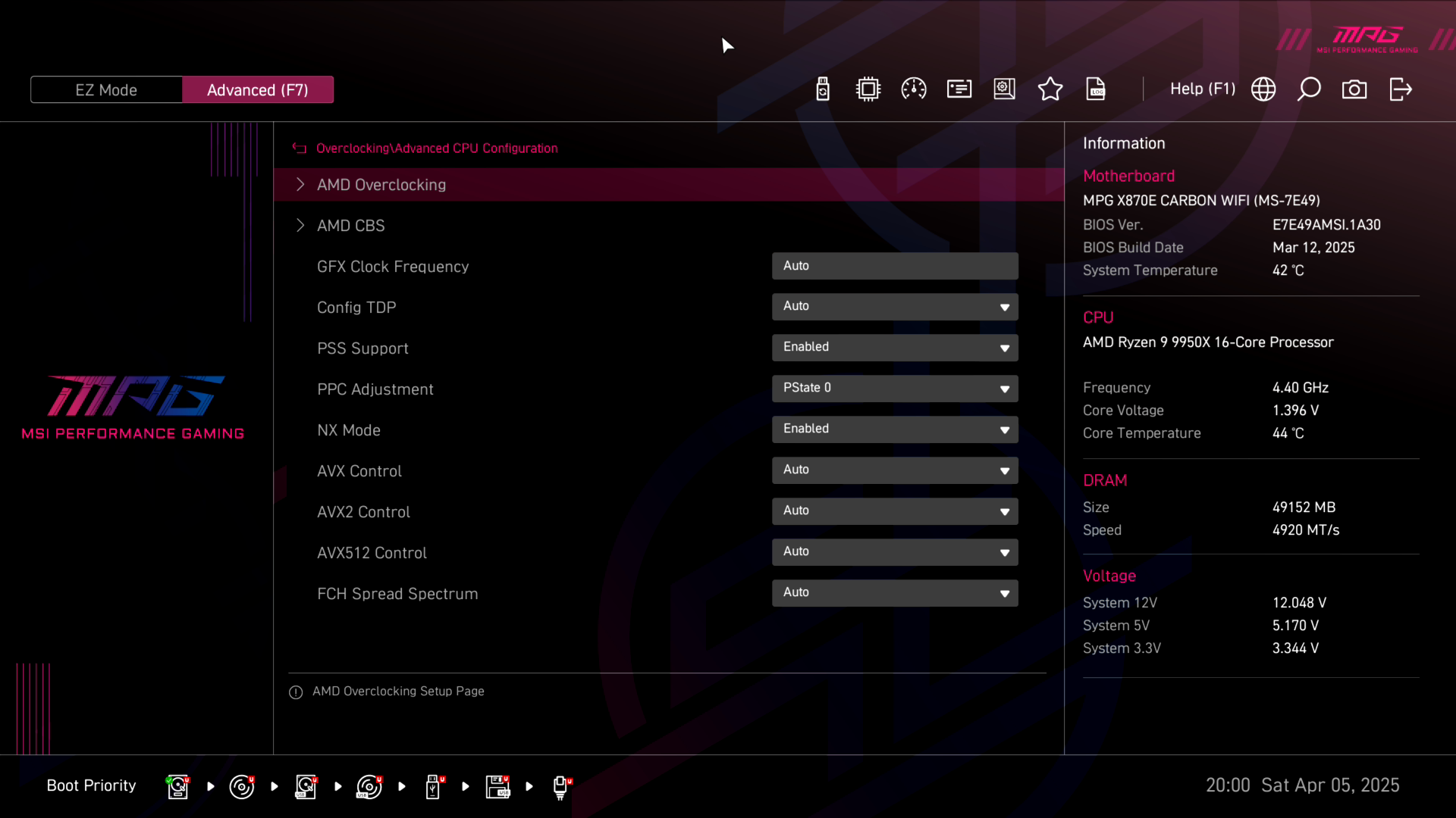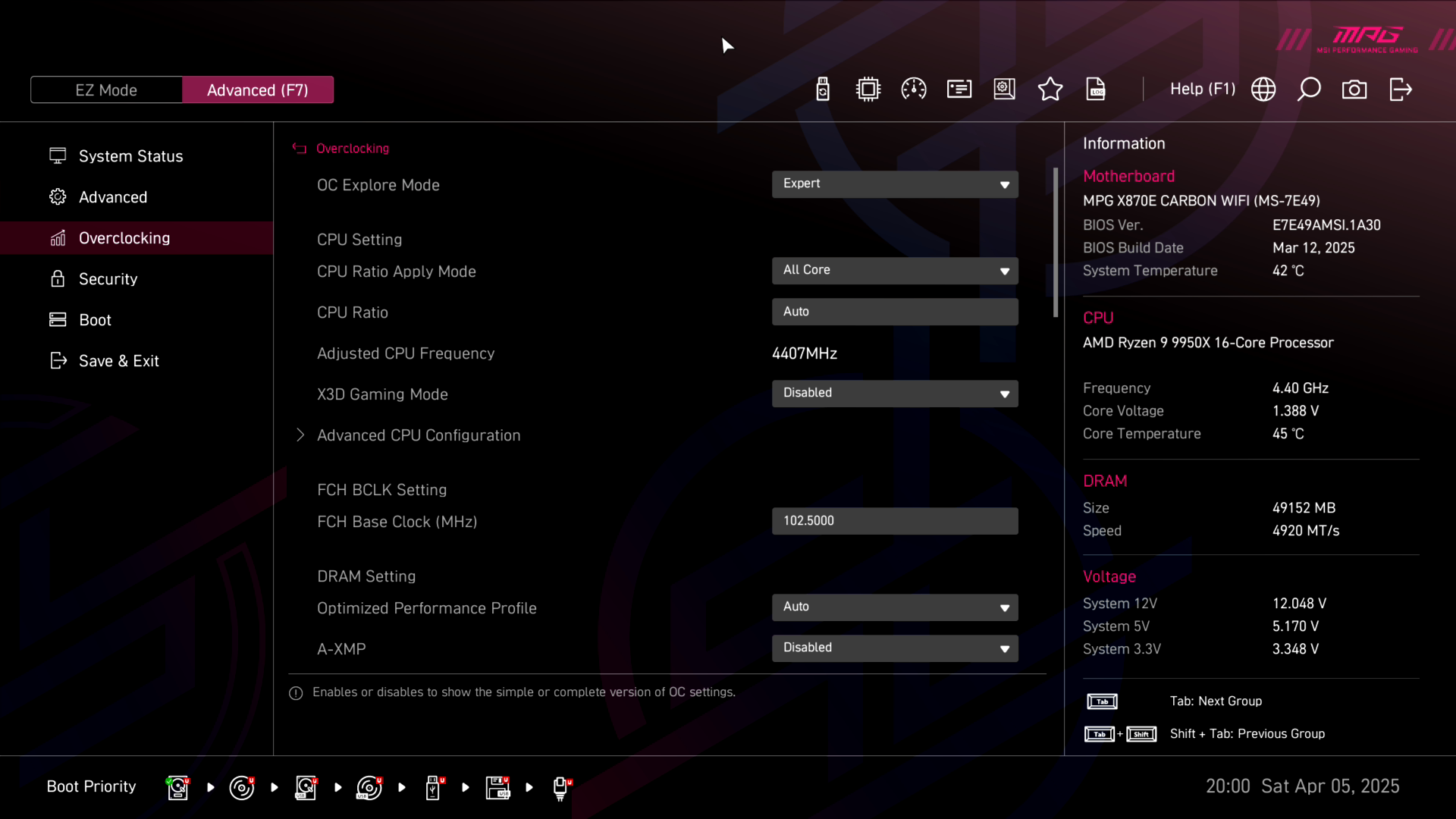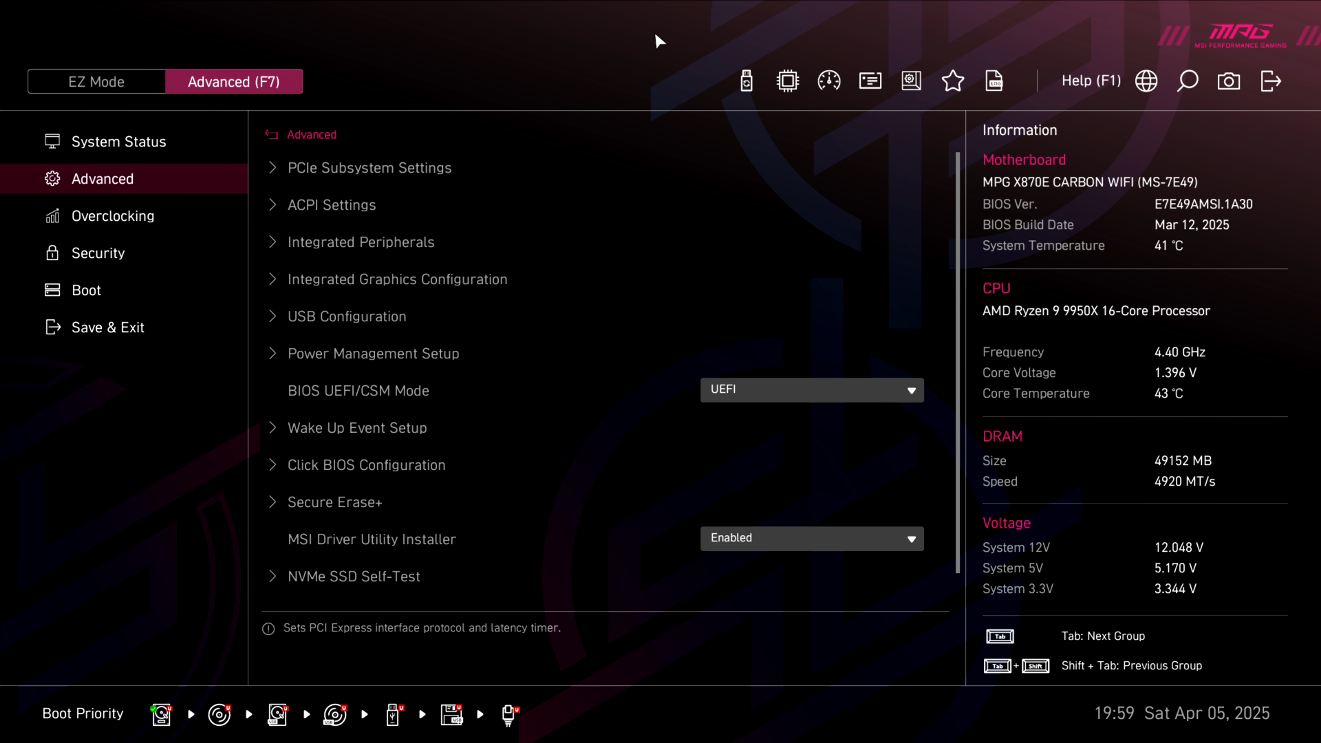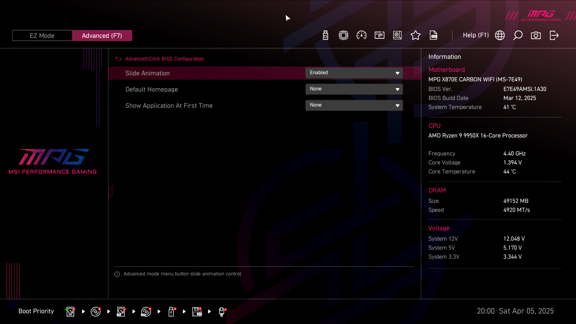 X870E Carbon WIFI керується MSI Click BIOS X. Його стилізовано під лінійку продуктів MSI Performance Gaming (MPG), а налаштування відображується в режимах EZ Mode та Advanced Mode.