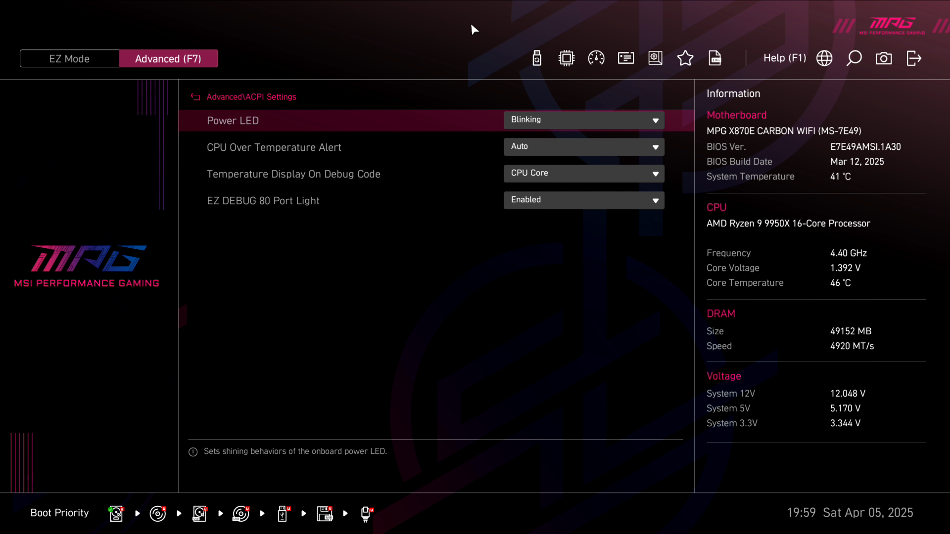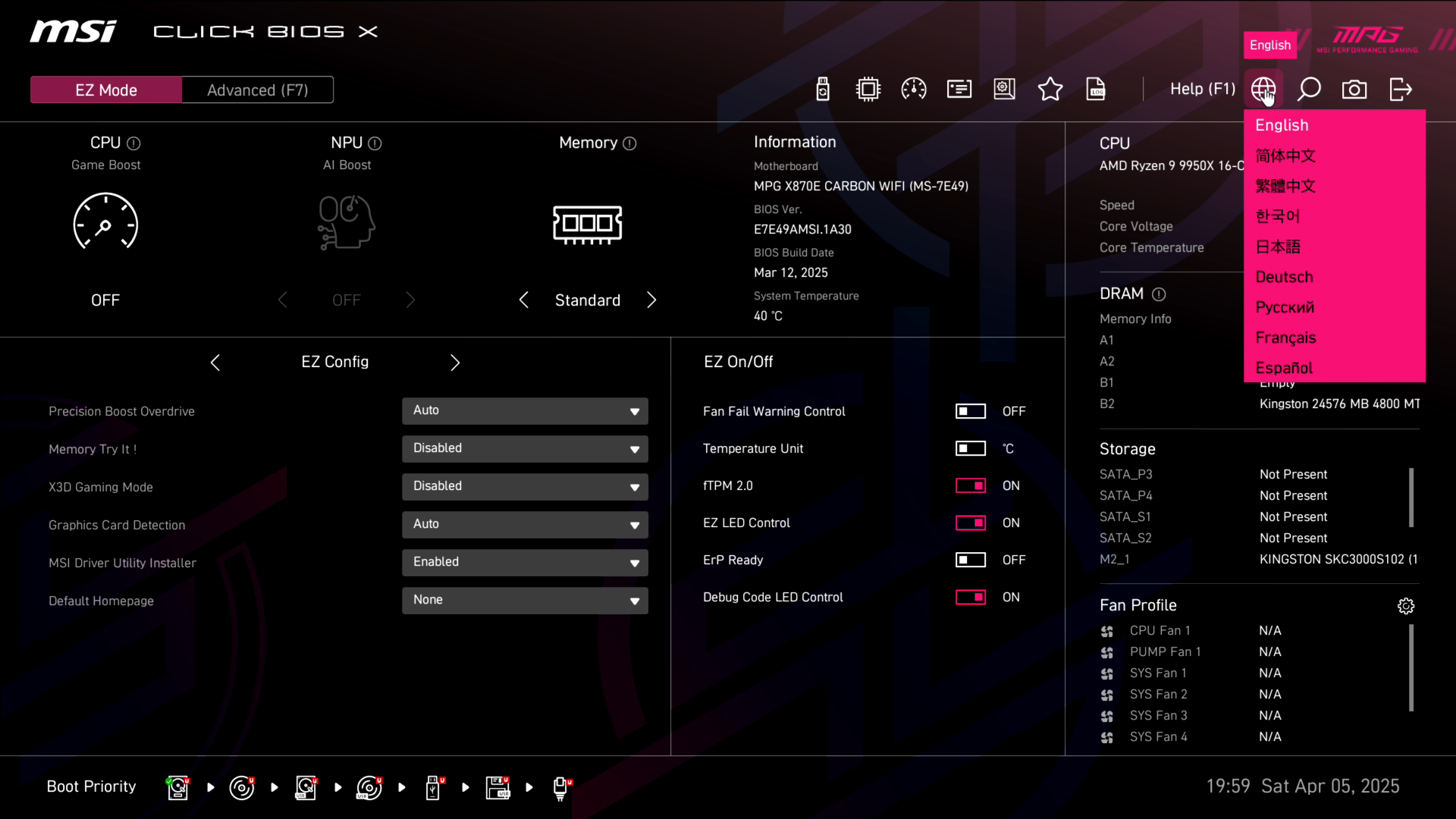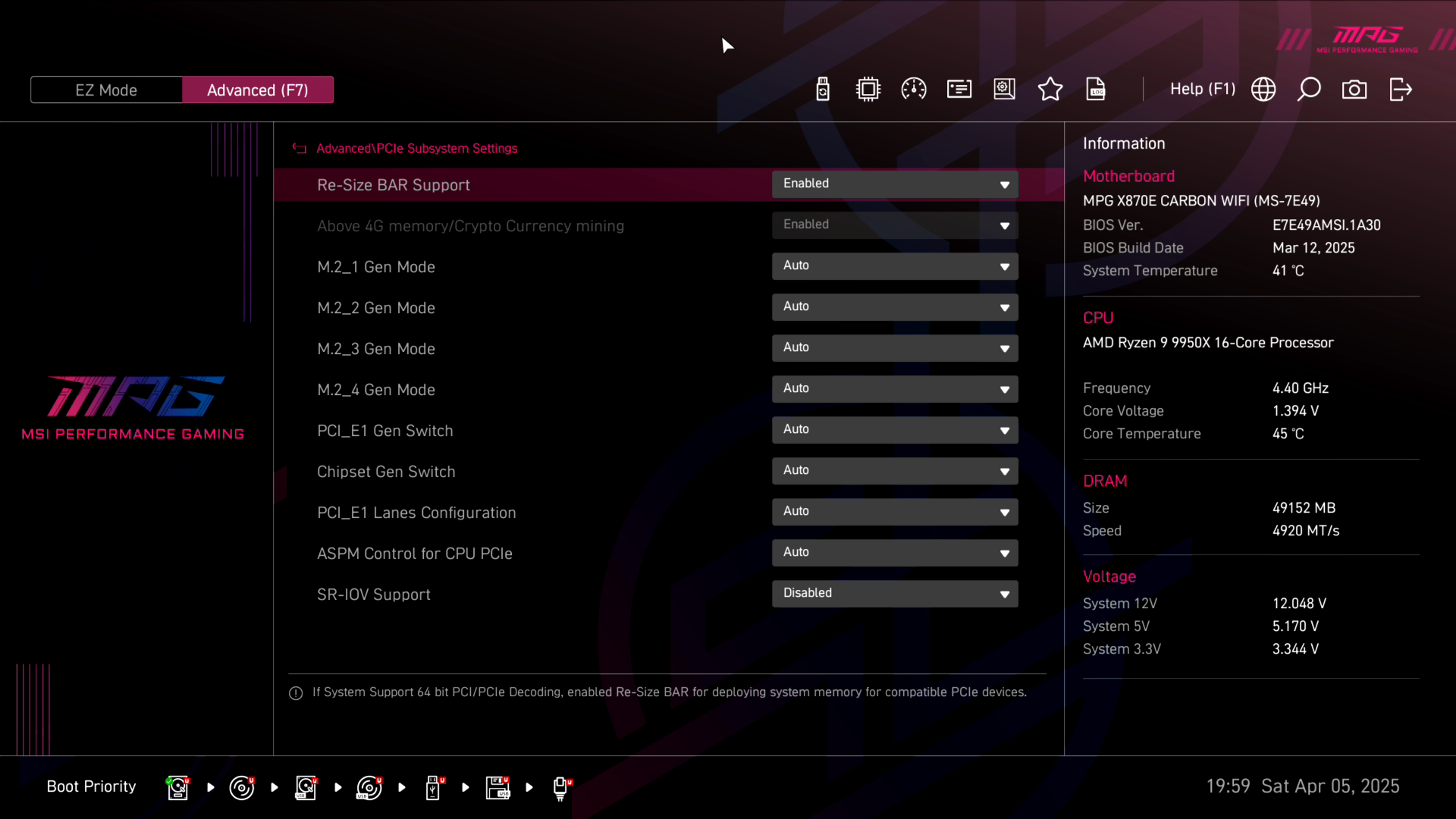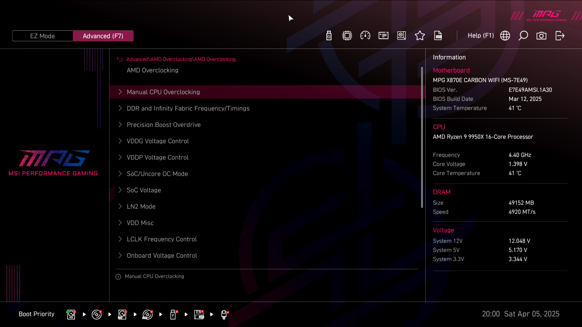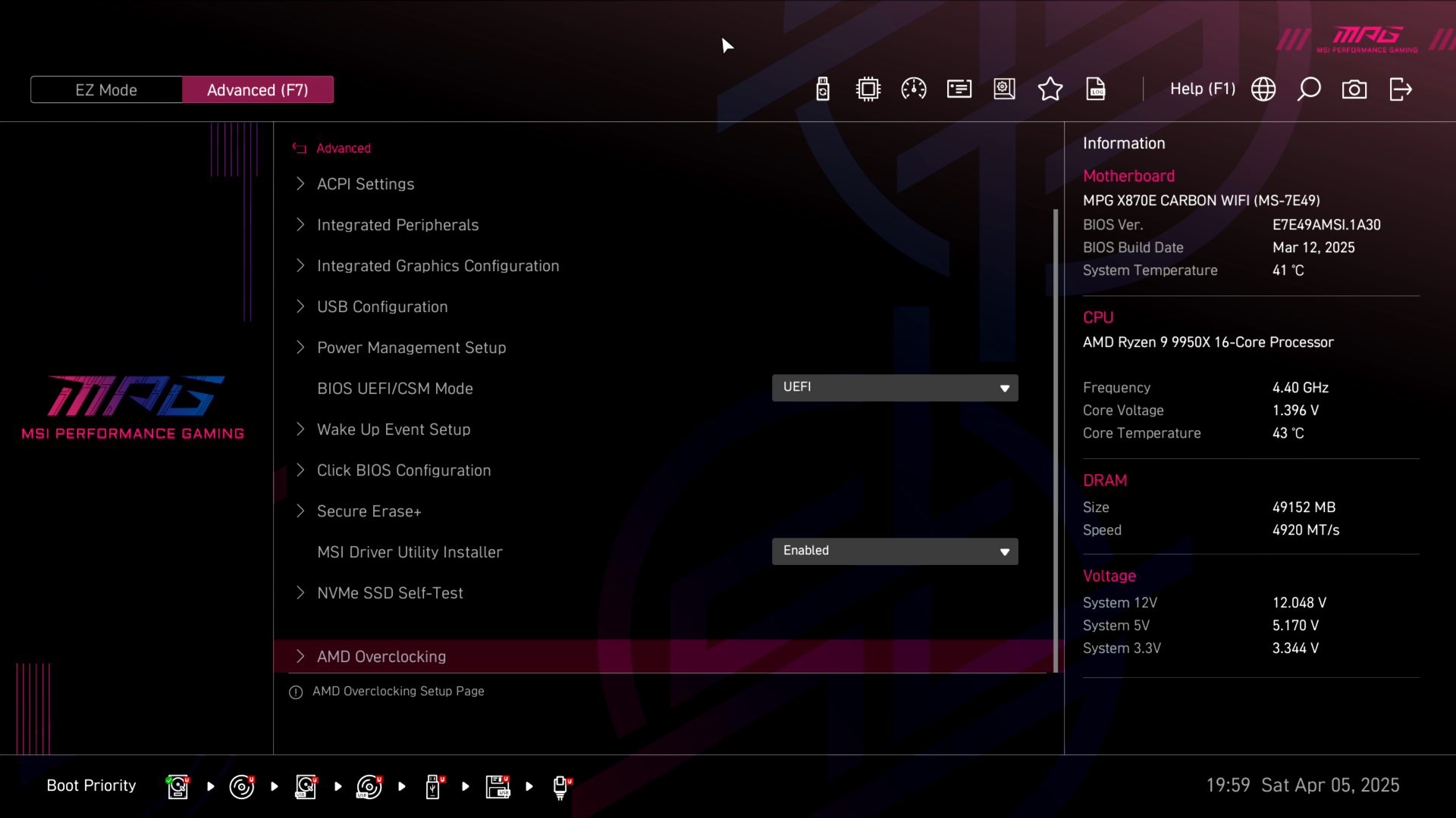 X870E Carbon WIFI керується MSI Click BIOS X. Його стилізовано під лінійку продуктів MSI Performance Gaming (MPG), а налаштування відображується в режимах EZ Mode та Advanced Mode.