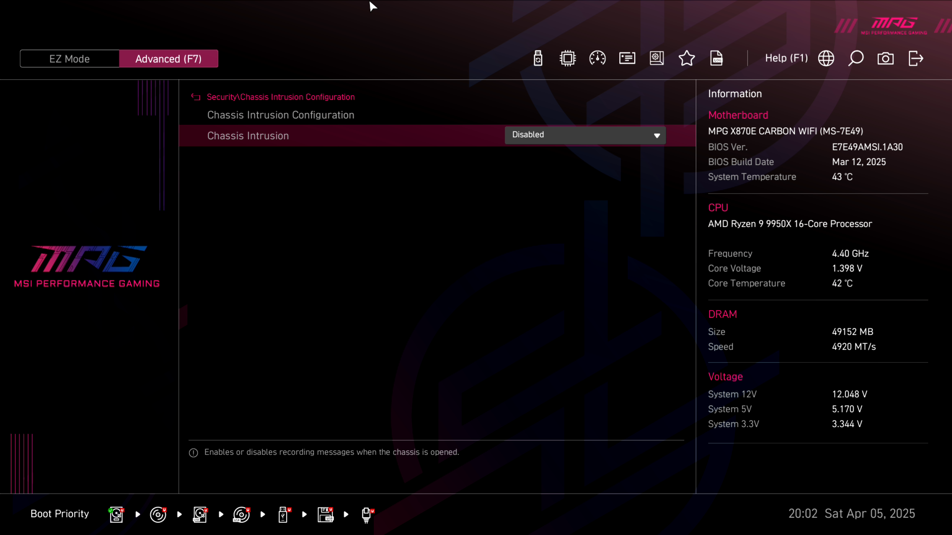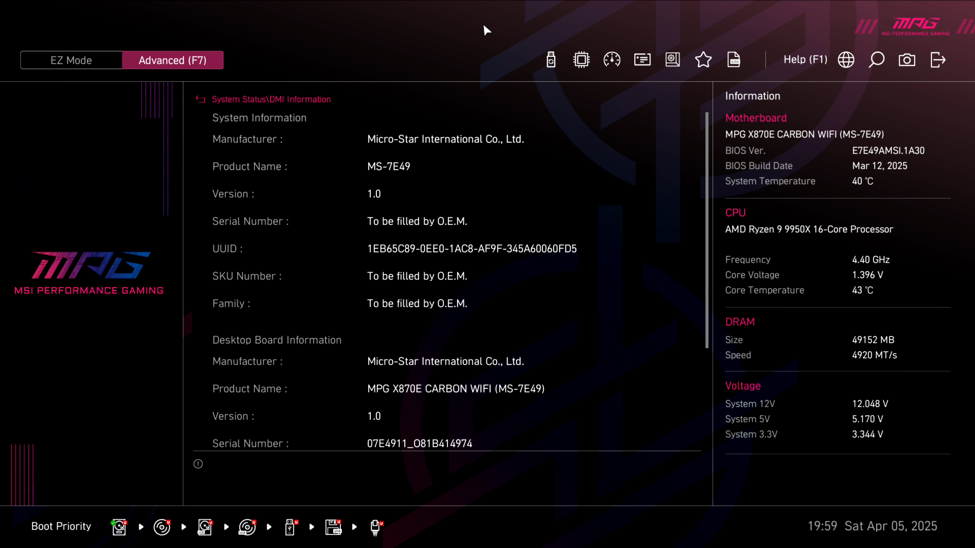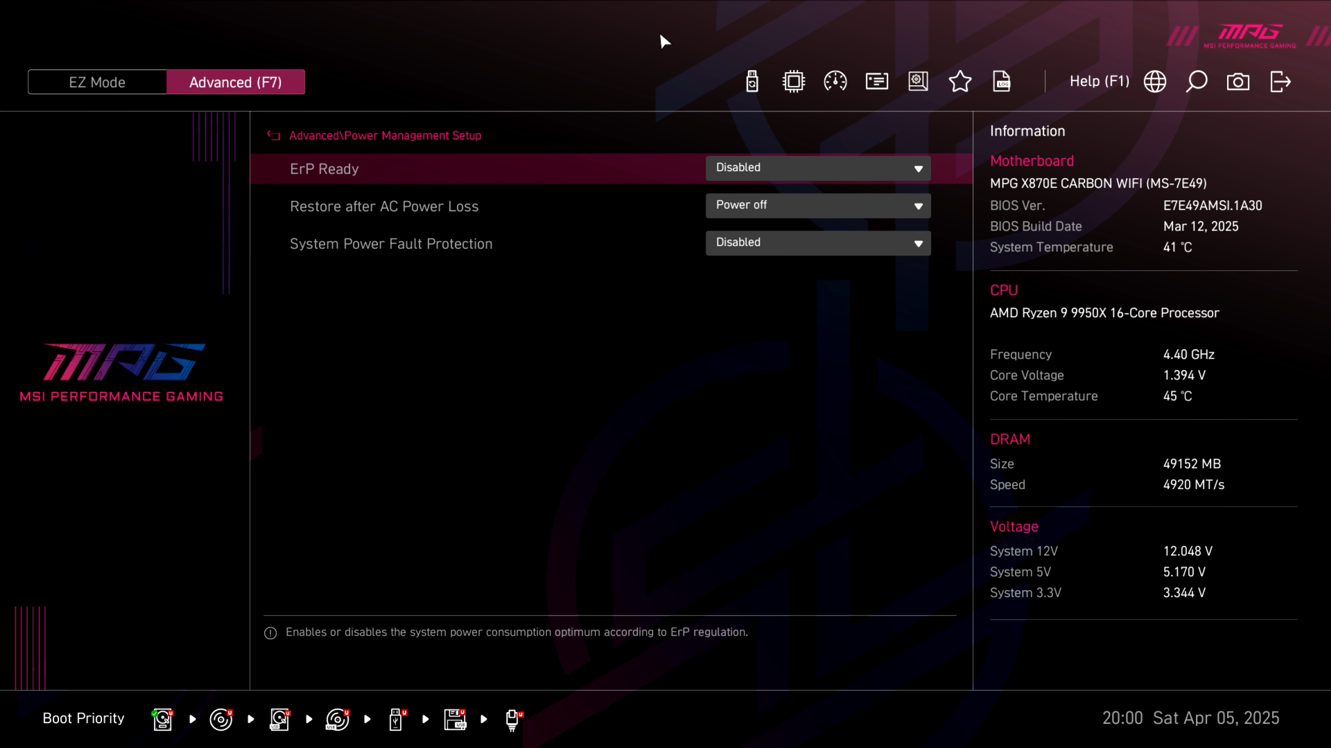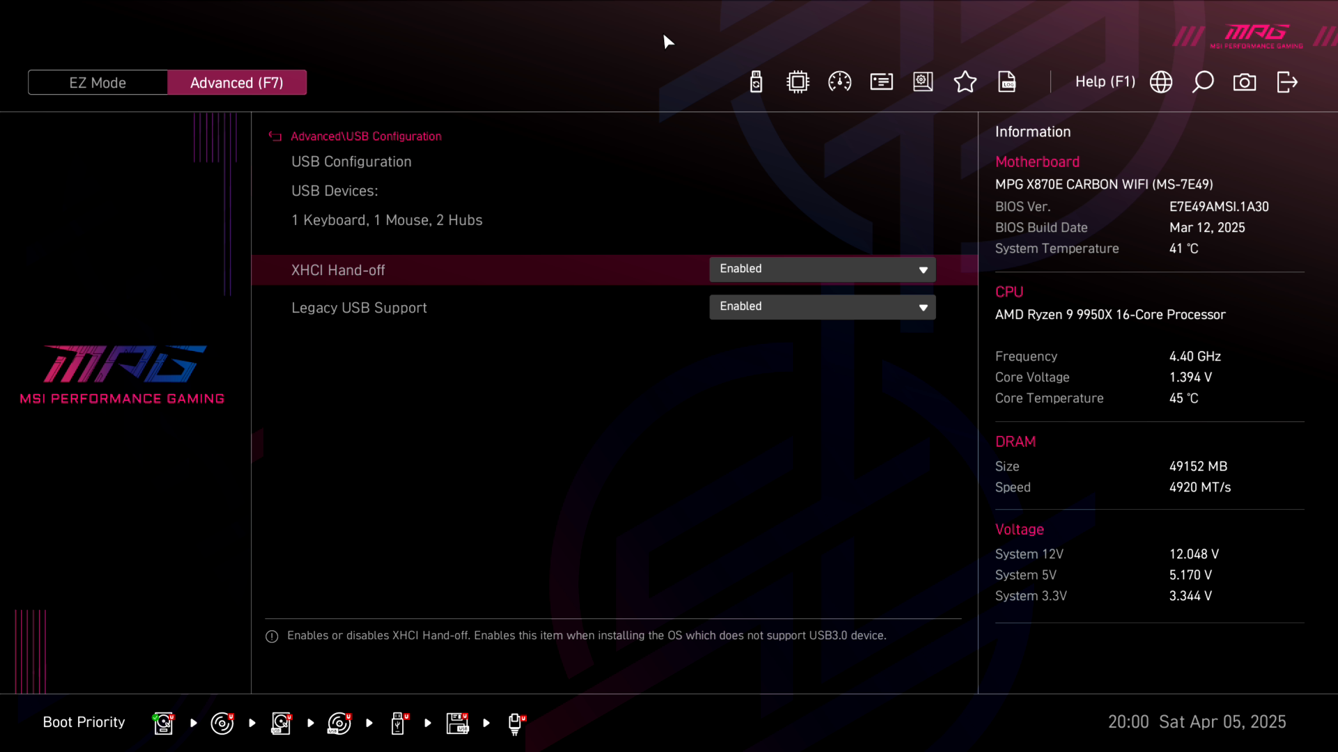 X870E Carbon WIFI керується MSI Click BIOS X. Його стилізовано під лінійку продуктів MSI Performance Gaming (MPG), а налаштування відображується в режимах EZ Mode та Advanced Mode.