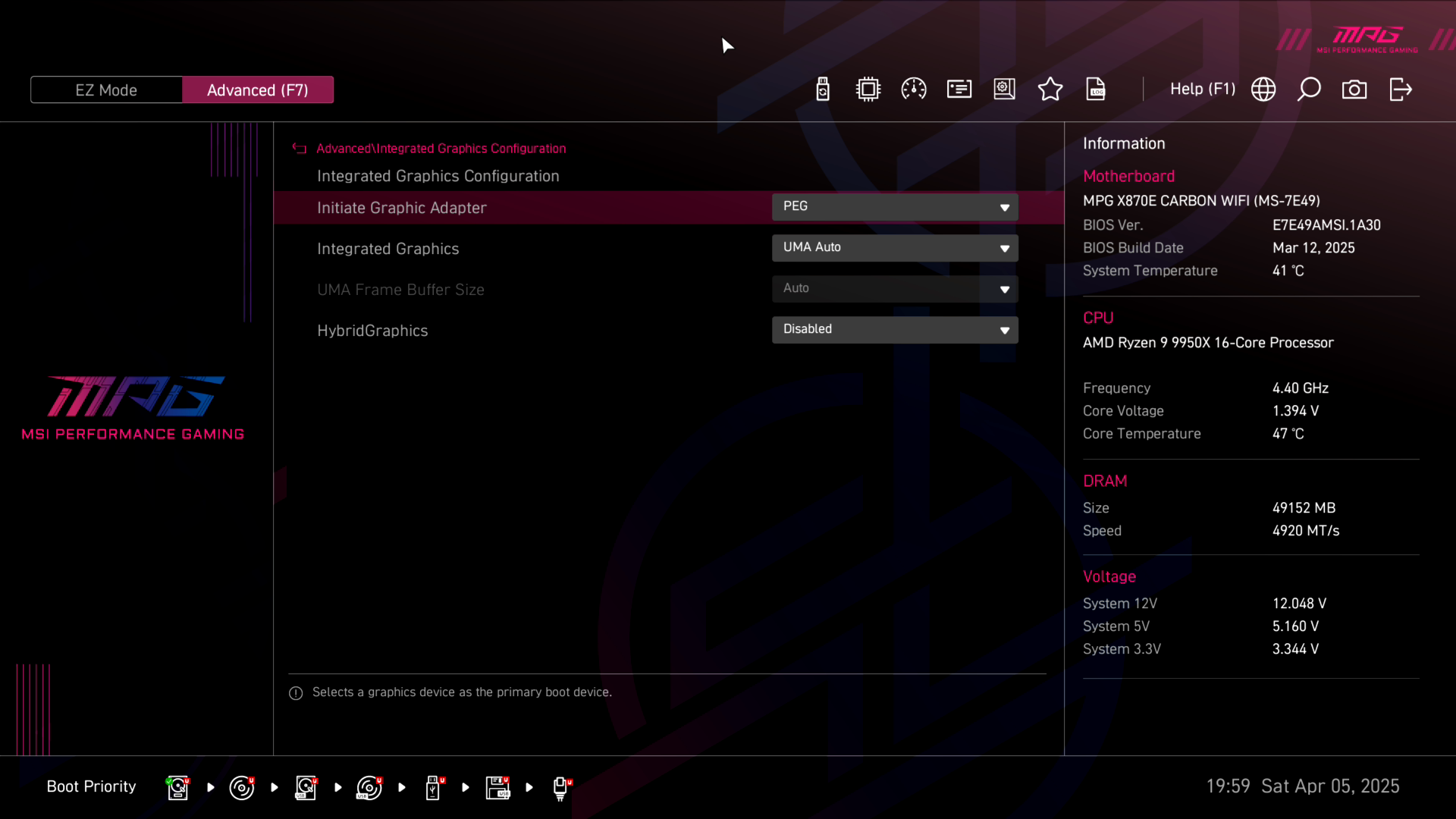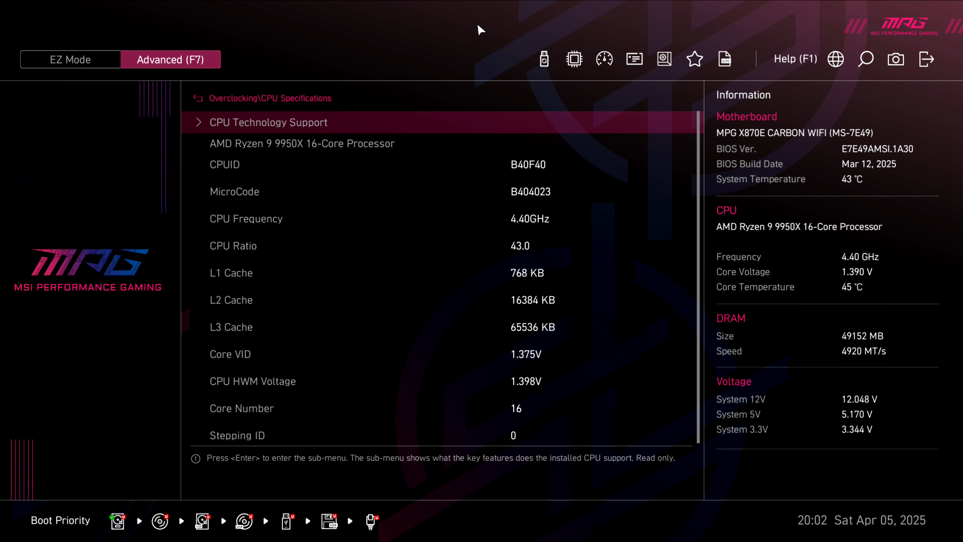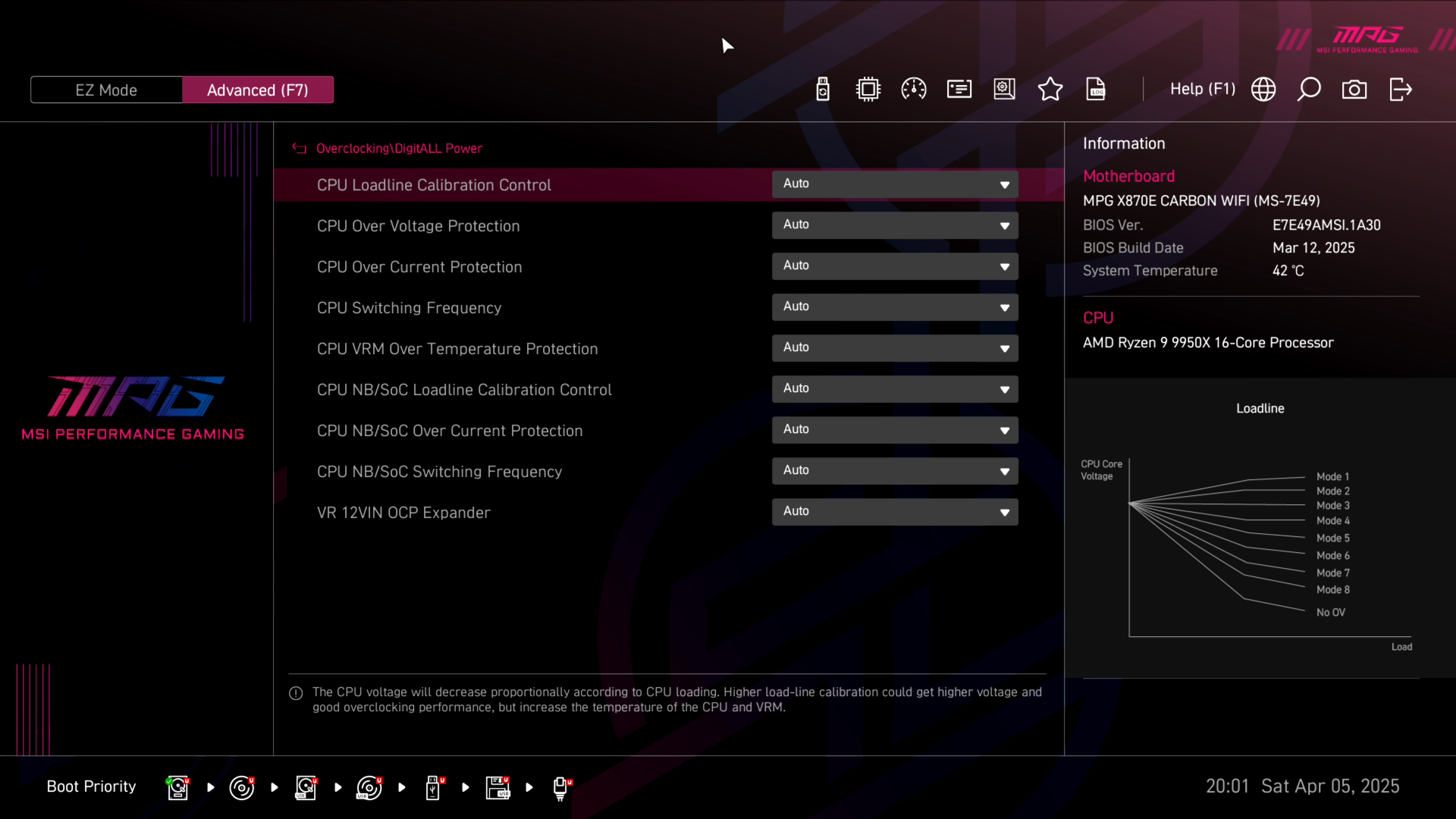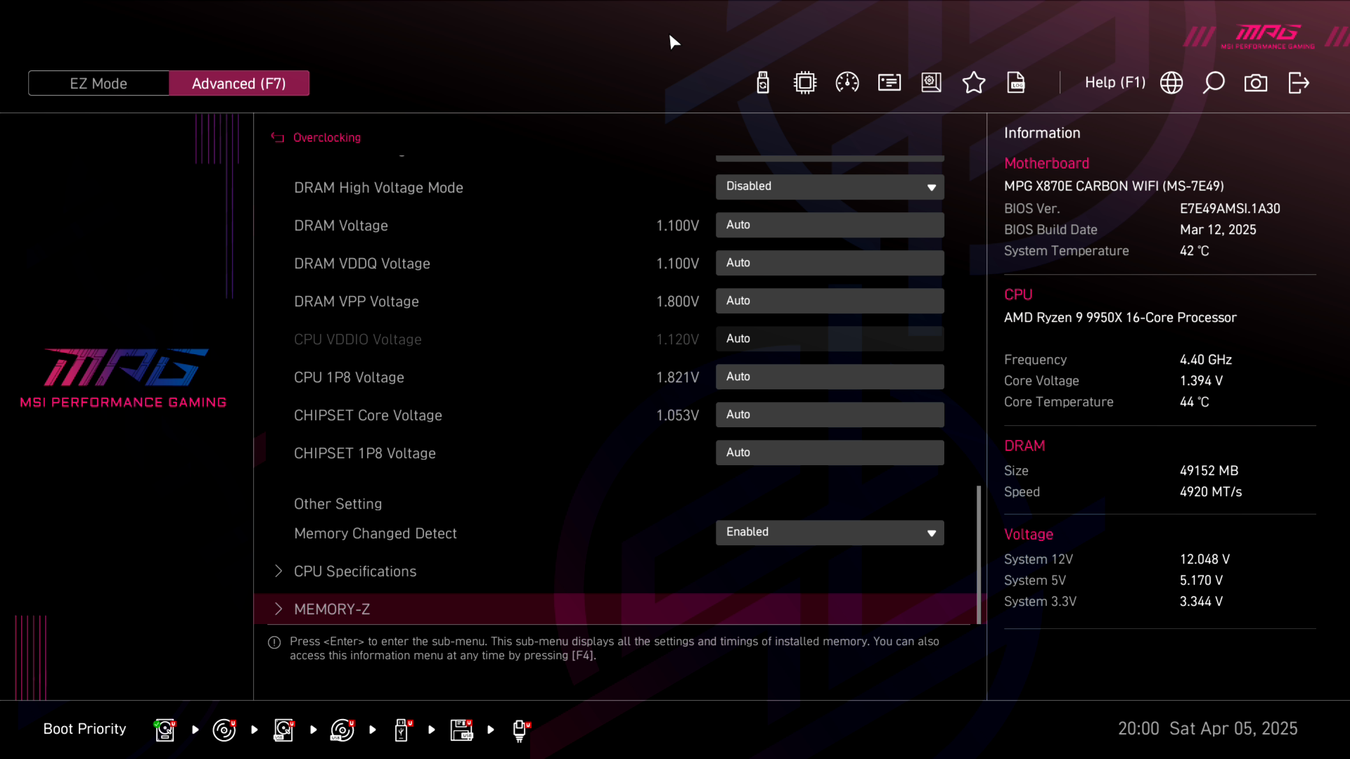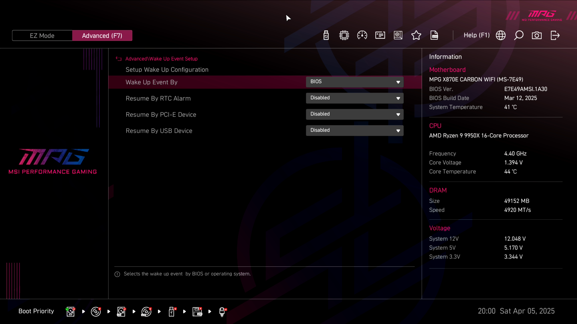 X870E Carbon WIFI керується MSI Click BIOS X. Його стилізовано під лінійку продуктів MSI Performance Gaming (MPG), а налаштування відображується в режимах EZ Mode та Advanced Mode.