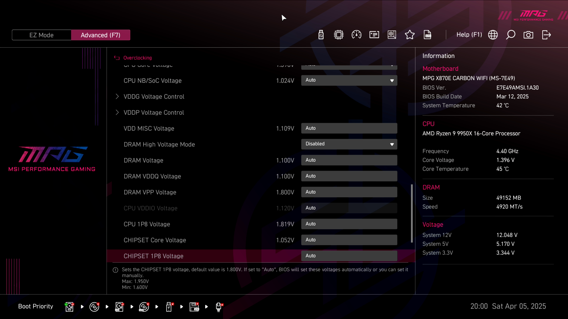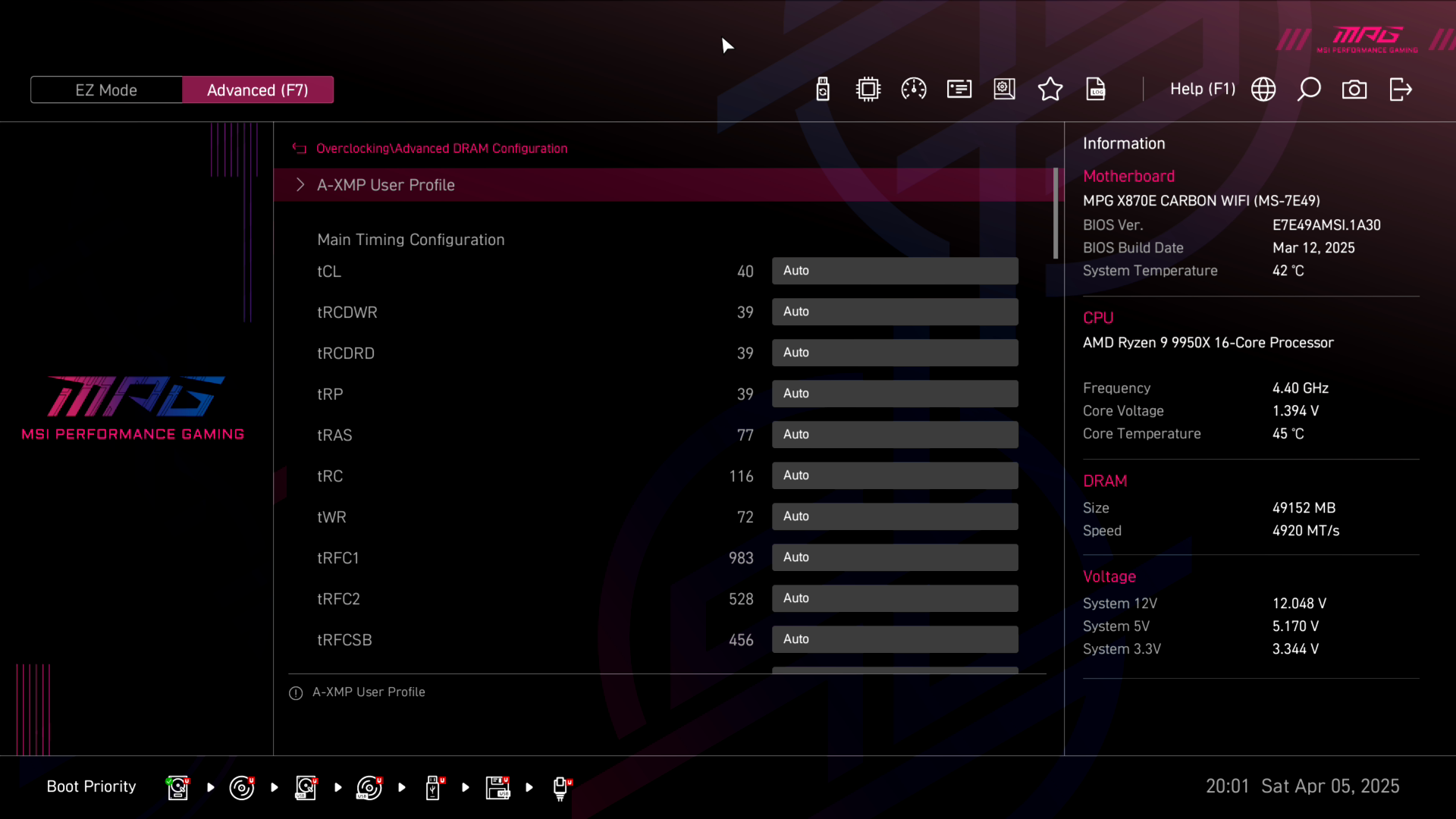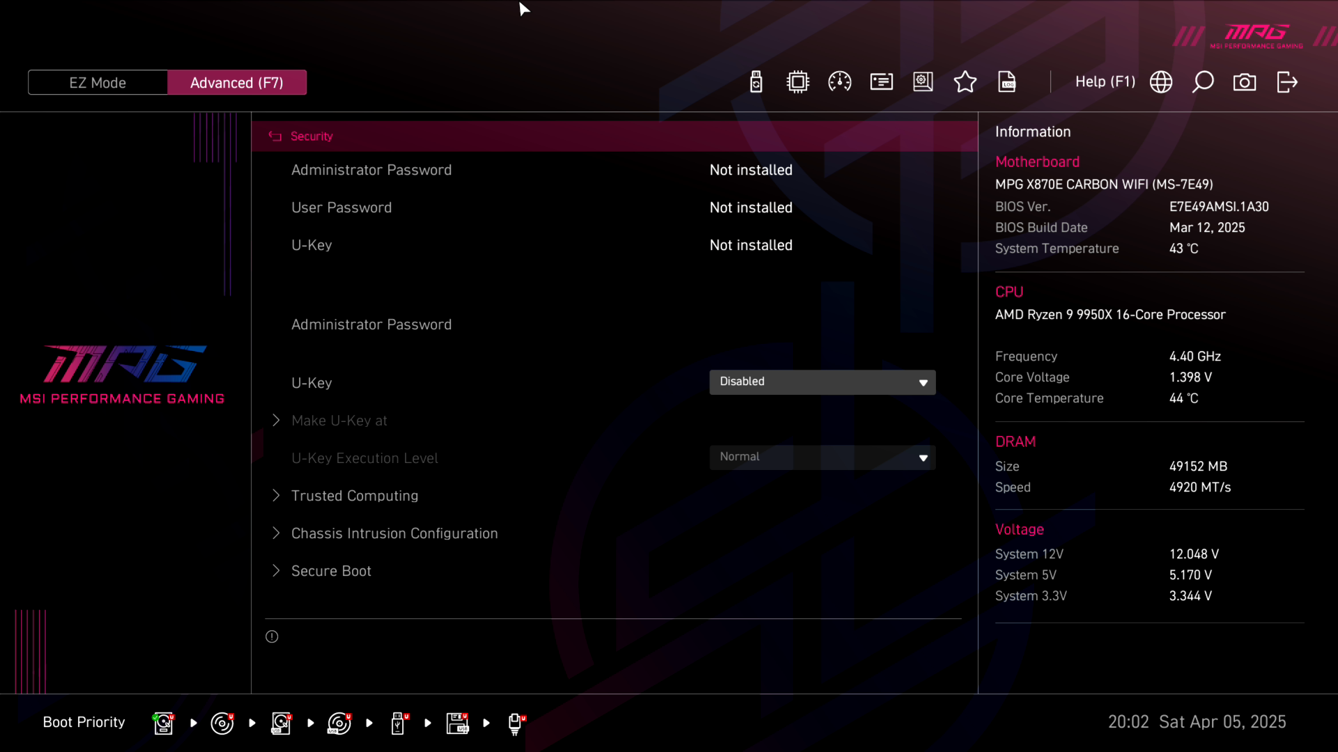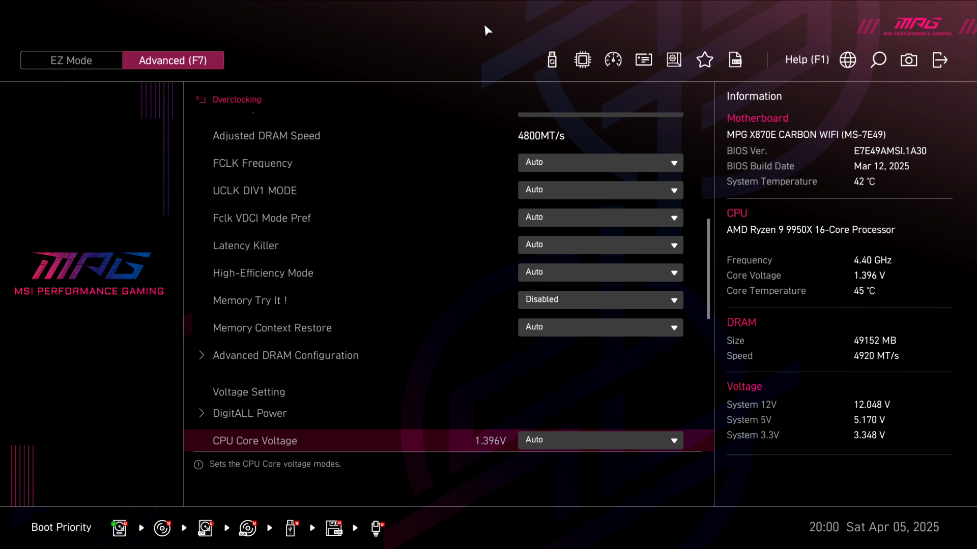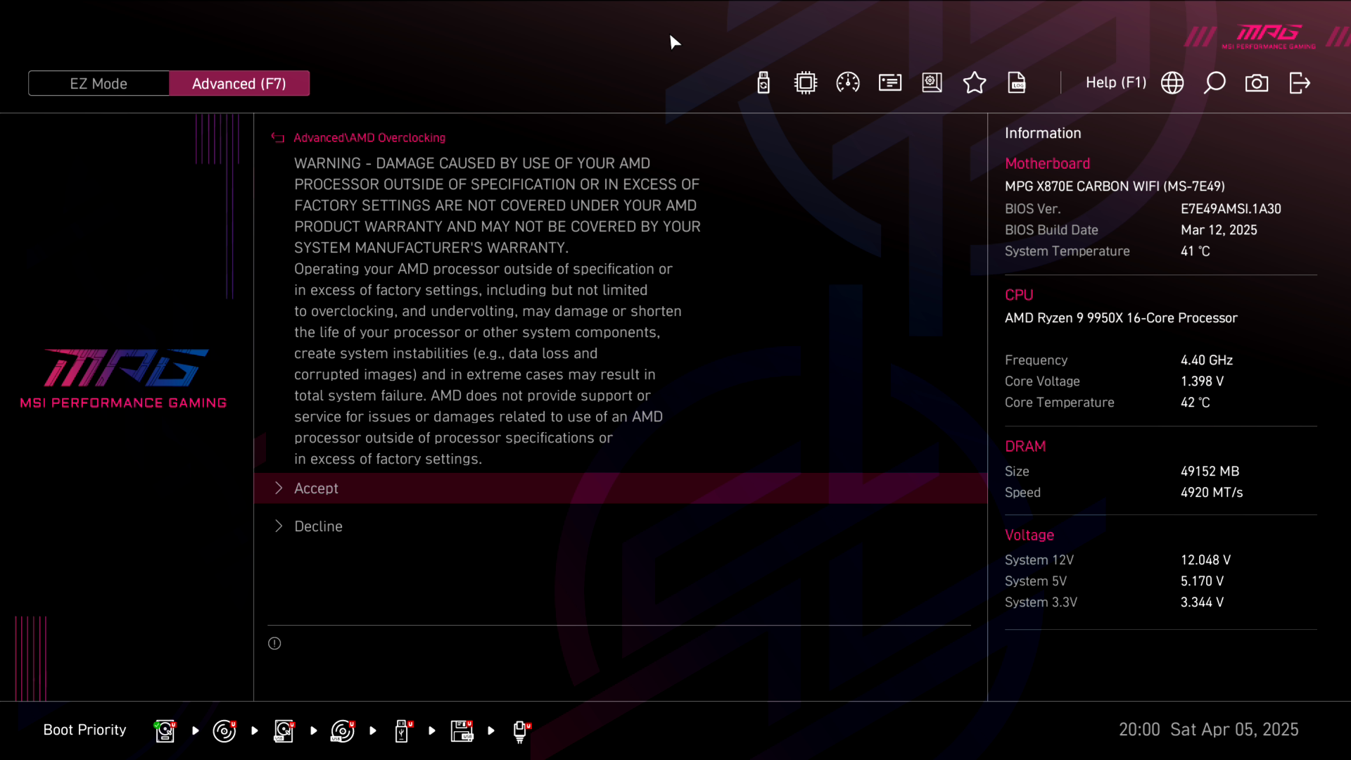X870E Carbon WIFI керується MSI Click BIOS X. Його стилізовано під лінійку продуктів MSI Performance Gaming (MPG), а налаштування відображується в режимах EZ Mode та Advanced Mode.