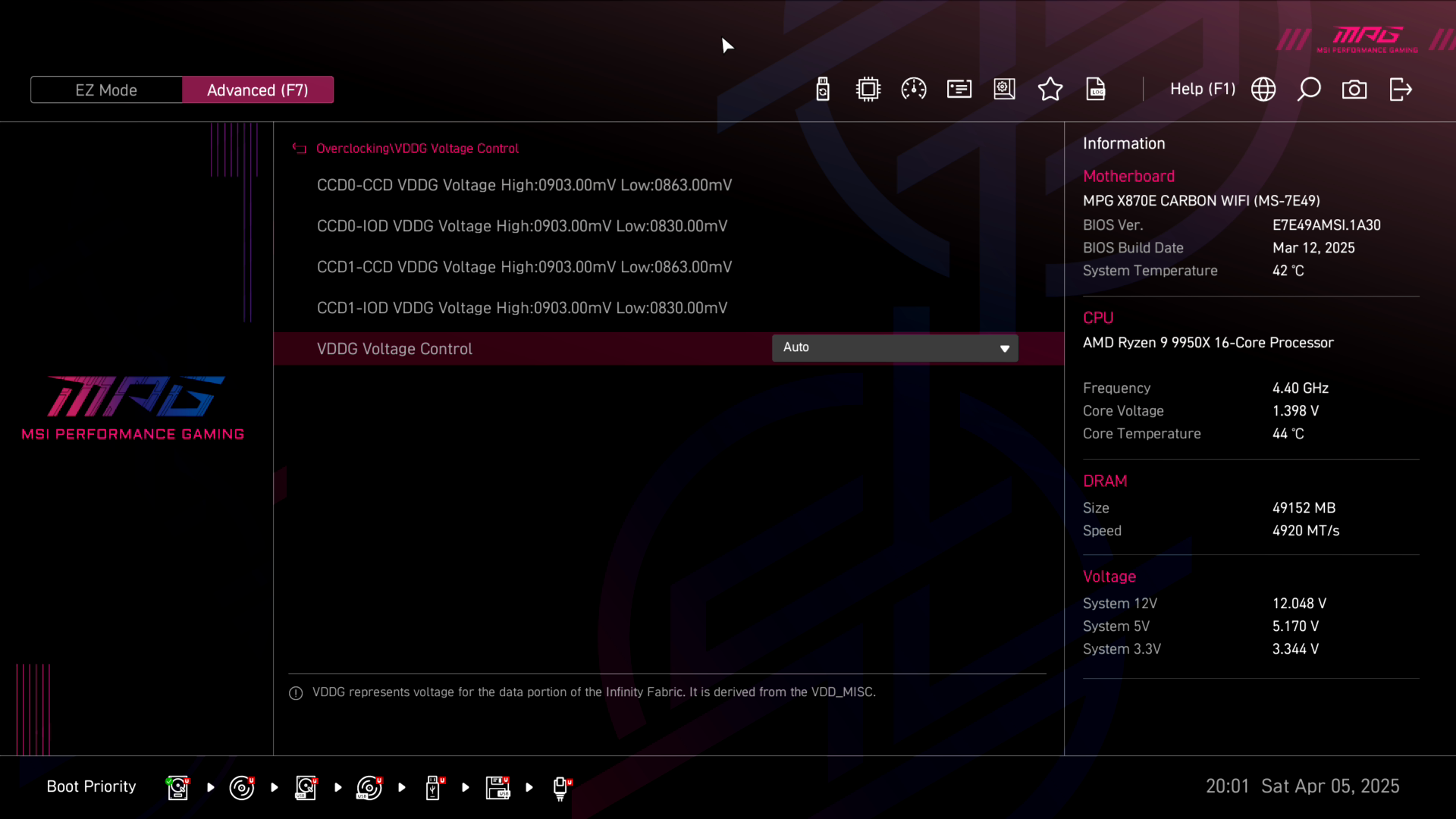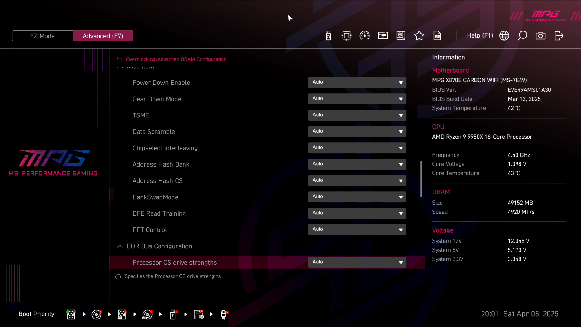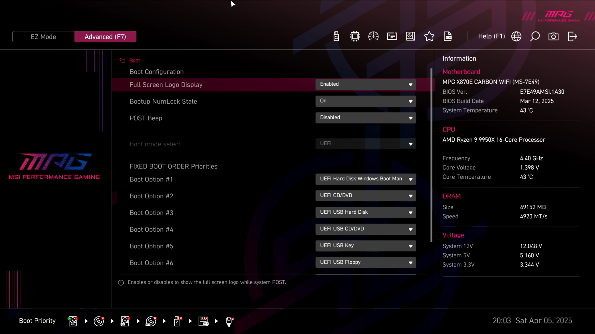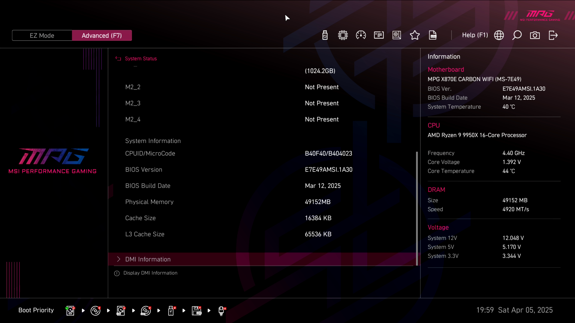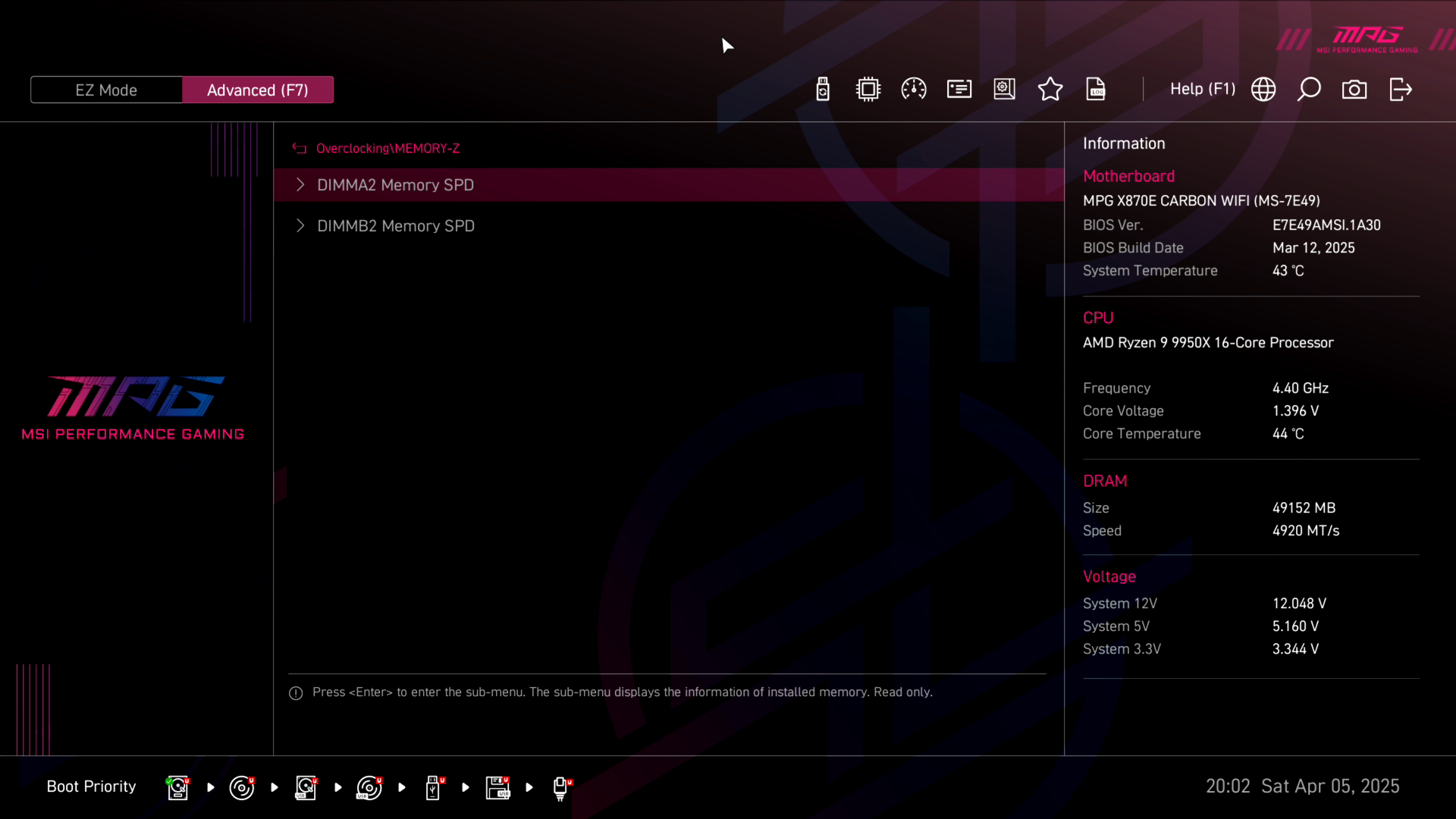 X870E Carbon WIFI керується MSI Click BIOS X. Його стилізовано під лінійку продуктів MSI Performance Gaming (MPG), а налаштування відображується в режимах EZ Mode та Advanced Mode.