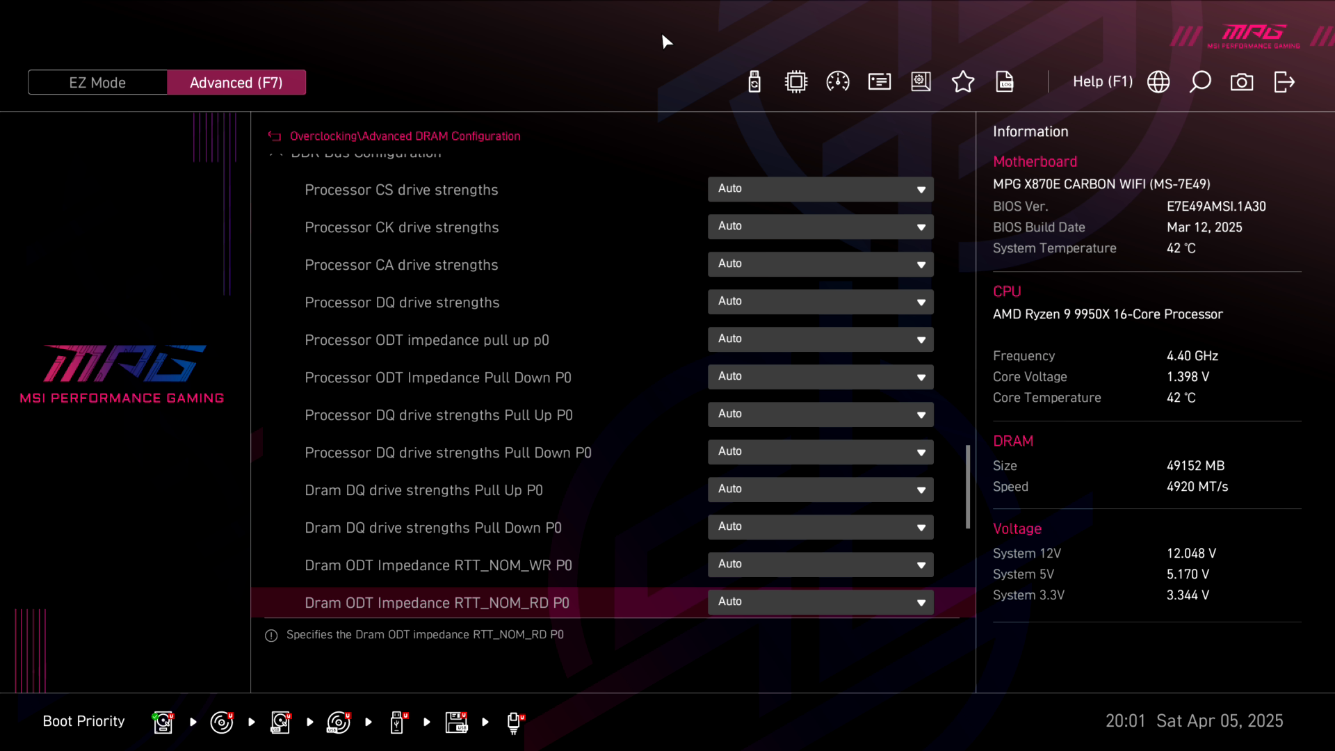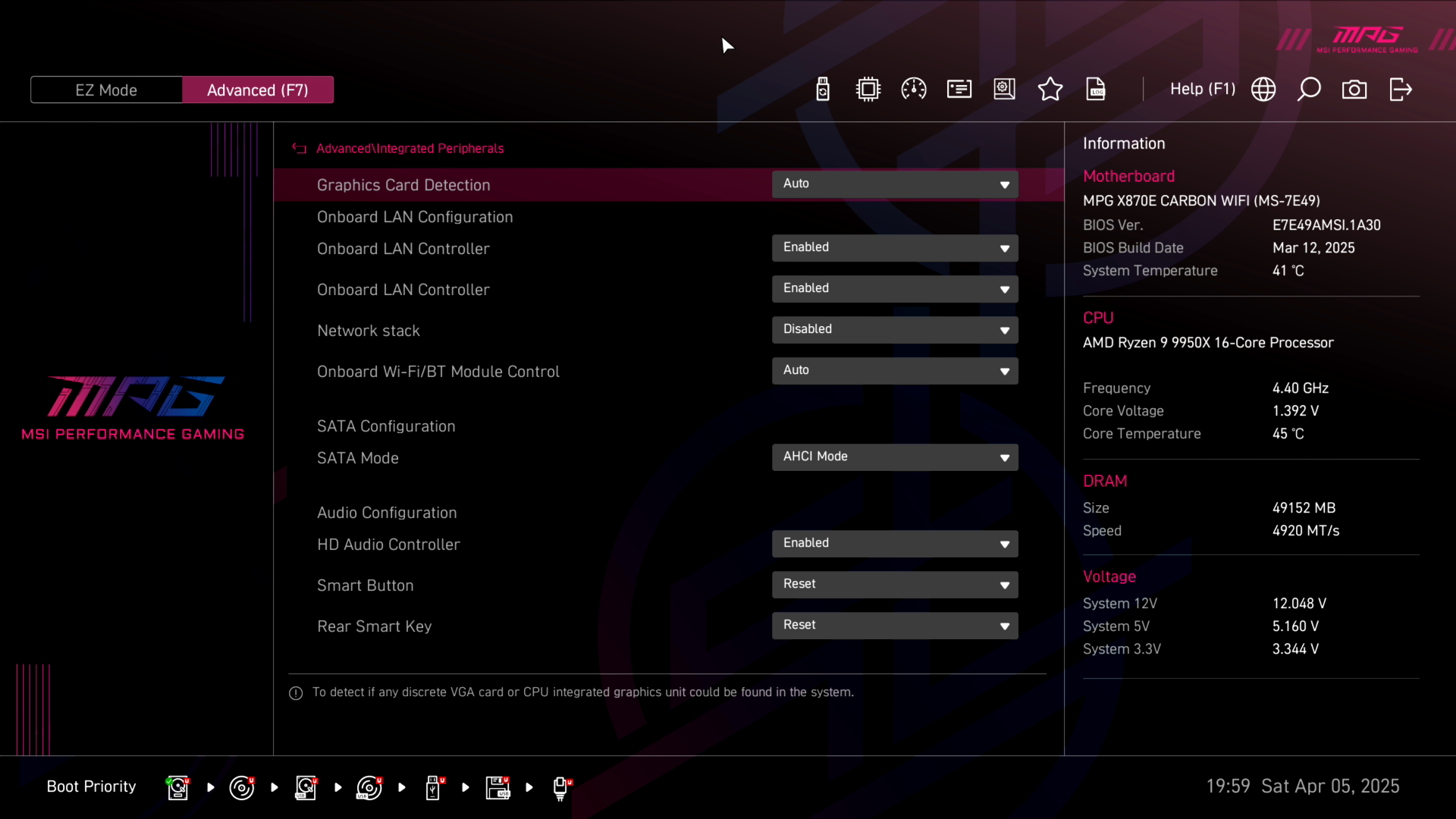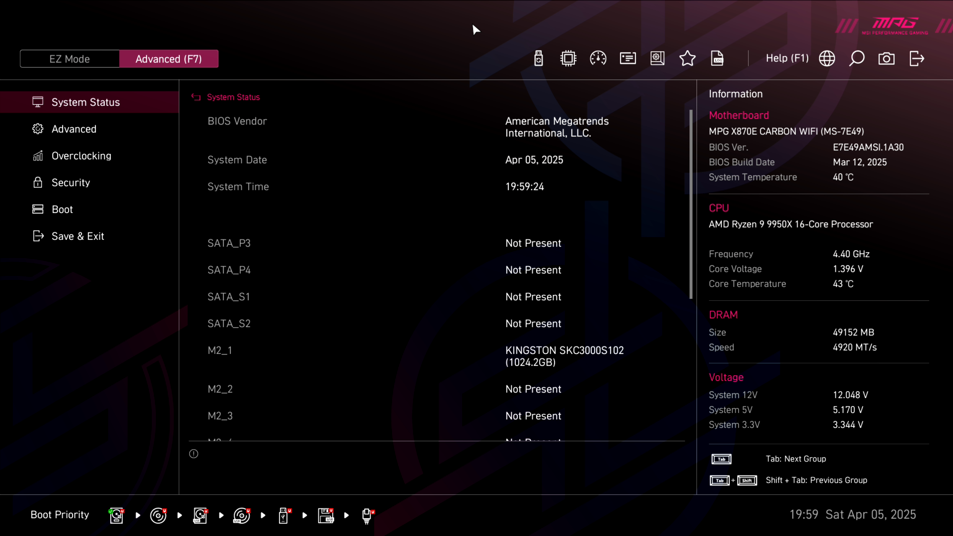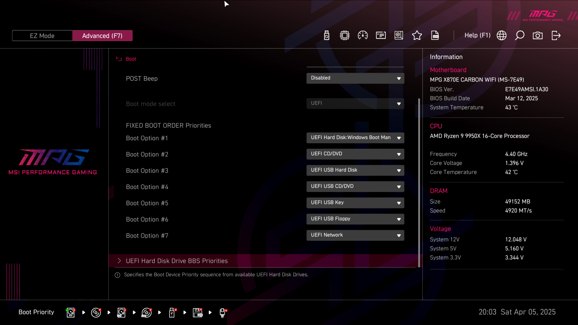 X870E Carbon WIFI керується MSI Click BIOS X. Його стилізовано під лінійку продуктів MSI Performance Gaming (MPG), а налаштування відображується в режимах EZ Mode та Advanced Mode.