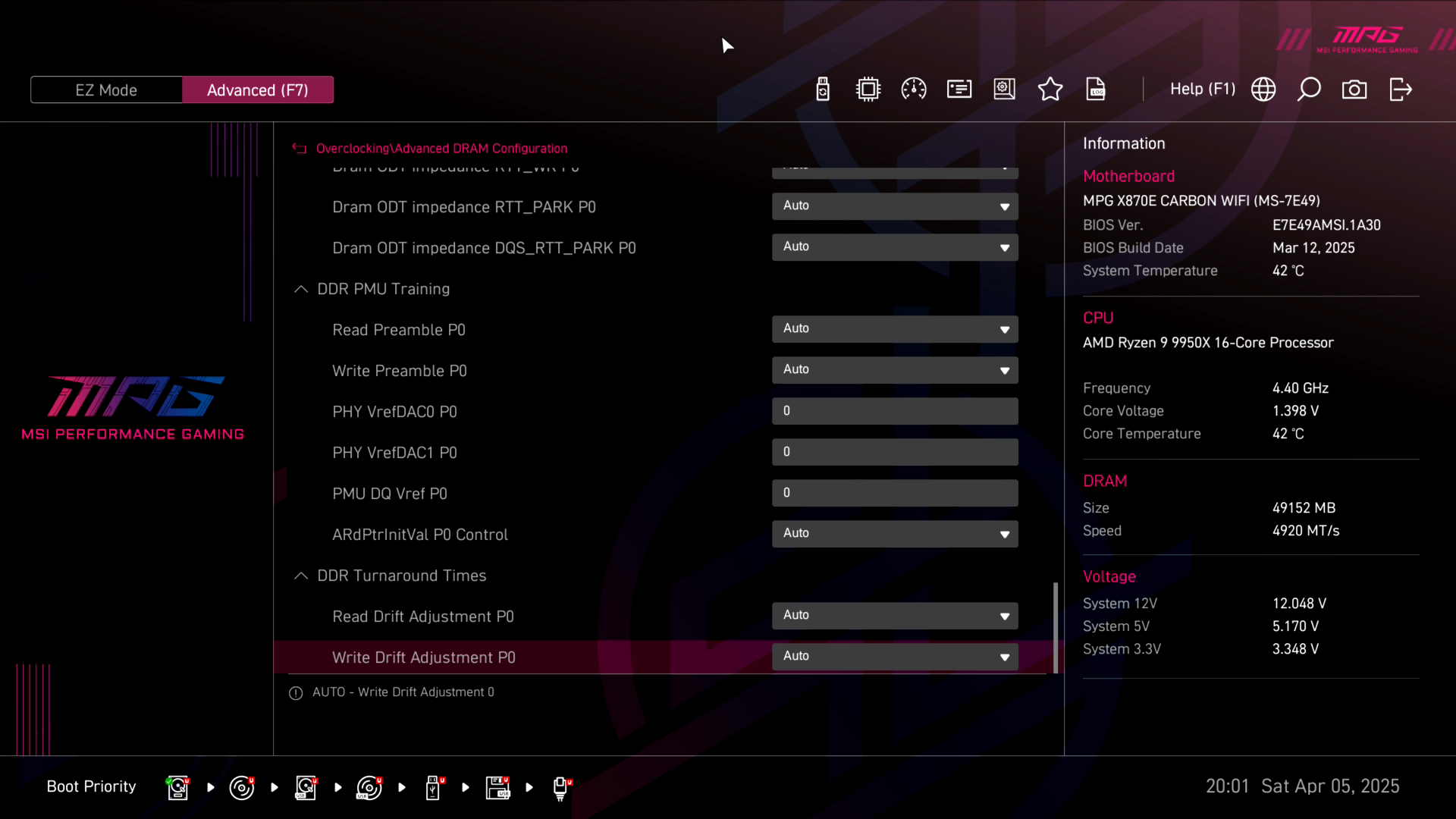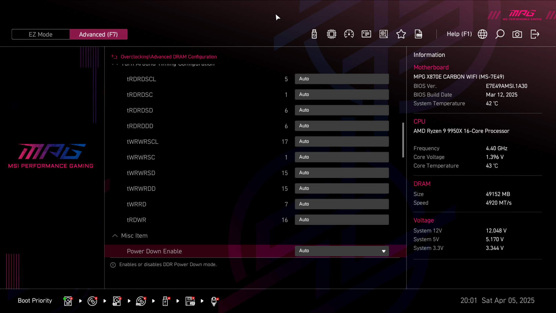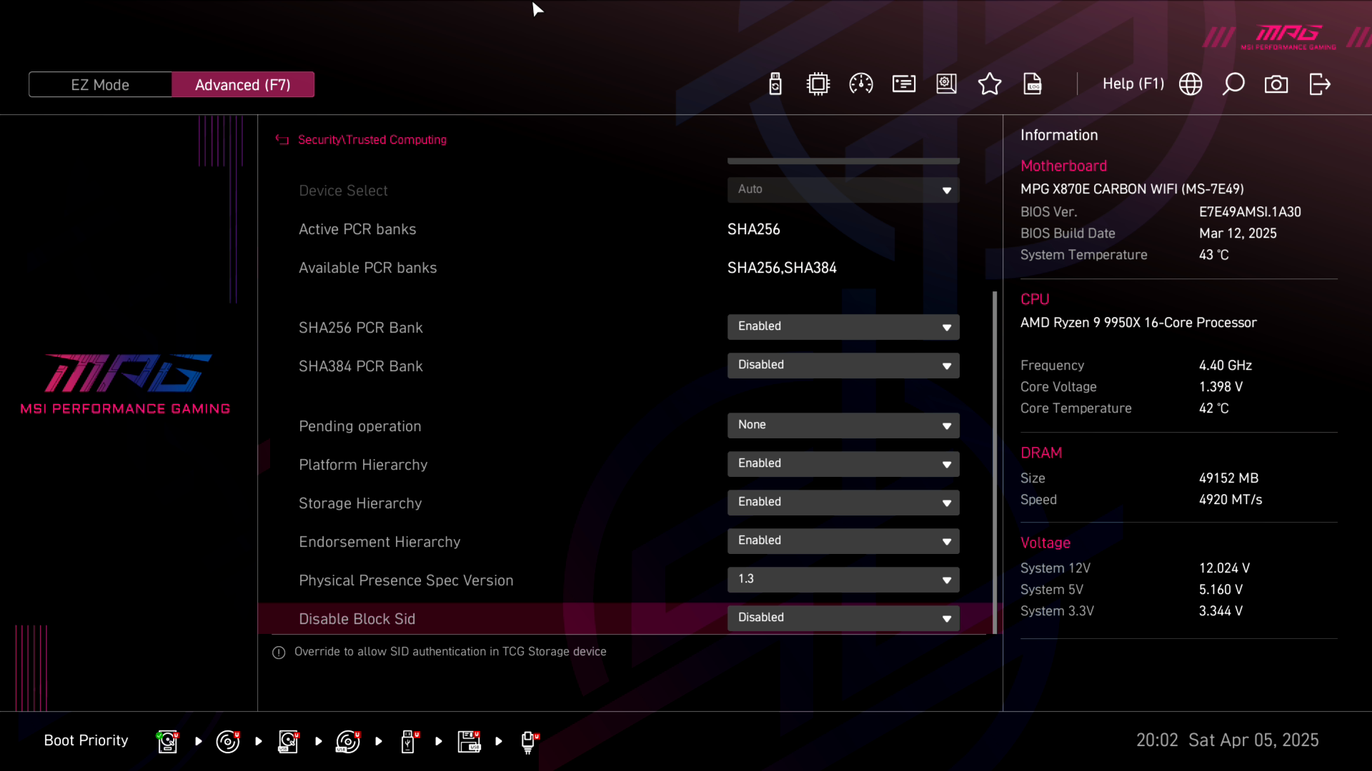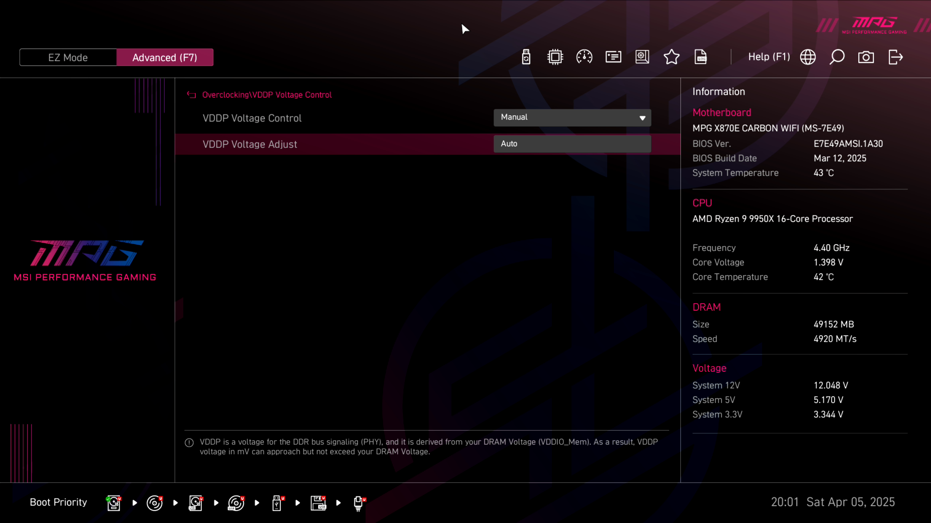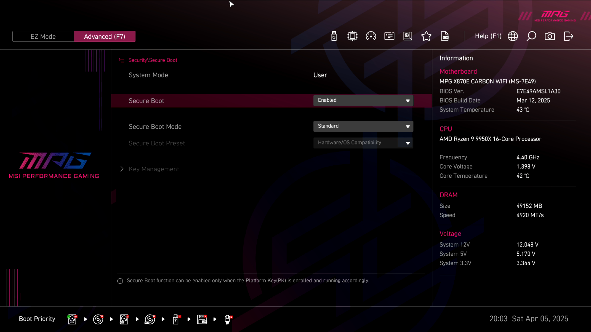 X870E Carbon WIFI керується MSI Click BIOS X. Його стилізовано під лінійку продуктів MSI Performance Gaming (MPG), а налаштування відображується в режимах EZ Mode та Advanced Mode.