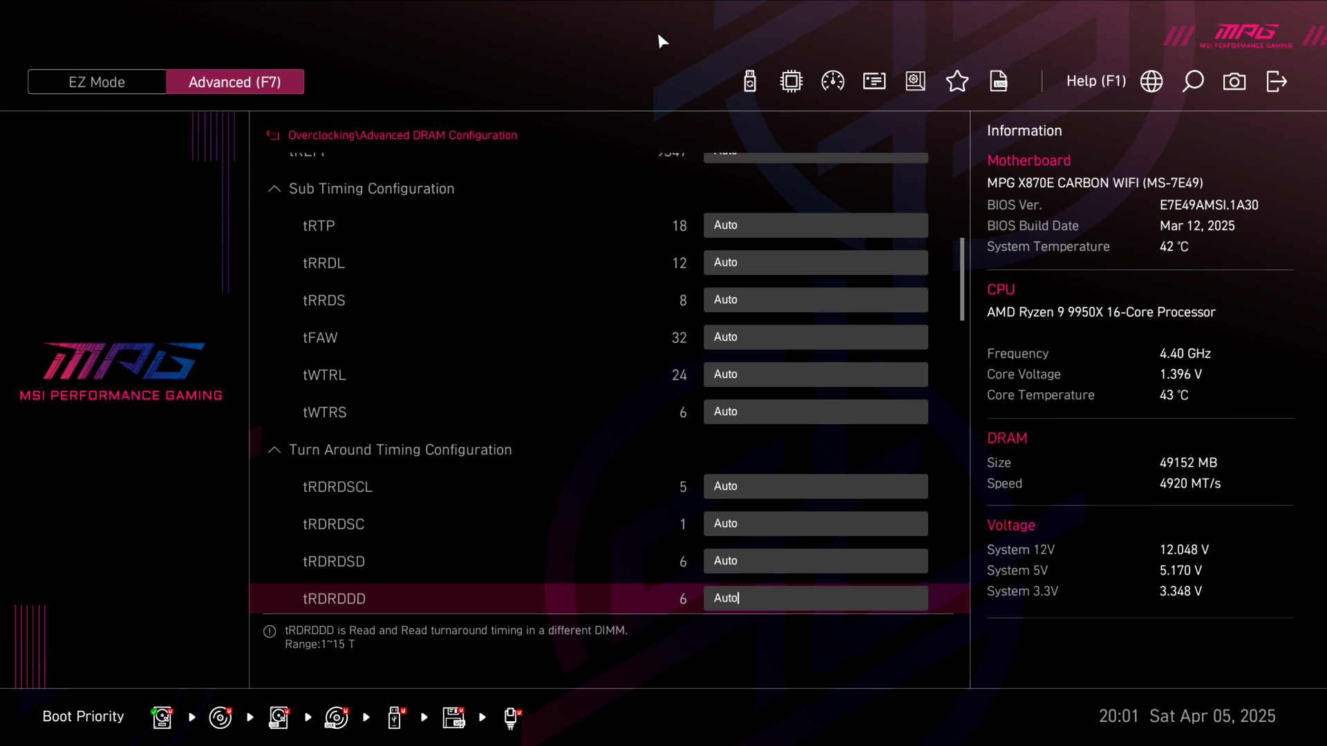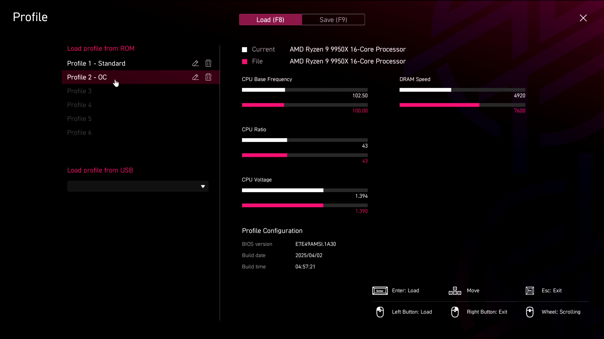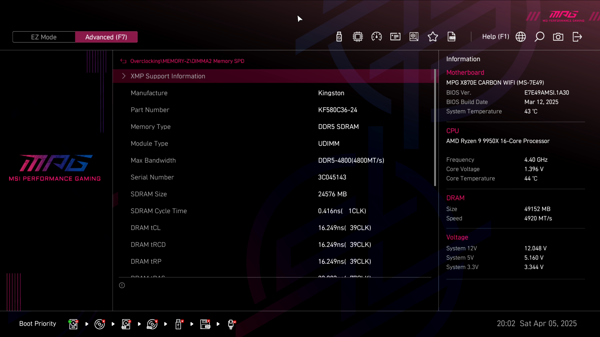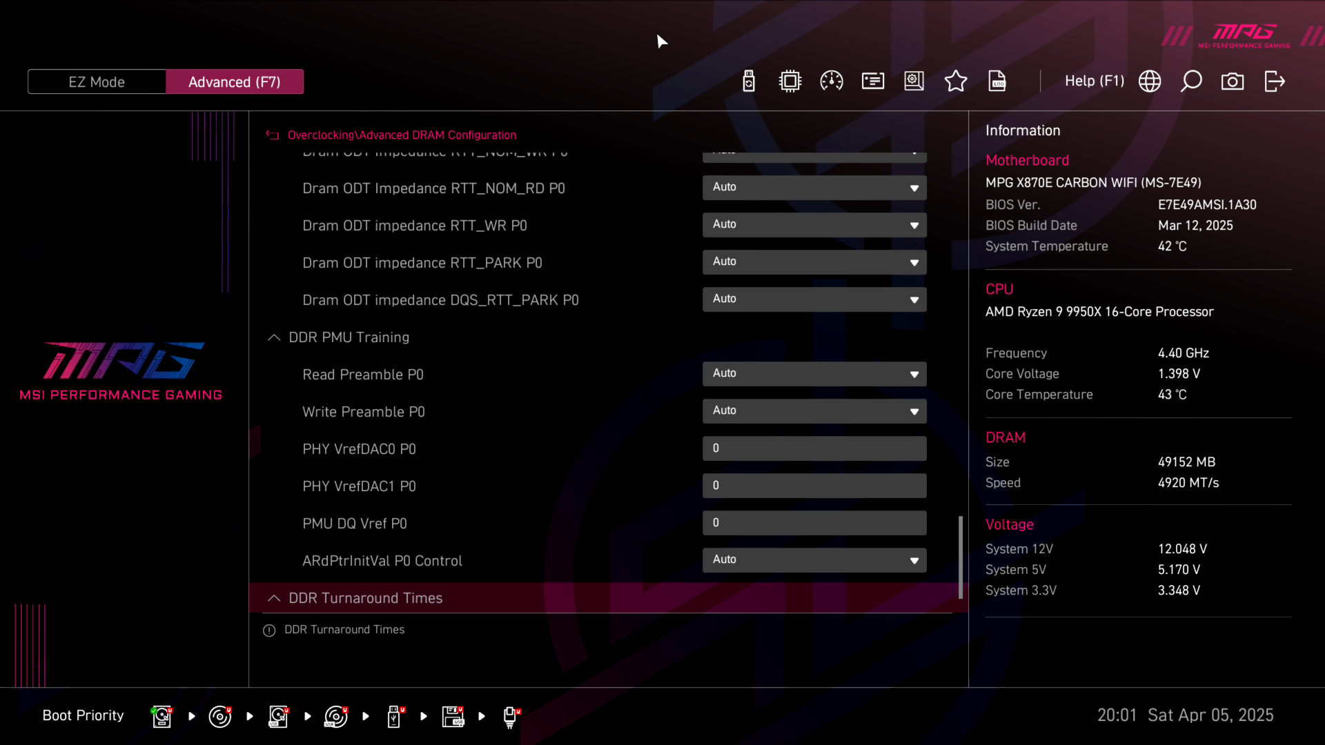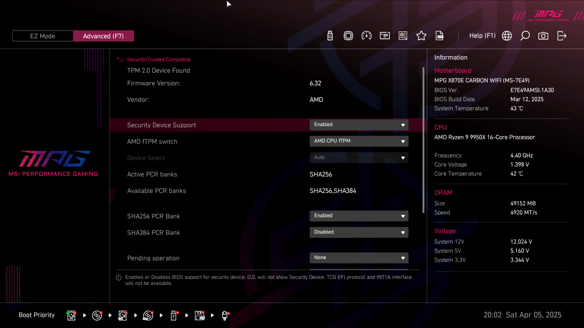 X870E Carbon WIFI керується MSI Click BIOS X. Його стилізовано під лінійку продуктів MSI Performance Gaming (MPG), а налаштування відображується в режимах EZ Mode та Advanced Mode.