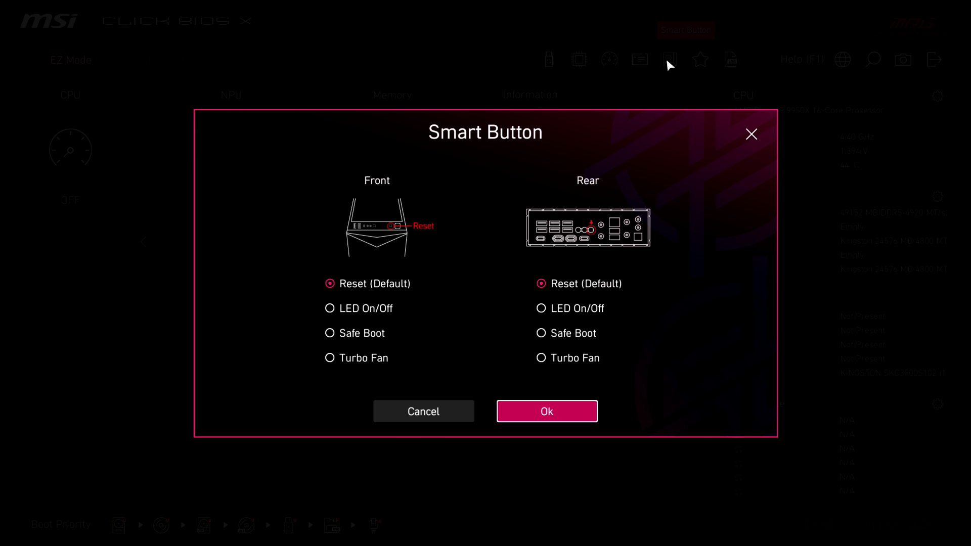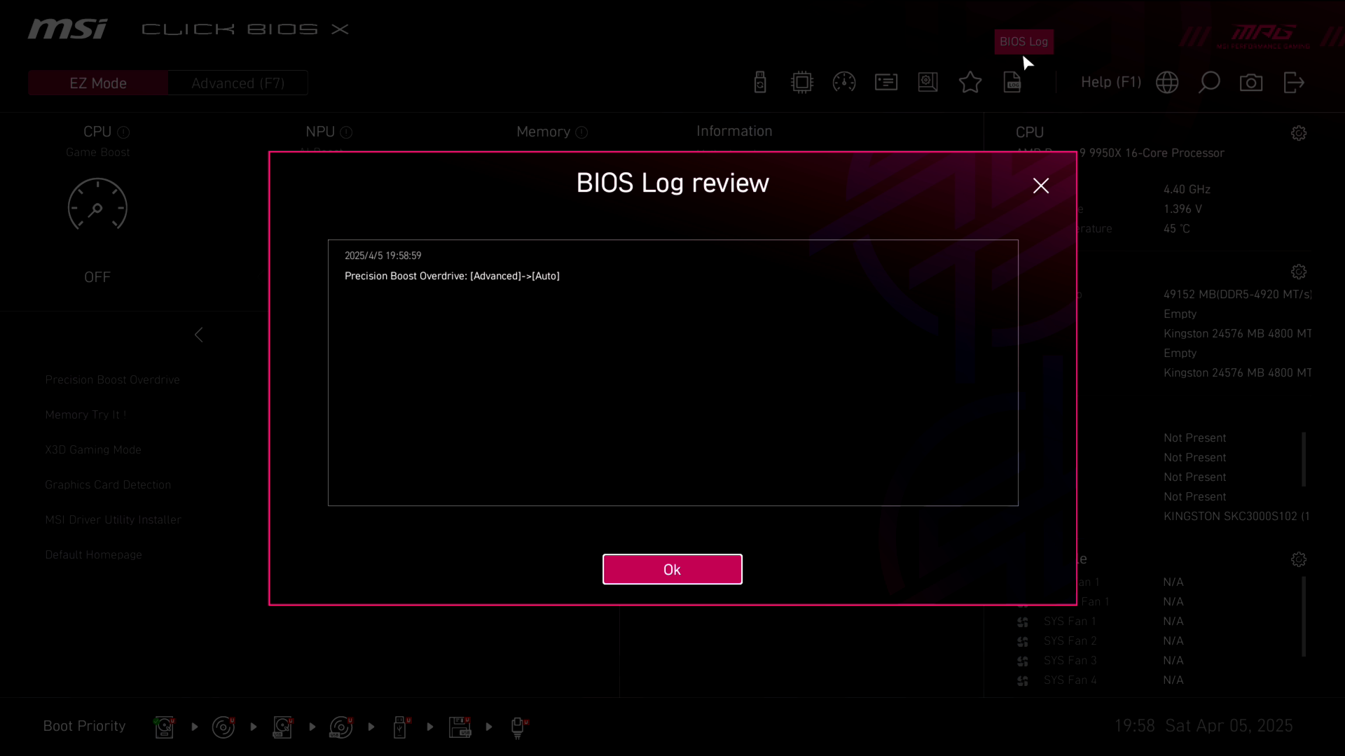 EZ Mode дозволяє отримати звіт по інтерфейсах, слотах, портах та таке інше. Можна в один клік розігнати NPU (у разі його наявності в процесорі), залучити функцію GameBoost (форсування PBO), використати EXPO-профіль оперативної пам’яті у разі його присутності. Тут також можна встановити пріоритет завантаження з накопичувачів чи мережі.