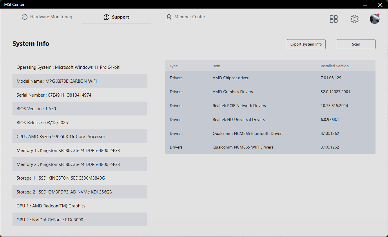 | Фірмове | MSI Center (MSI AI Engine, Game Highlights, MSI Companion, AI LAN Manager, Mystic Light, Super Charger +, System Diagnosis, True Color, Cooling Wizard, Live Update), MSI Display Kit |