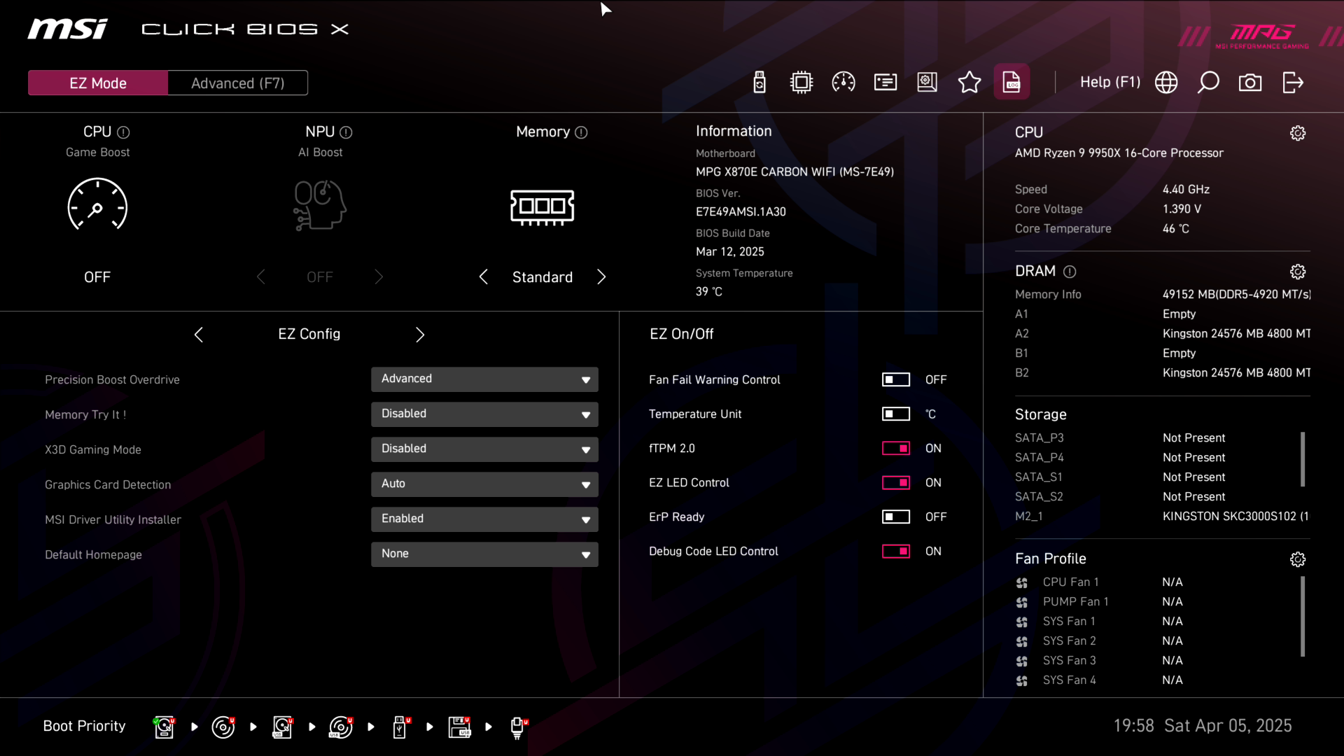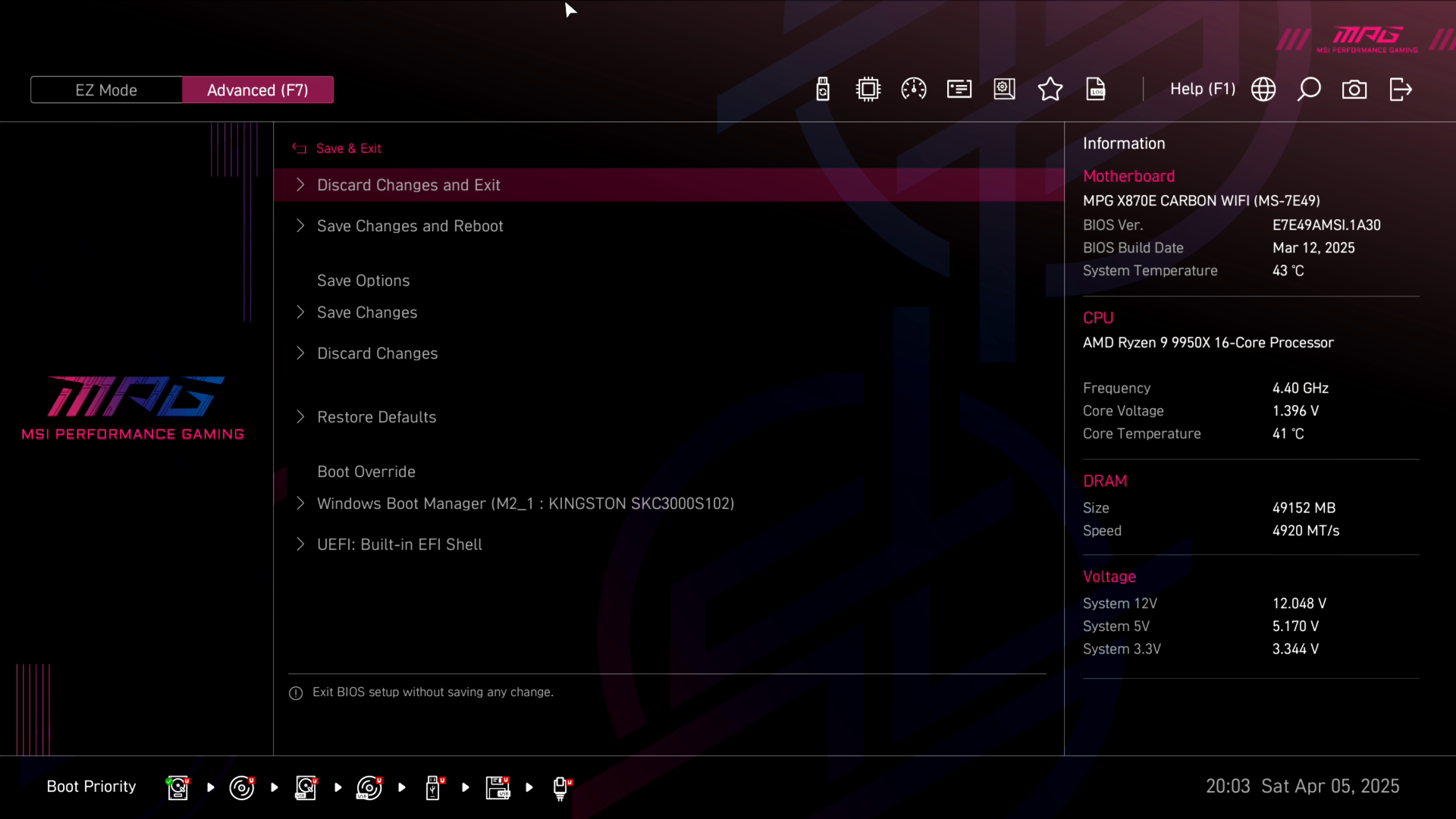 X870E Carbon WIFI керується MSI Click BIOS X. Його стилізовано під лінійку продуктів MSI Performance Gaming (MPG), а налаштування відображується в режимах EZ Mode та Advanced Mode.