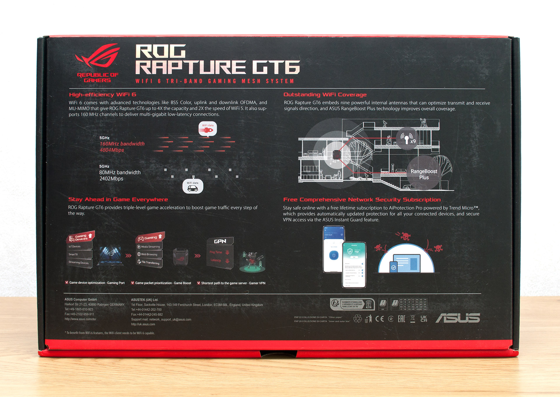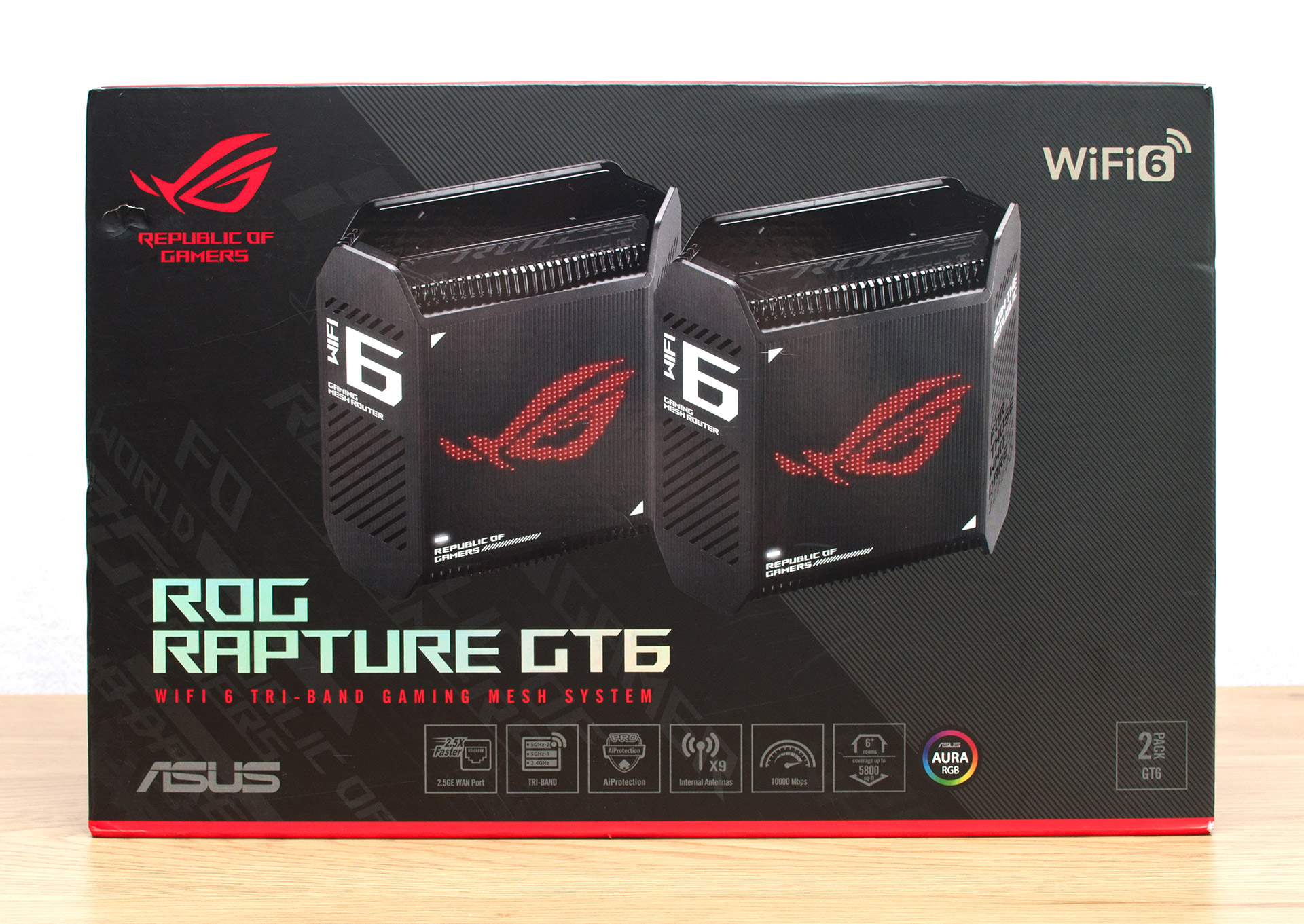 Картонна коробка, в якій постачається ASUS ROG Rapture GT6, має солідні габарити 425 x 280 x 140 мм та важить майже 4 кг, втім, не слід забувати, що всередині міститься пара пристроїв. Пакування оформлене в типовій для серії Republic Of Gamers червоно-чорній кольоровій гамі. На темному тлі лицьової поверхні нанесено зображення пристроїв і найменування моделі, а також наведені деякі особливості бездротових маршрутизаторів, серед яких слід зазначити можливість одночасної роботи в трьох частотних діапазонах, наявність мережевого порту 2.5 Gigabit Ethernet, вбудованого комплексу кіберзахисту AiProtection Pro та одразу дев’яти внутрішніх антен бездротових мереж для надійного і швидкого покриття Wi-Fi.
